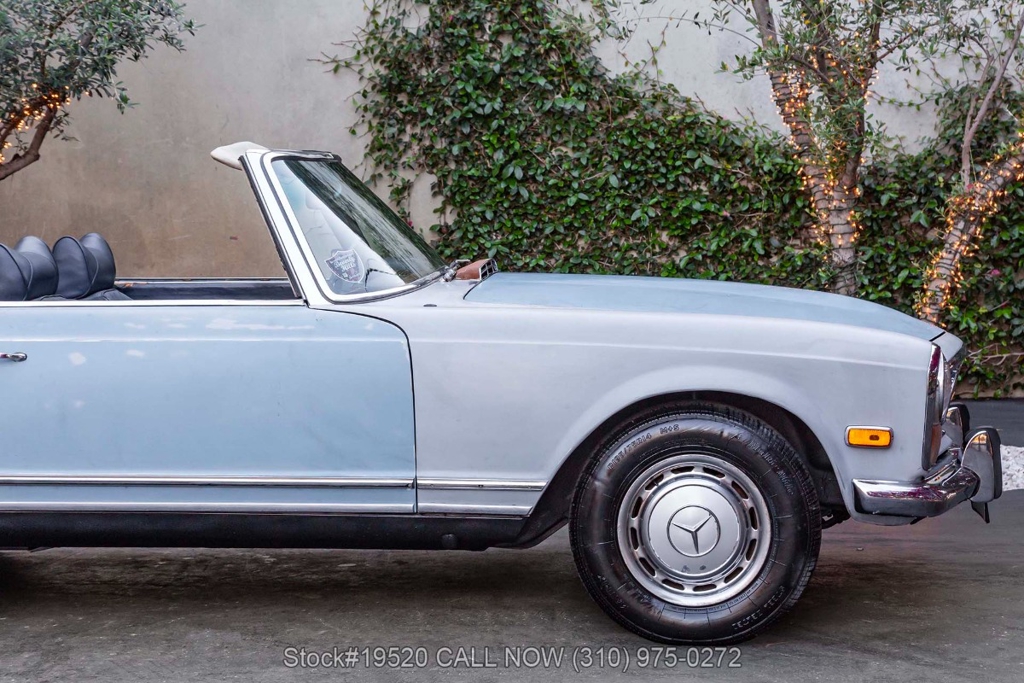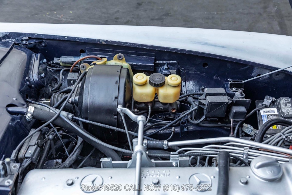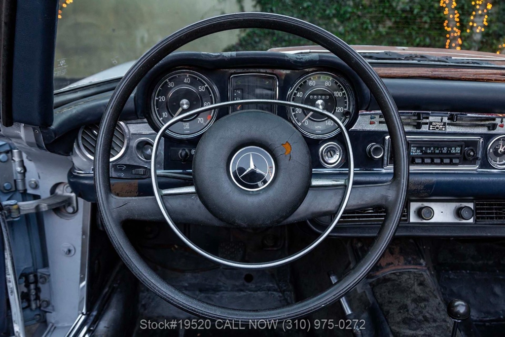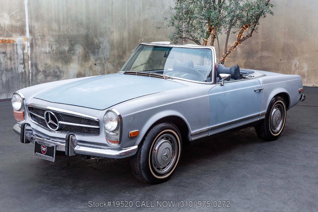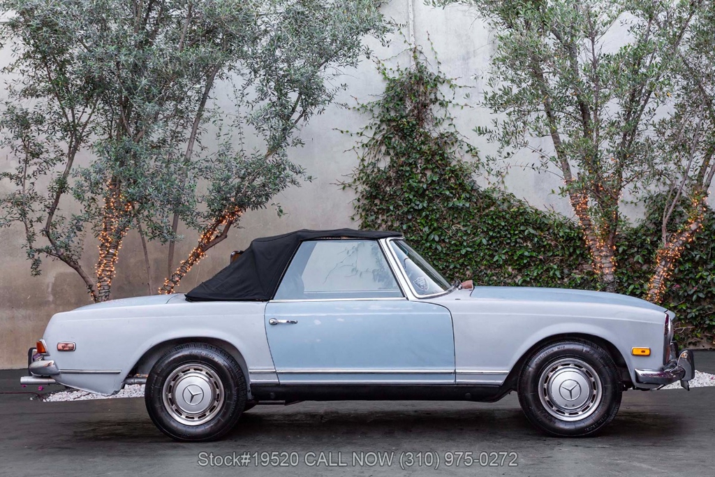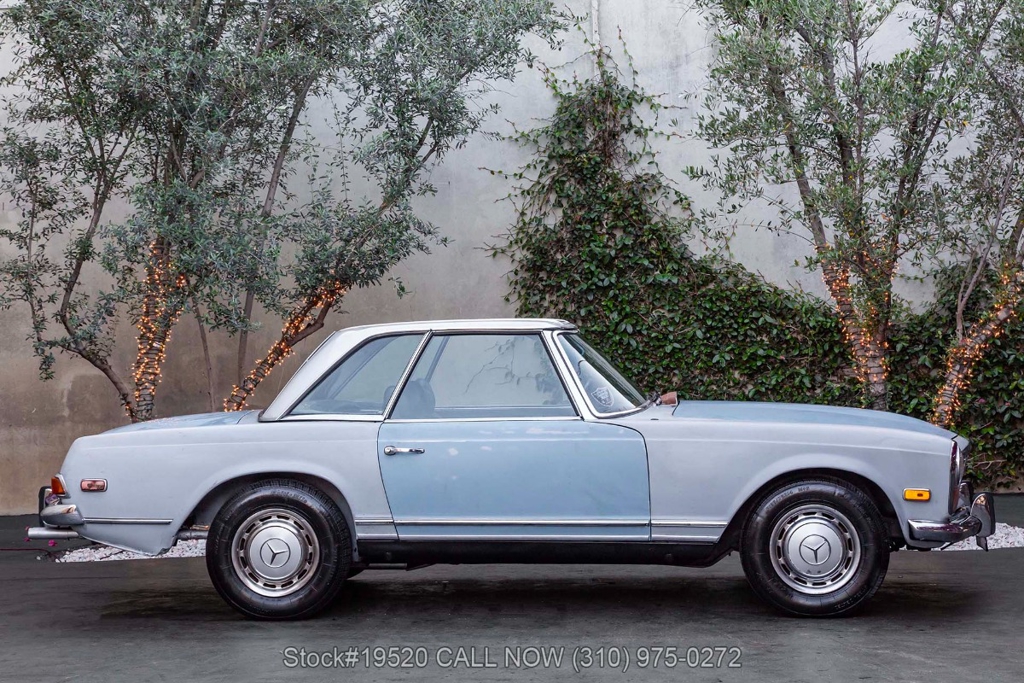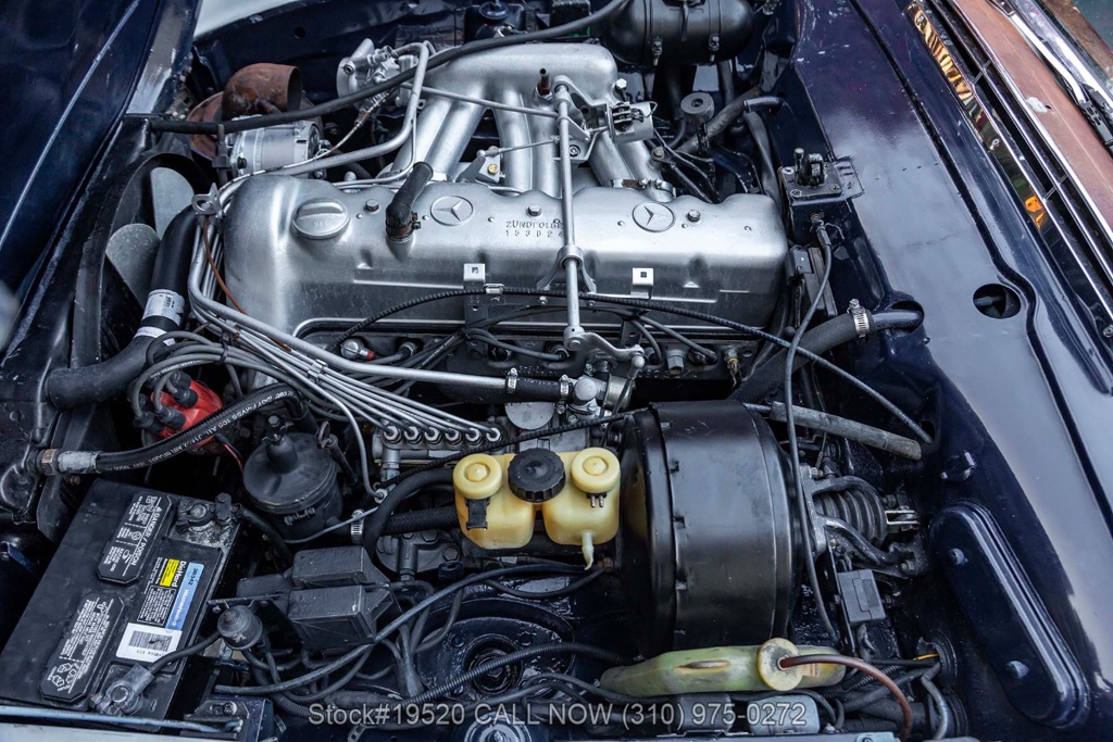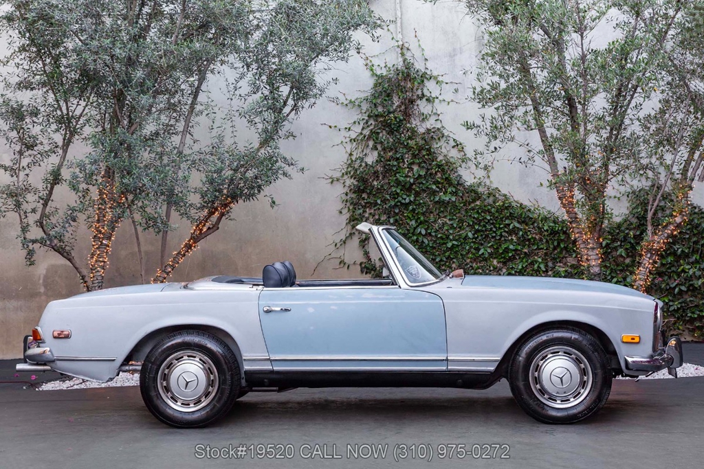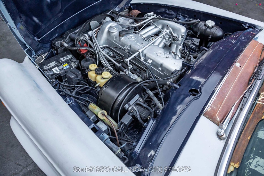 Under the hood, this classic Mercedes-Benz is equipped with a fuel-injected 2.8-Liter M130 inline-six engine paired with an automatic transmission. Additional equipment includes power steering, four-wheel disc brakes, a convertible soft top, a removable Pagoda hardtop, spot welds, dual exhaust outlets, chrome bumpers with overriders, a two-spoke steering wheel with horn, VDO instrumentation, Mercedes-Benz hubcaps, jack, and a full-size spare tire fitted in the trunk. Convenience features include air conditioning, a body-color dashboard, bucket seats with headrests, Blaupunkt radio, glove box, door pockets, manual crank windows, and a center console.