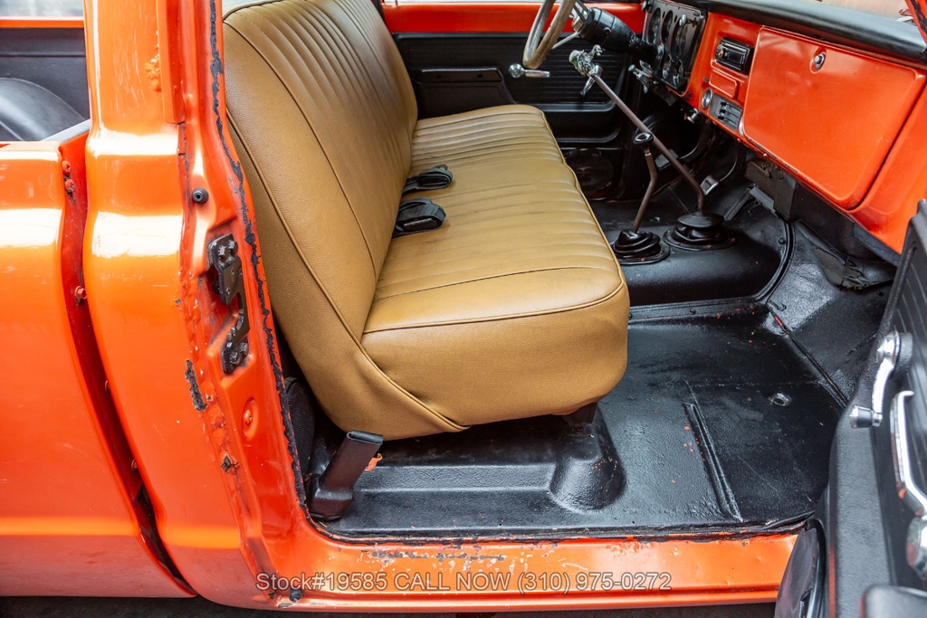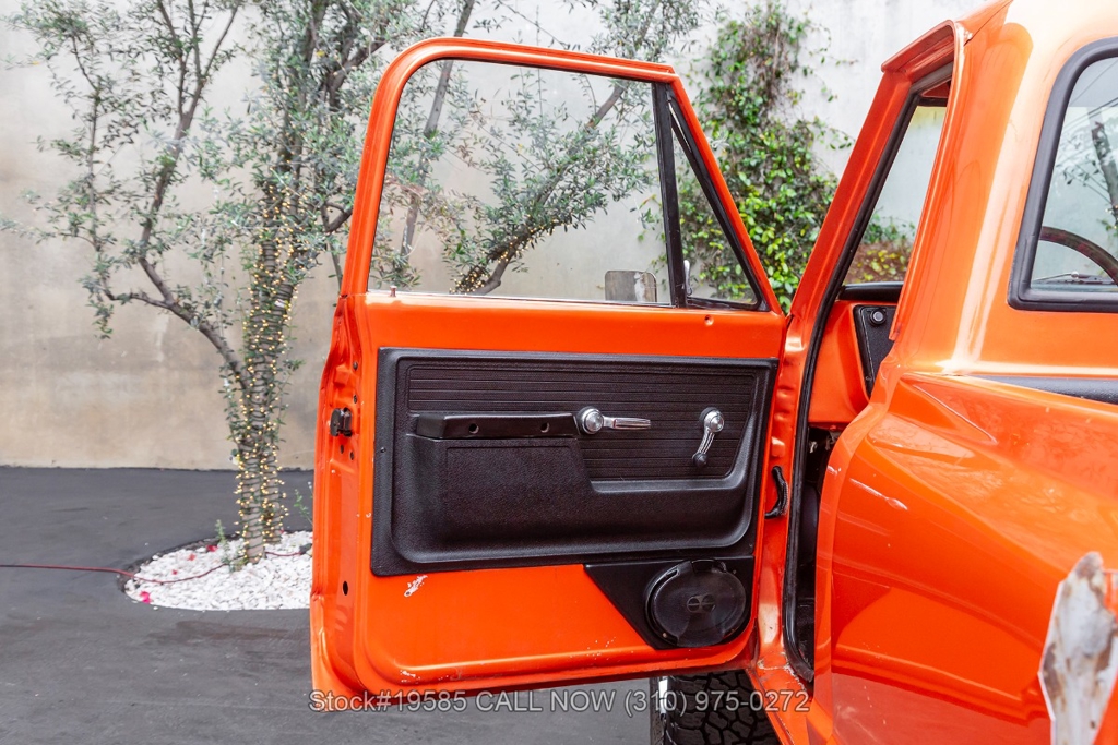 Introducing this 1972 GMC K2500 4x4 Pickup 4-Speed, a California truck finished in its factory color Red Orange paired with a Tan/Saddle interior. This classic pickup features a blacked-out treatment on the front grille and headlight surrounds, giving it a slightly more aggressive look compared to the original chrome trim while still maintaining its vintage character. The 1972 model year marked the final year of GMC's well-known Action Line body style, which was shared with Chevrolet trucks from 19671972 and is appreciated today for its simple, squared-off