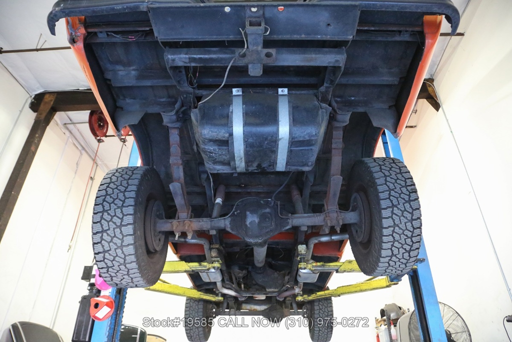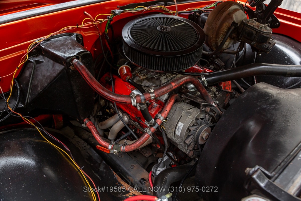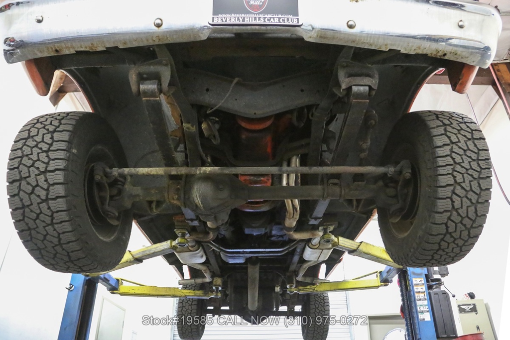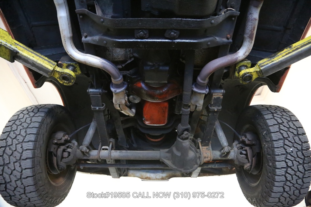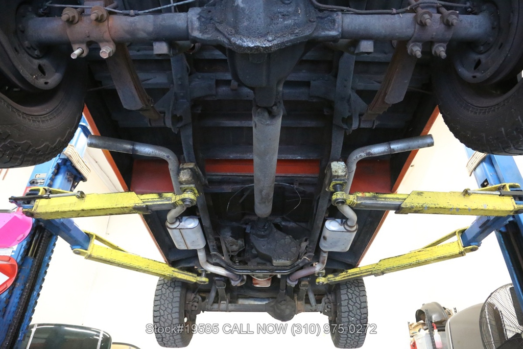 Power comes from a V8 engine paired with a 4-speed manual transmission and a floor-mounted shifter, along with a 4WD transfer case selector that reflects the truck's utilitarian purpose. Power steering helps make maneuvering easier, while front disc brakes offer improved stopping capability compared to earlier drum-brake setups. Exterior details include a chrome front bumper and steel wheels that give the truck a straightforward, work-ready appearance.