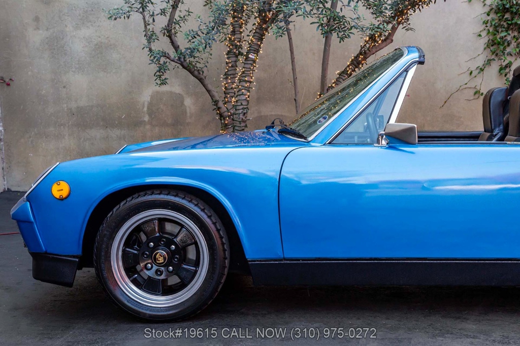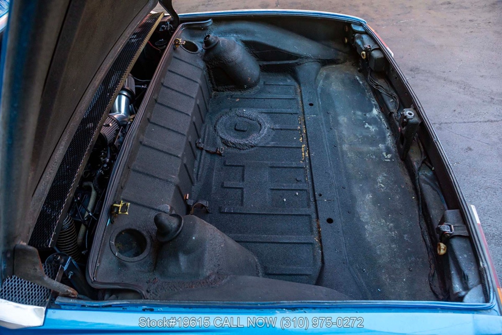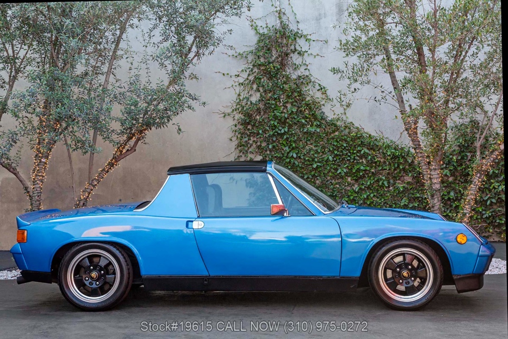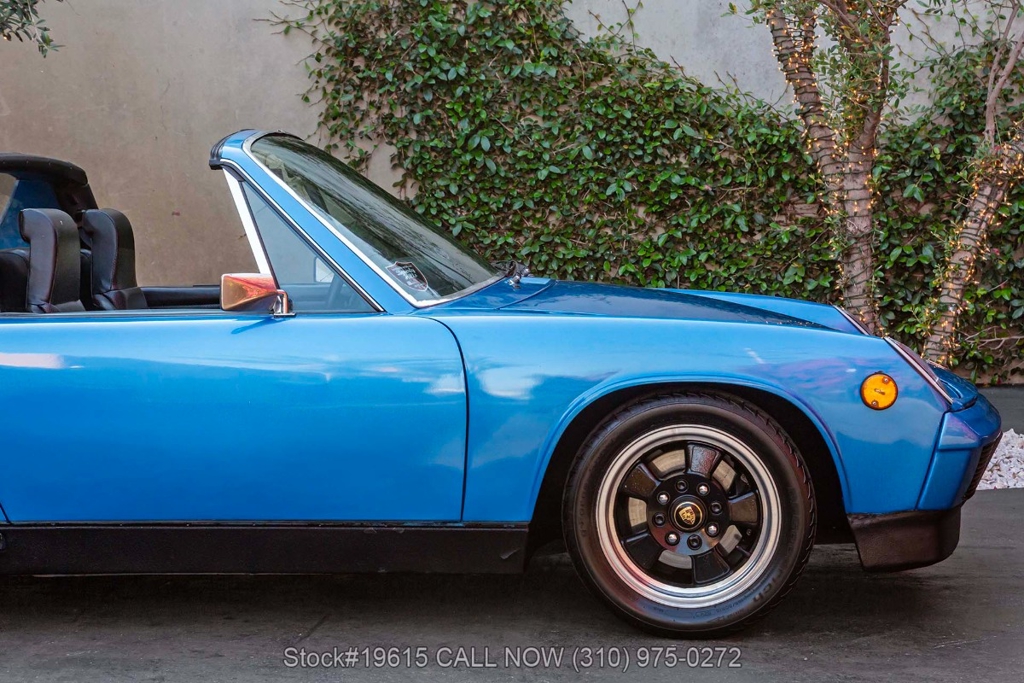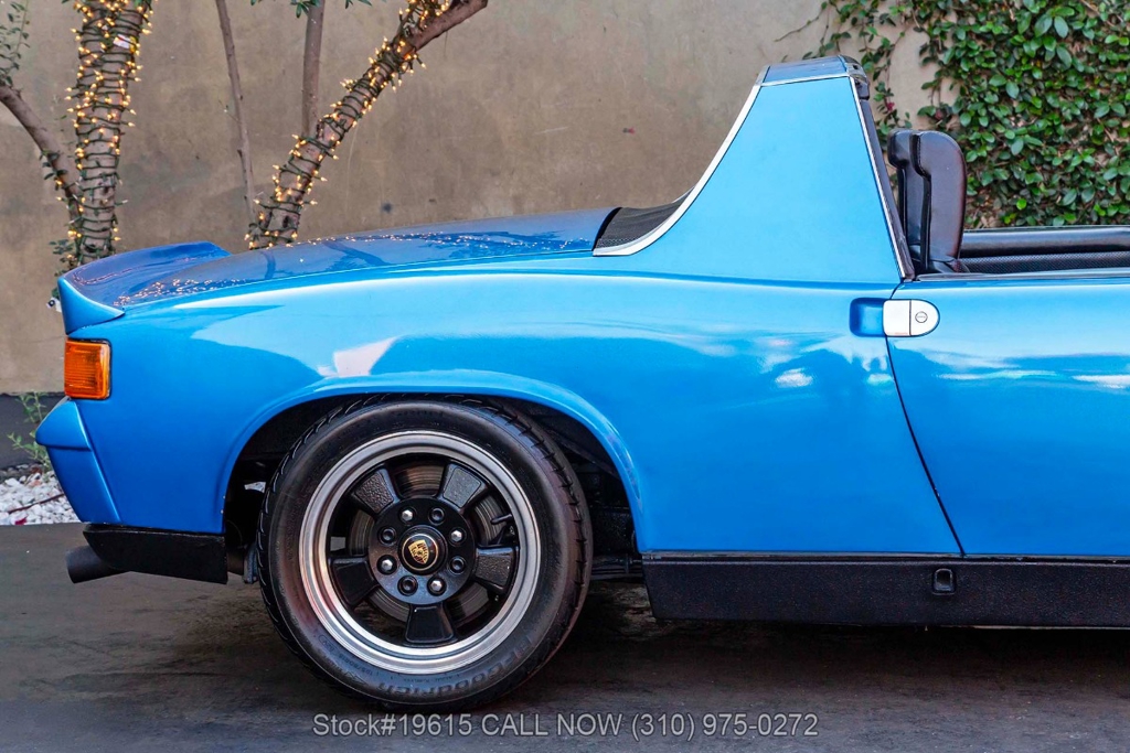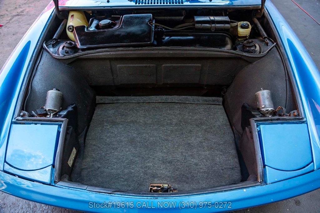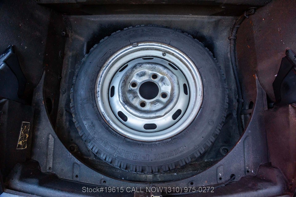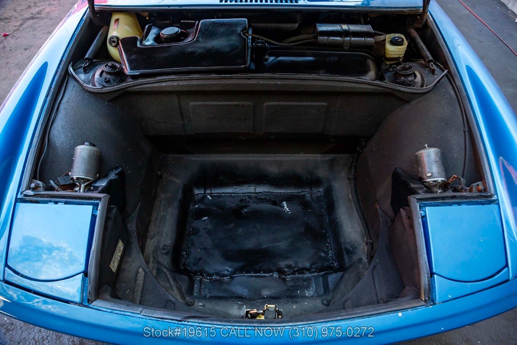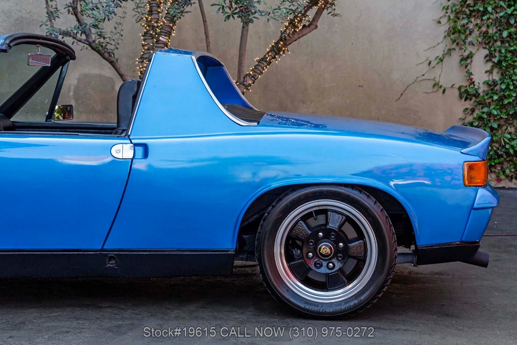 This 914 is equipped with a 5-speed manual transmission paired with a fuel-injected 2.0-liter flat-four engine. It features four-wheel disc brakes, dual exhaust outlets, and a rear trunk, along with the front storage compartment, offering practical space for a compact sports car. The exterior is further accented by chrome trim and 15-inch 5-spoke alloy wheels fitted with BFGoodrich tires, while a full-size spare is housed in the front trunk. The removable targa top provides the option for open-air driving when desired.