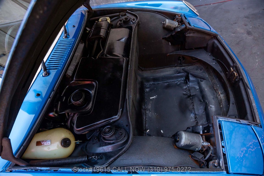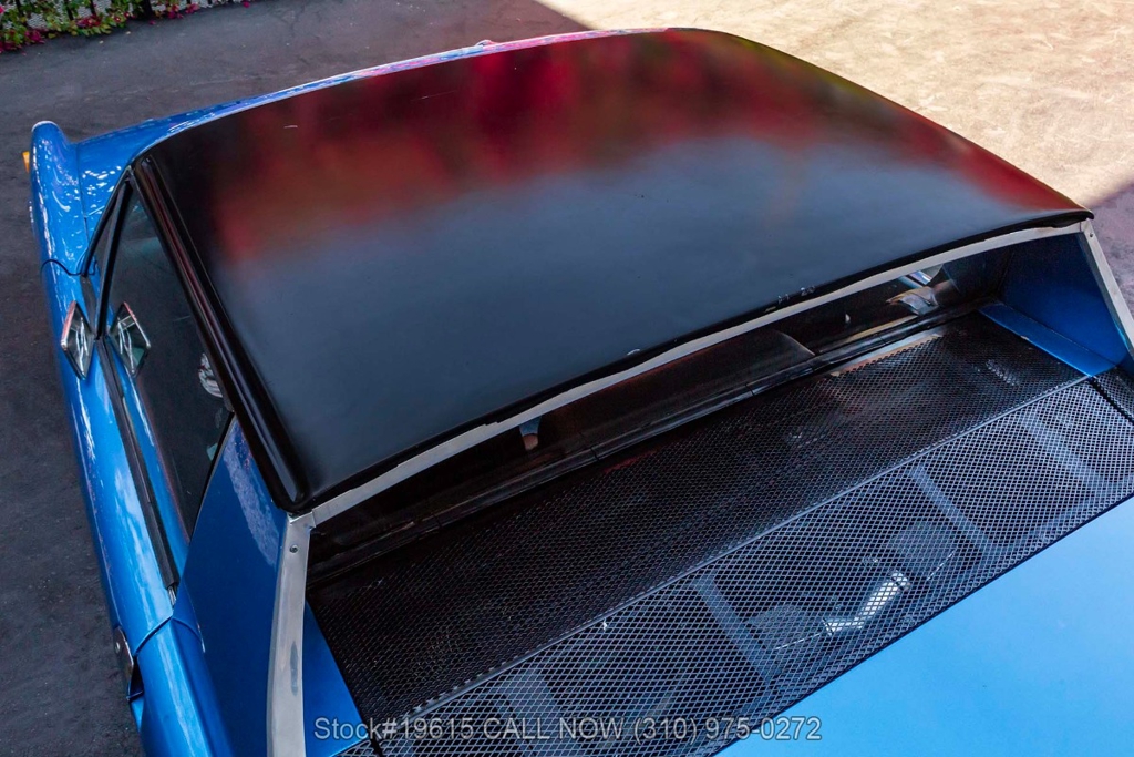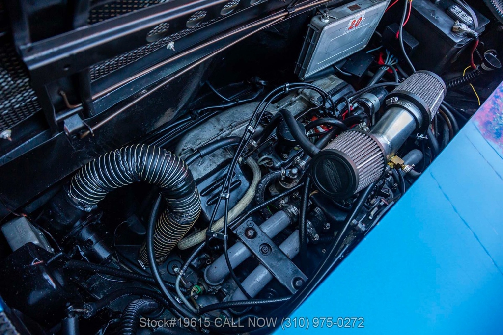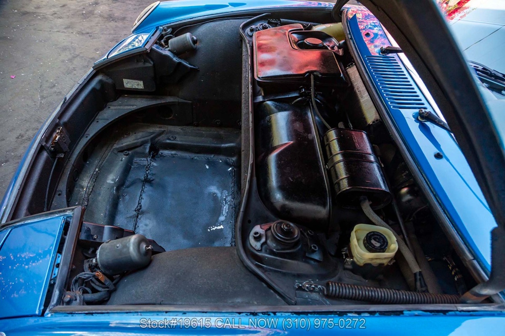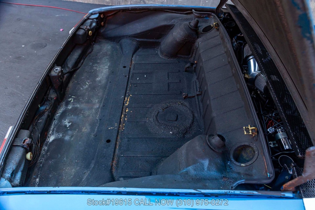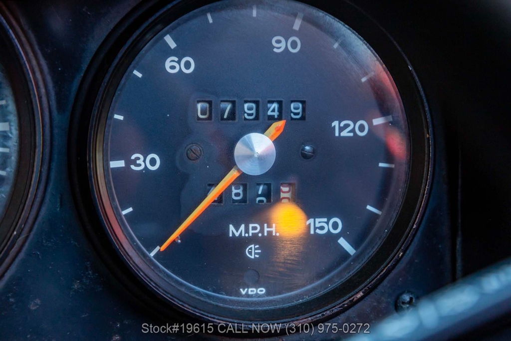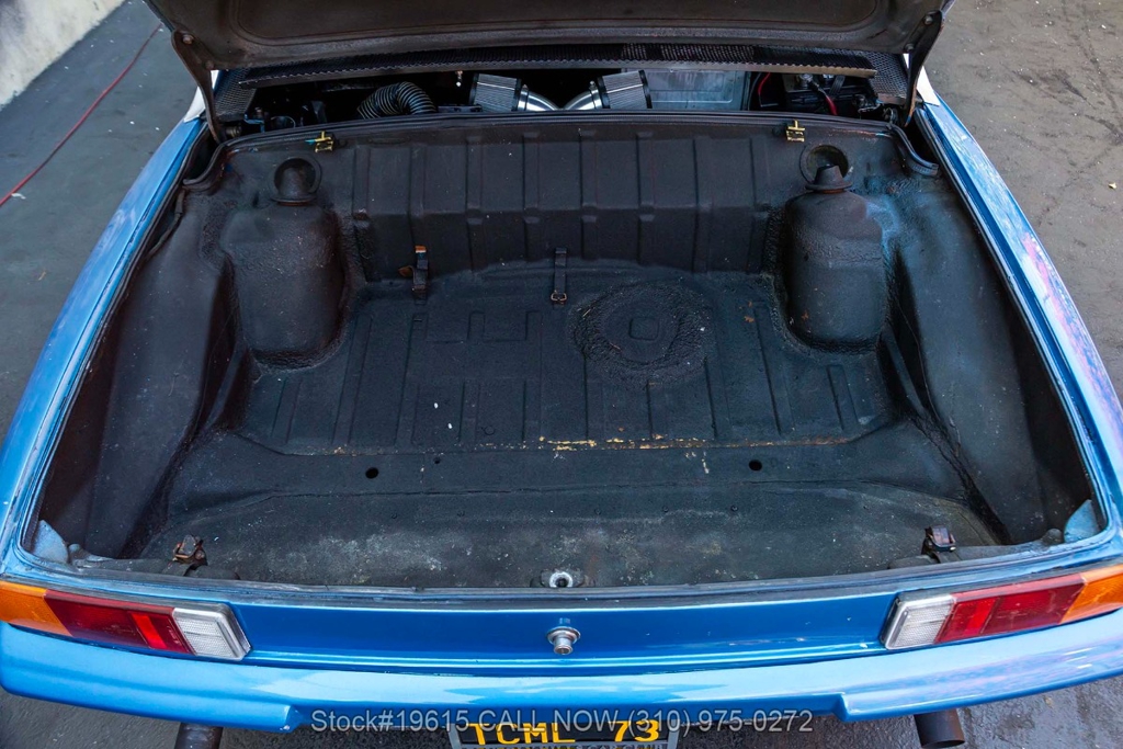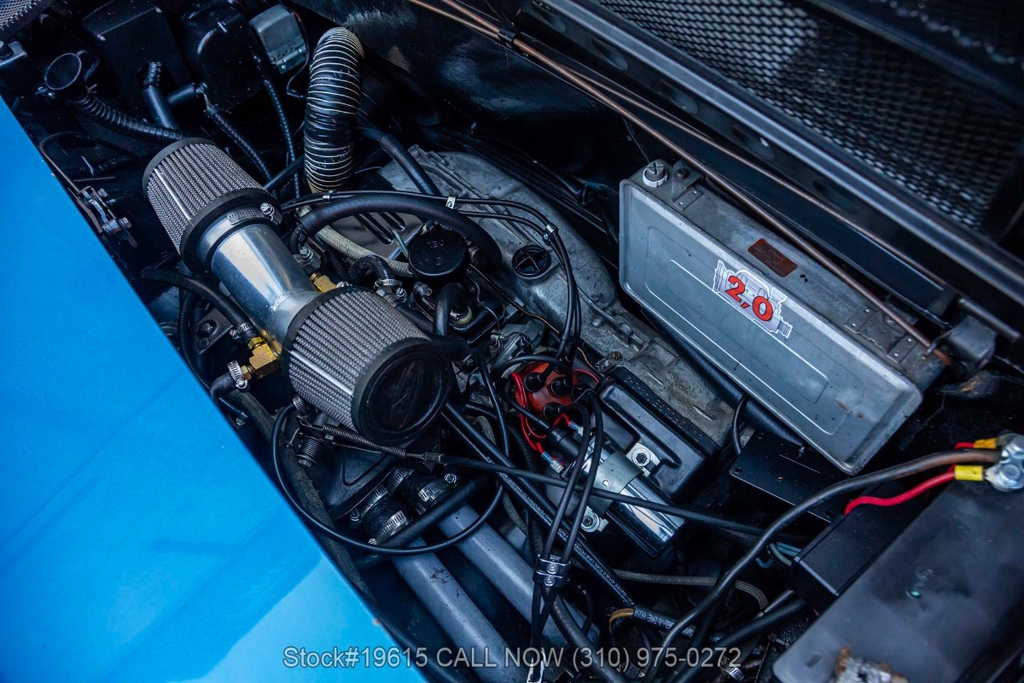 This 914 is equipped with a 5-speed manual transmission paired with a fuel-injected 2.0-liter flat-four engine. It features four-wheel disc brakes, dual exhaust outlets, and a rear trunk, along with the front storage compartment, offering practical space for a compact sports car. The exterior is further accented by chrome trim and 15-inch 5-spoke alloy wheels fitted with BFGoodrich tires, while a full-size spare is housed in the front trunk. The removable targa top provides the option for open-air driving when desired.