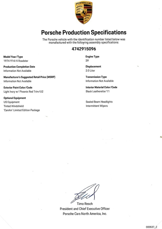 Introducing this limited-edition 1974 Porsche 914 2.0 LE Can Am Creamsicle Roadster featured with matching numbers (Porsche Production Specification digital copy included). Finished in its factory two-tone color Light Ivory and Phoenix Red complemented with a Brown interior.