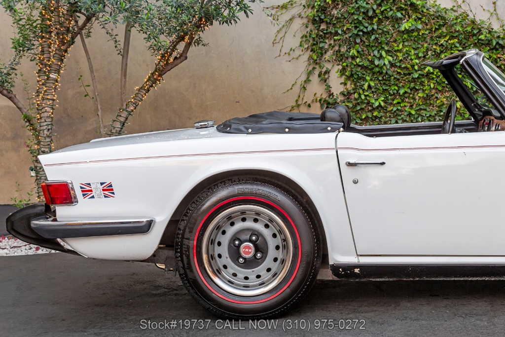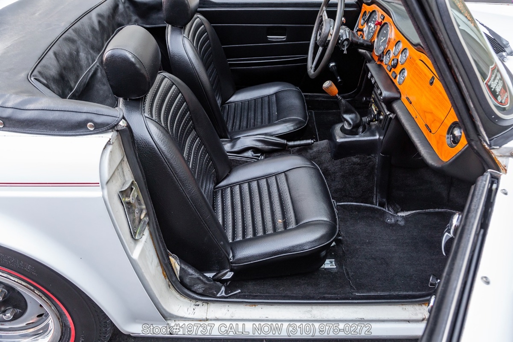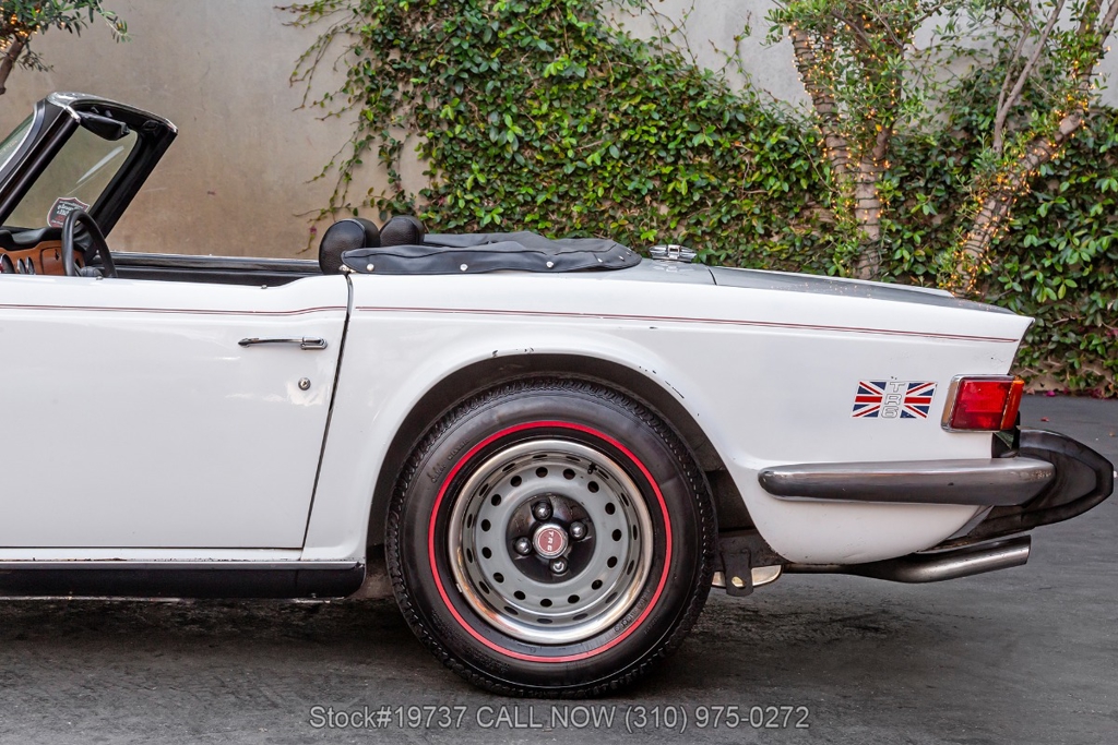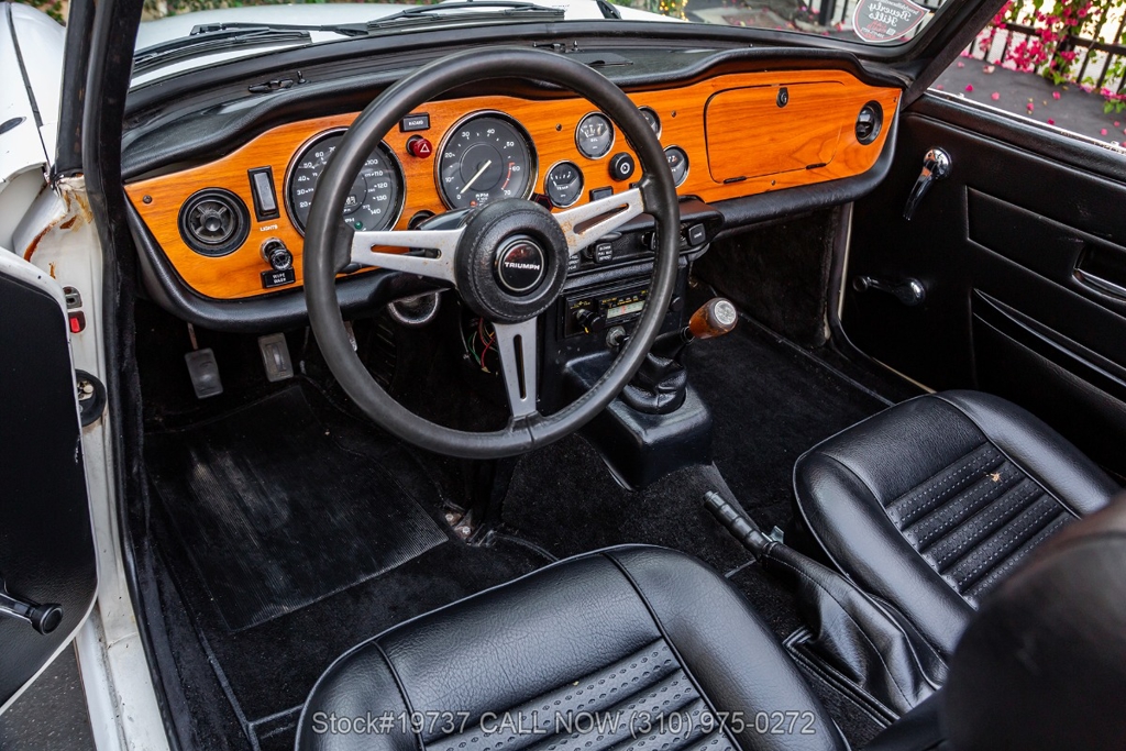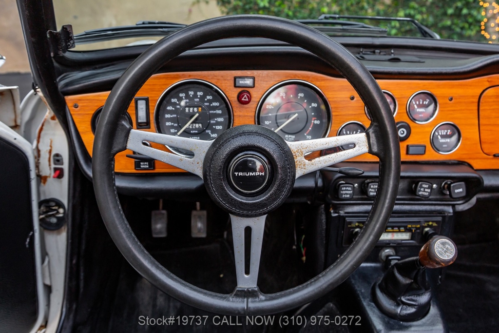 Inside, you'll find Smiths instrumentation, a wooden dashboard, and a 3-spoke steering wheel, all combining traditional craftsmanship with driver-focused simplicity. Other equipment includes bucket seats, chrome bumpers, AM/FM radio, and map pockets. The car rides on Coker Classic red-line tires mounted to 15-inch factory-style perforated steel wheels with TR6-branded center caps, and a full-size spare is neatly stowed in the trunk.