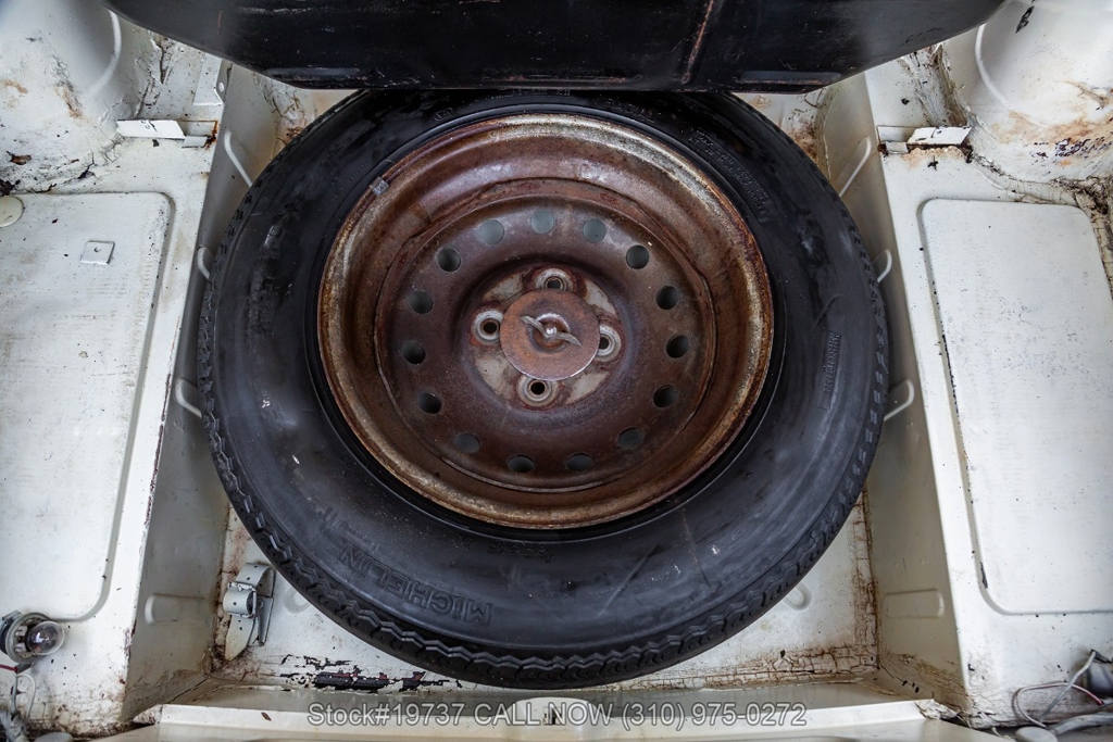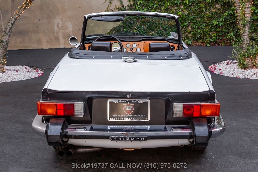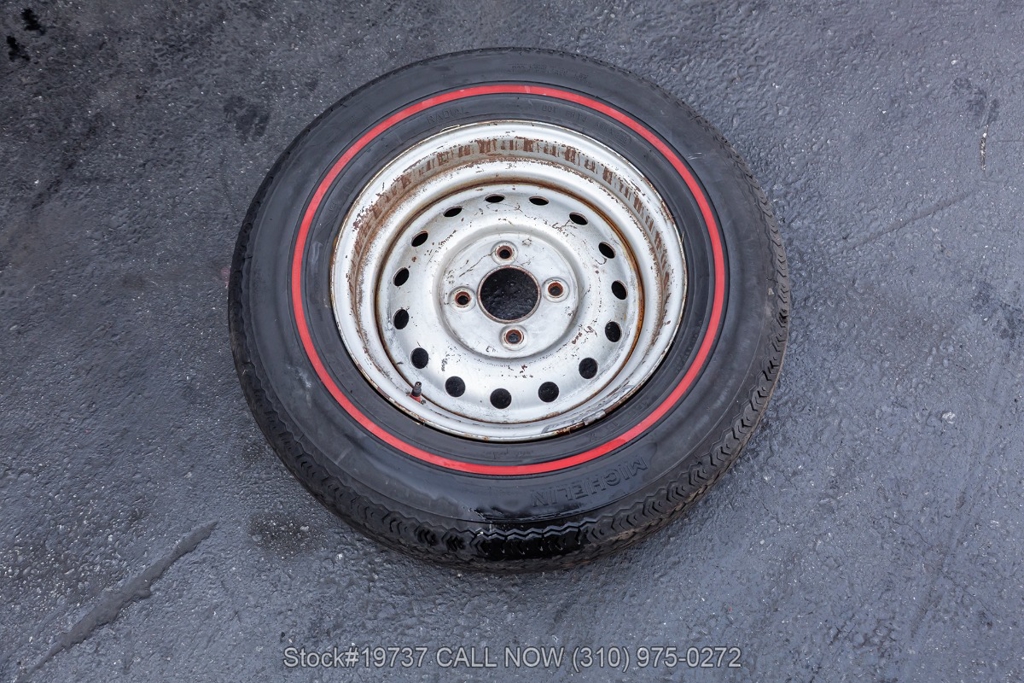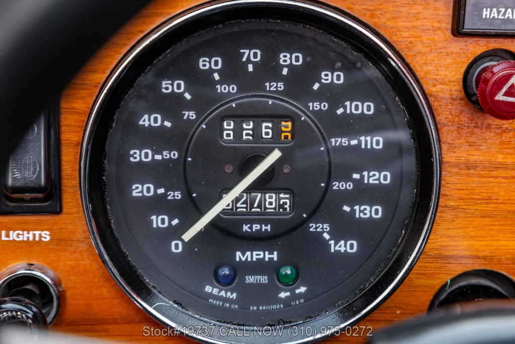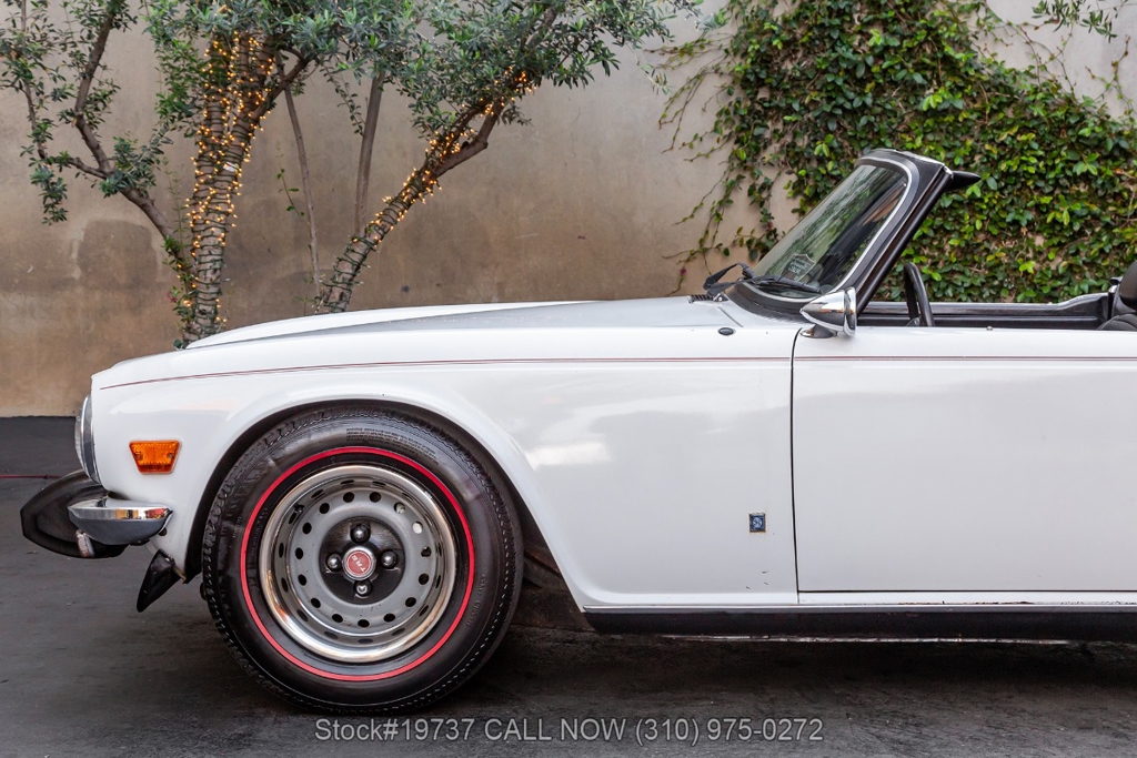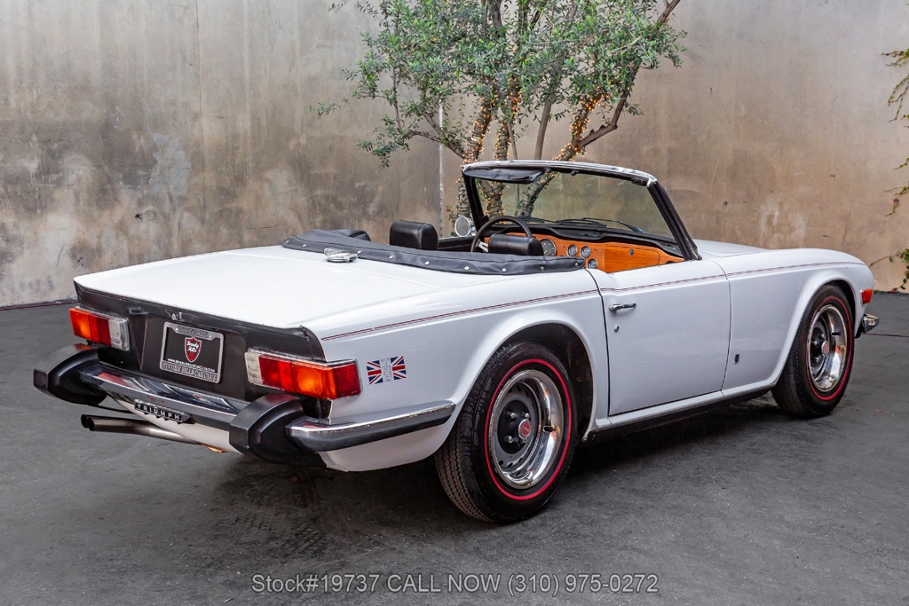 Inside, you'll find Smiths instrumentation, a wooden dashboard, and a 3-spoke steering wheel, all combining traditional craftsmanship with driver-focused simplicity. Other equipment includes bucket seats, chrome bumpers, AM/FM radio, and map pockets. The car rides on Coker Classic red-line tires mounted to 15-inch factory-style perforated steel wheels with TR6-branded center caps, and a full-size spare is neatly stowed in the trunk.
