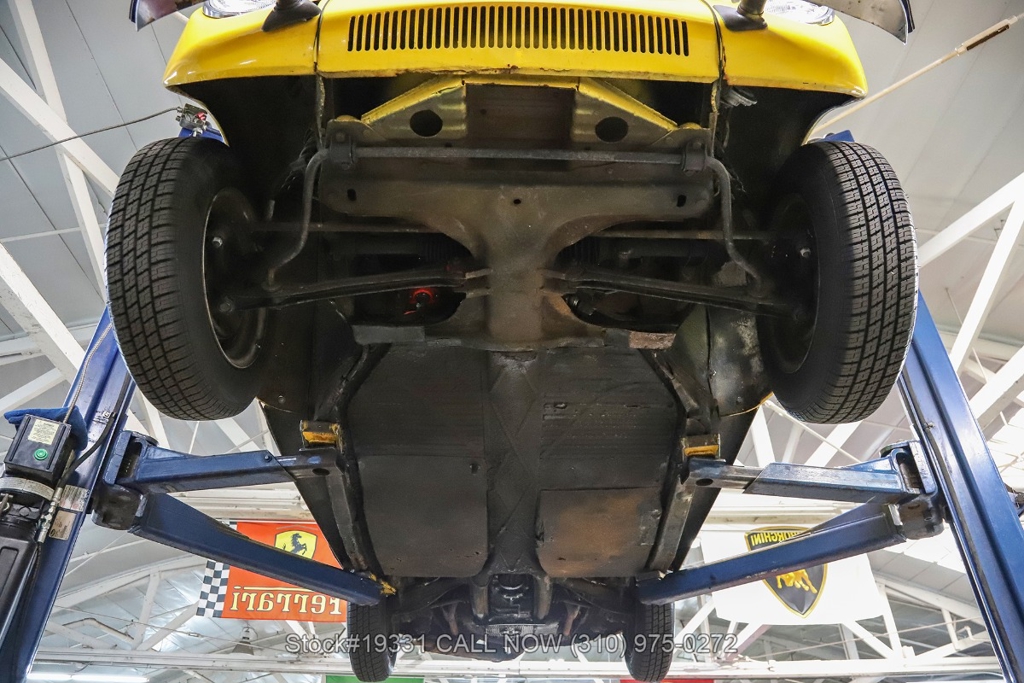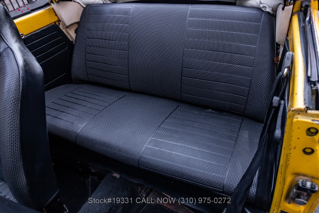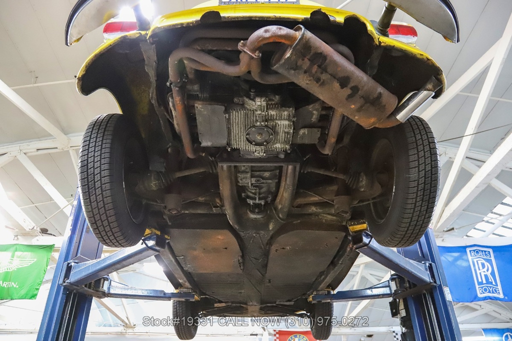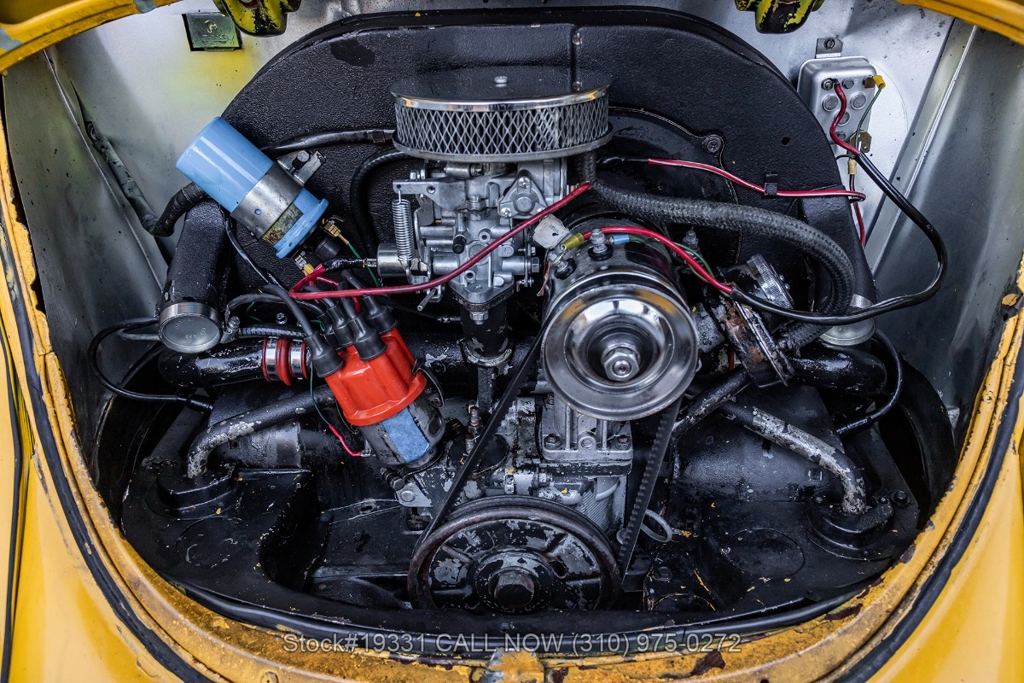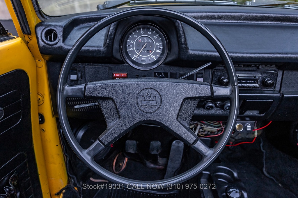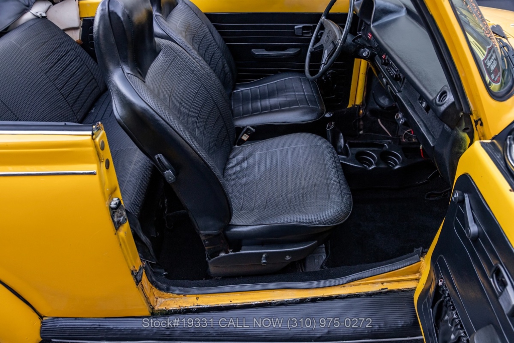 Power comes from an air-cooled flat-four engine paired with a 4-speed manual transmission and enhanced by an EMPI single-barrel carburetor. Additional equipment includes a full drum braking system, classic VDO instrumentation, a floor-mounted shifter, black convertible soft top, chrome trim, chrome bumpers, chrome-ring headlights, single exhaust outlet, fender-mounted turn signal indicators, a 4-spoke steering wheel, Nexen tires, 15-inch steel wheels, and a full-size spare tire stored in the front trunk. Convenience features include high-back bucket seats, dual-side rearview mirrors, vent windows, a retro-style radio, and a fender-mounted antenna.