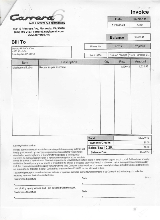 We require that you contact the Seller within twenty-four (24) hours, one (1) day, of this auction closing. A non-refundable deposit of ten percent (10%) is due within forty-eight (48) hours, two (2) days, of this auction closing and can only be paid to Seller by Cash (in person), Cashier's Check, Money Order, or some other form of certified transfer in US dollars. Full payment of the final price is due within seven (7) days of this auction closing and can only be paid to Beverly Hills Car Club by Cash (in person), Cashier's Check, Money Order or certified funds in US dollars. Please be advised that you are responsible for all fees associated with the purchase of the Automobile including but not limited to taxes and registration.