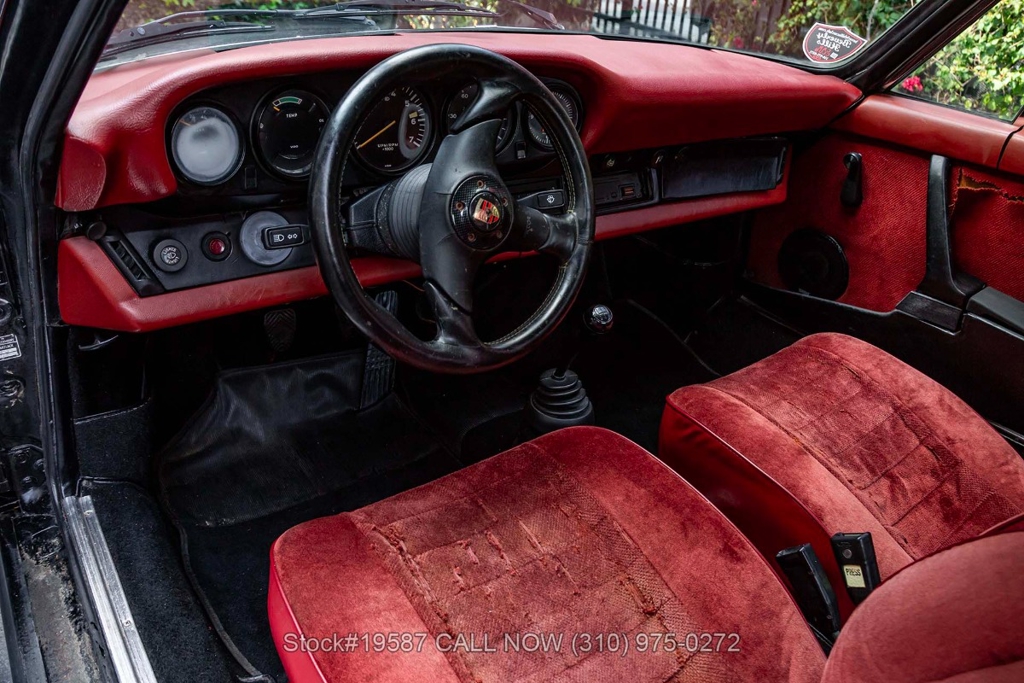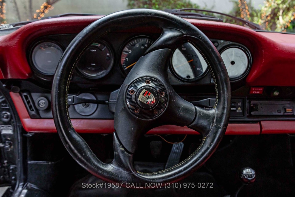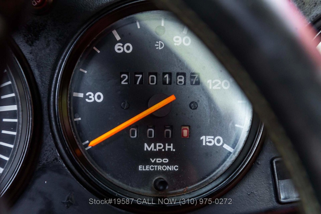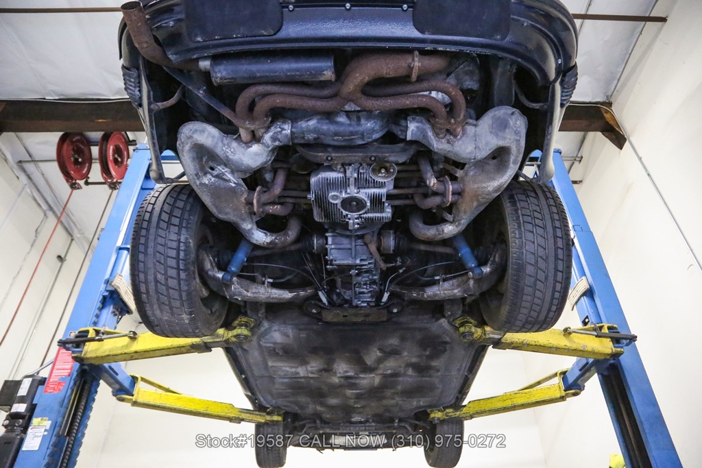 Equipped with a 2.0-liter flat-four engine paired with a 923 five-speed manual transaxle. Equipment includes four-wheel disc brakes, VDO instrumentation, single exhaust outlet, rear bumperettes, chrome trim, an aftermarket three-spoke Victor sport steering wheel, Yokohama tires, and 16-inch Fuchs-style wheels. Also included are a space-saver spare tire and a factory Bilstein side jack.
