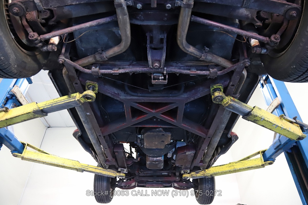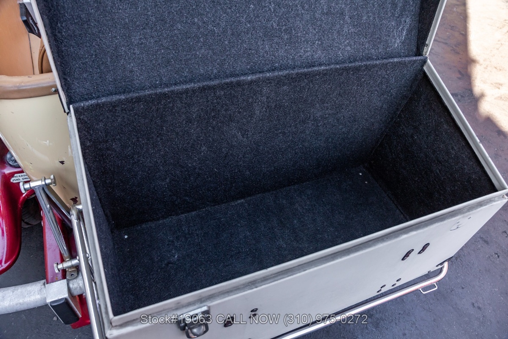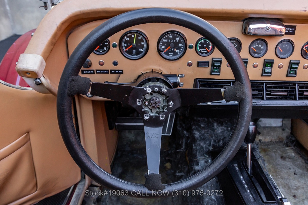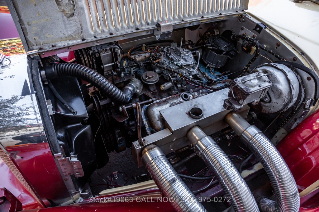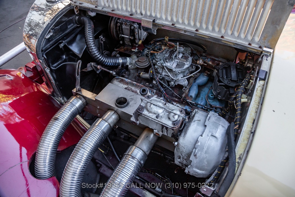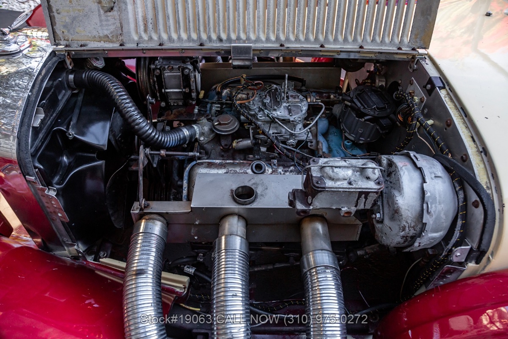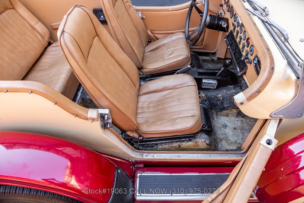 Equipped with an automatic transmission, V8 engine, four-wheel disc brakes, 4-barrel carburetor, VDO instrumentation, a 3-spoke steering wheel, and 15-inch wire wheels. The detachable hard top allows for open-air when desired, while the side exhaust pipes add a touch of sportiness to its classic design. Practical elements such as map pockets, side curtains, and a rear luggage rack enhance the functionality of this vehicle, making it as practical as it is stylish.