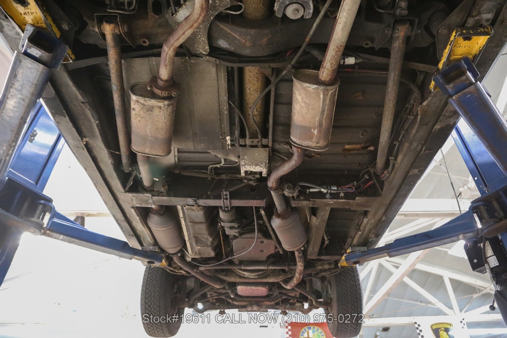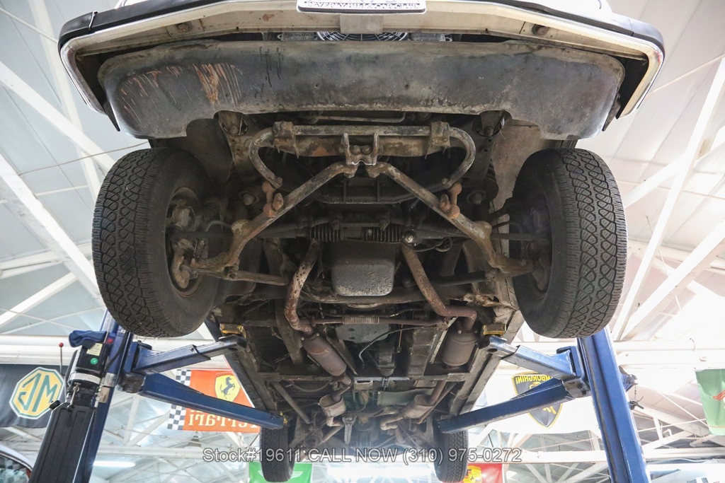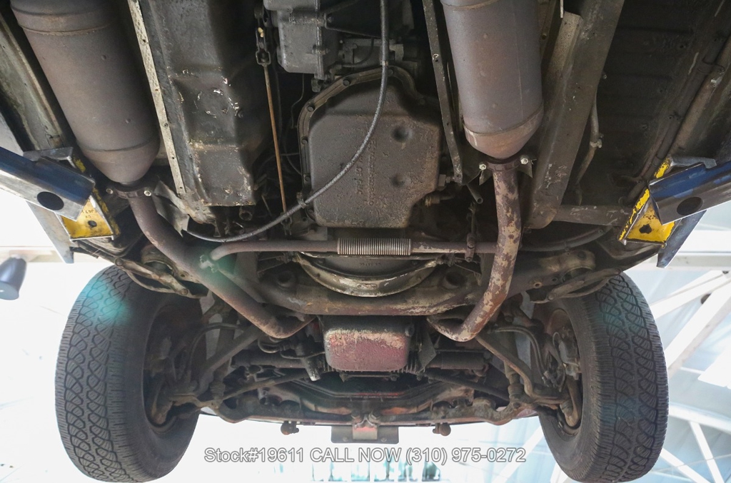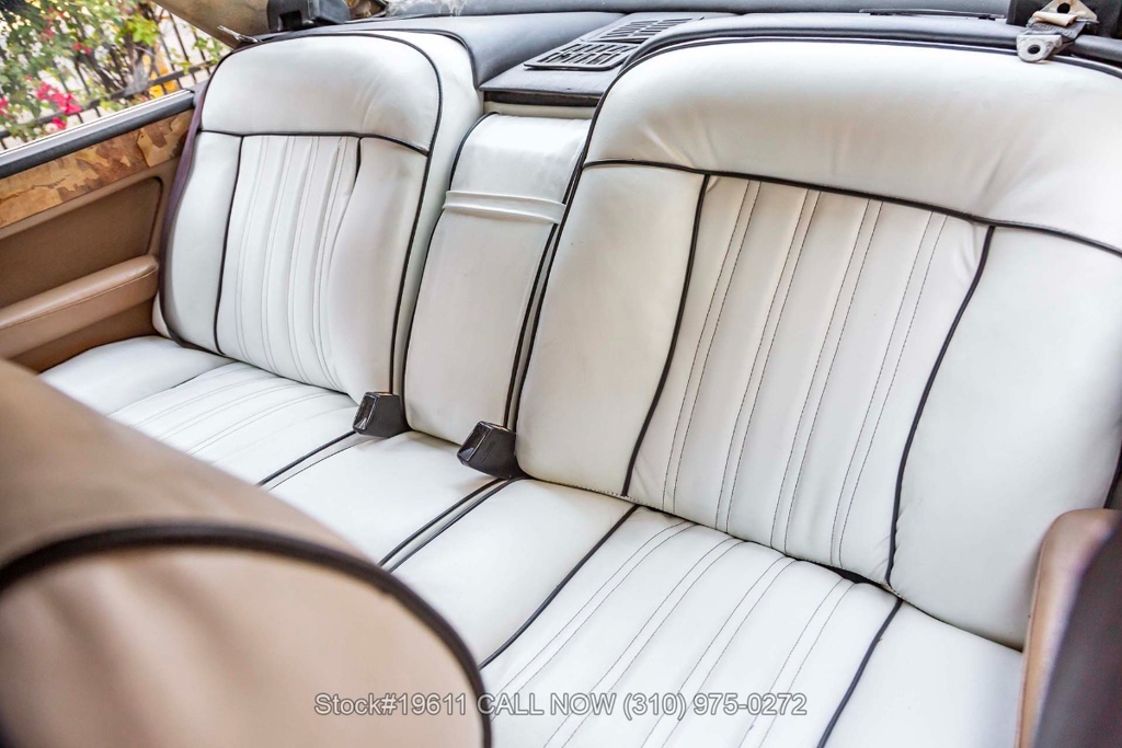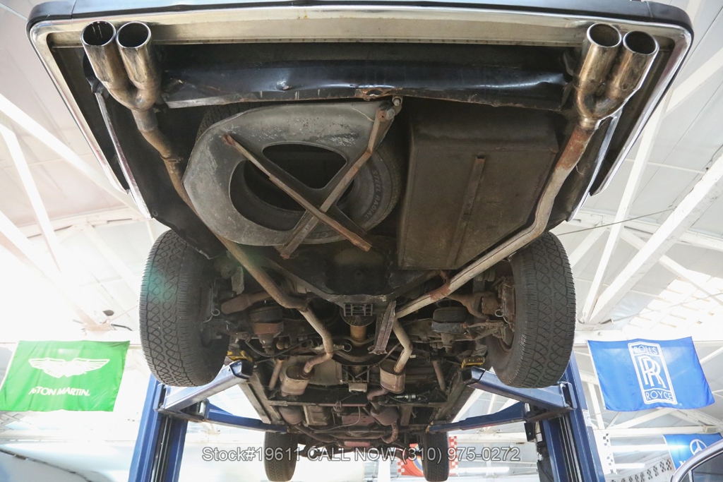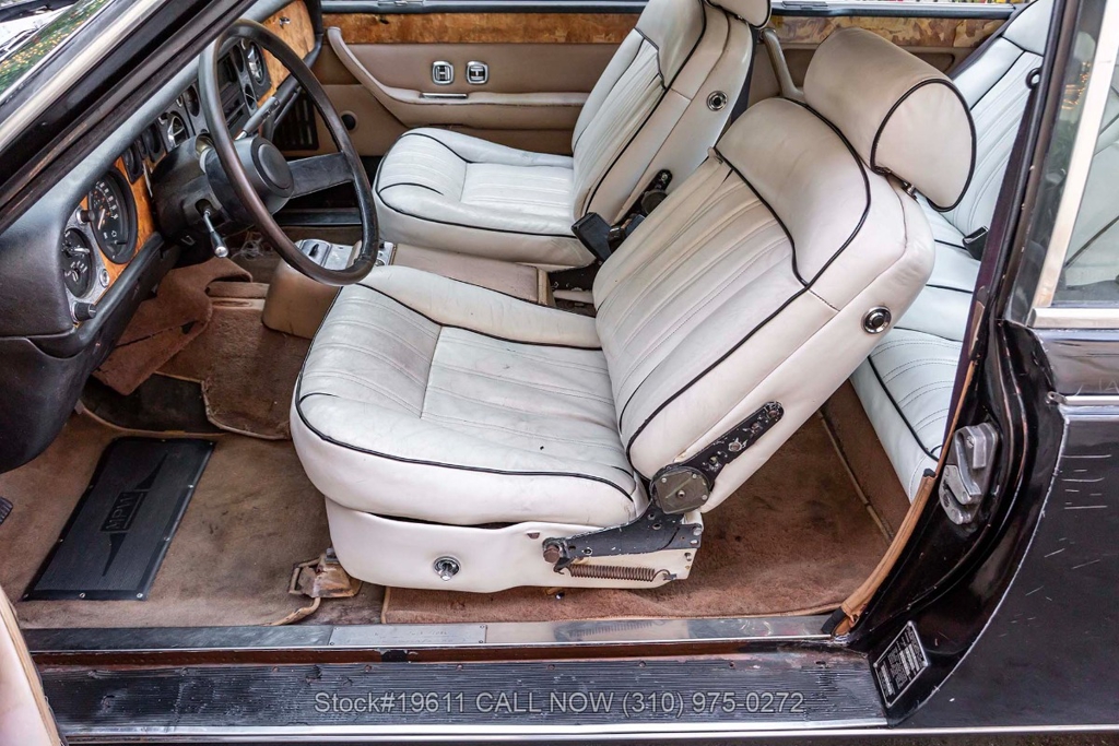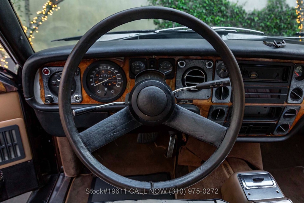 Equipment includes a 6.75-liter V8 paired with an automatic transmission with steering column control, twin SU carburetor fuel system, power steering, quad exhaust outlets, and four-wheel disc brakes. Additional features include quad headlamps, chrome trim, chrome bumpers with rubber guards, Smiths/Jaeger/Lucas instrumentation, and 15-inch steel wheels fitted with Custom Built Radial Wide Trac Touring Tyre tires from Vogue Tyre. Interior amenities include air conditioning, power windows, power-adjustable front seats, cruise control, driver-side mirror, a center console, and a two-spoke steering wheel.