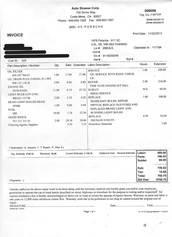 Disclaimer: ALL VEHICLES ARE SOLD AS IS, WITH ALL FAULTS AND WITHOUT WARRANTY, EXPRESS OR IMPLIED, ORAL OR WRITTEN, ASSURANCES OR GUARANTEES. The Automobile is non-certified which is offered in pre-owned condition that is being auctioned without refund or exchange options. ANY and ALL representations made in the description above are made to the best of the Seller�s knowledge, however, due to divergent notions of condition and quality, you are encouraged rely on your own physical inspection of the Automobile and not the description above. Furthermore, due to the likelihood for latent and patent defects within and/or on a pre-owned automobile, the Seller cannot guarantee that all issues are disclosed in the description above. Despite the Seller�s best efforts, it is inevitable that some inaccuracies may occasionally be present in the description. Additionally the photographs of the Automobile are of the actual vehicle up for auction, however, the color and general appearance my appear differently based on your monitor and color settings. You are hereby advised that it is your responsibility to physically inspect the Automobile prior to completing the sale. Therefore, any claims or disputes as a result of or relate to failure to disclose or misrepresentation are hereby waived by you. The Seller is willing to show you the V.I.N, casting, and/or stamping numbers on the Automobile, however, the Seller cannot guarantee or does not make any assurances that the Automobile and/or its components are in fact original. As aforementioned, ANY representation, including originality, are made to the best of the Seller�s knowledge. The mileage of the Automobile listed above in the description is from the Automobile, however, you should understand that there is a possibility that mileage is not correctly listed on the Automobile due to the pre-owned nature of it. Therefore, unless the Seller expressly represents that the Automobile�s mileage is guaranteed, the Seller does not guarantee the mileage on the Automobile. This agreement is governed by the laws of the State of California, USA. You hereby consent to the exclusive personal jurisdiction and venue of courts in Los Angeles County, California, USA in all disputes arising out of or resulting from this auction. A bid within a jurisdiction that does not give effect to all provisions of these terms, conditions and notices is still valid to the extent these terms, conditions and notices are valid in that jurisdiction. You agree that if any part of these terms, conditions and notices is found to be unenforceable, the remainder of these terms, conditions and notices will remain in full force and effect. You agree to indemnify, defend, and hold harmless Seller from and against any and all claims, proceedings, damages, injuries, losses, costs, and expenses (including reasonable attorney�s fees), relating to the purchase of the Automobile that leads to any claim against us by a third-party, regardless of the nature of the cause of action or claim. This agreement constitutes the entire agreement between you and the seller with respect to this auction and it supersedes all prior or contemporaneous communications and proposals, whether electronic, oral or written. Seller reserves the right to change these terms, conditions and notices at any time without notice. Any rights not expressly granted herein are reserved by Seller.