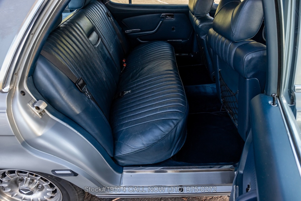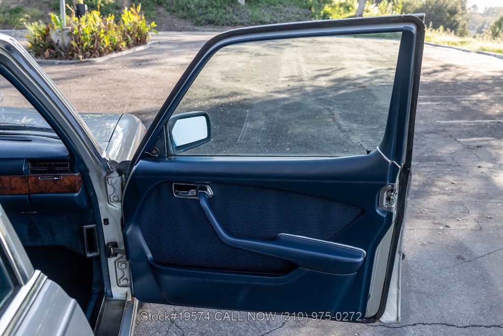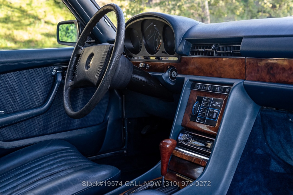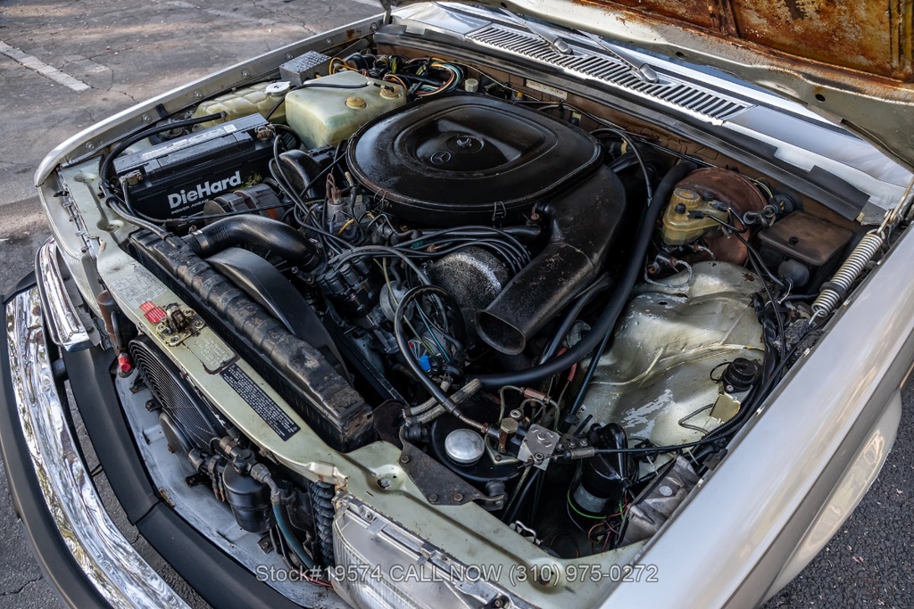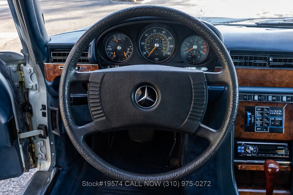 Inside, the cabin features air conditioning, bucket seats with head restraints, power windows, dual-side rearview mirrors, an analog clock, door pockets, glove box, center console, Alpine radio, and a fender-mounted antenna. The burl walnut wood trim provides a classic touch that reflects the craftsmanship Mercedes-Benz was known for during the late 1970s.