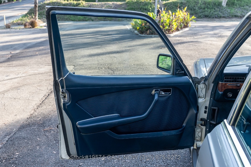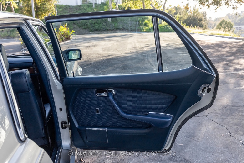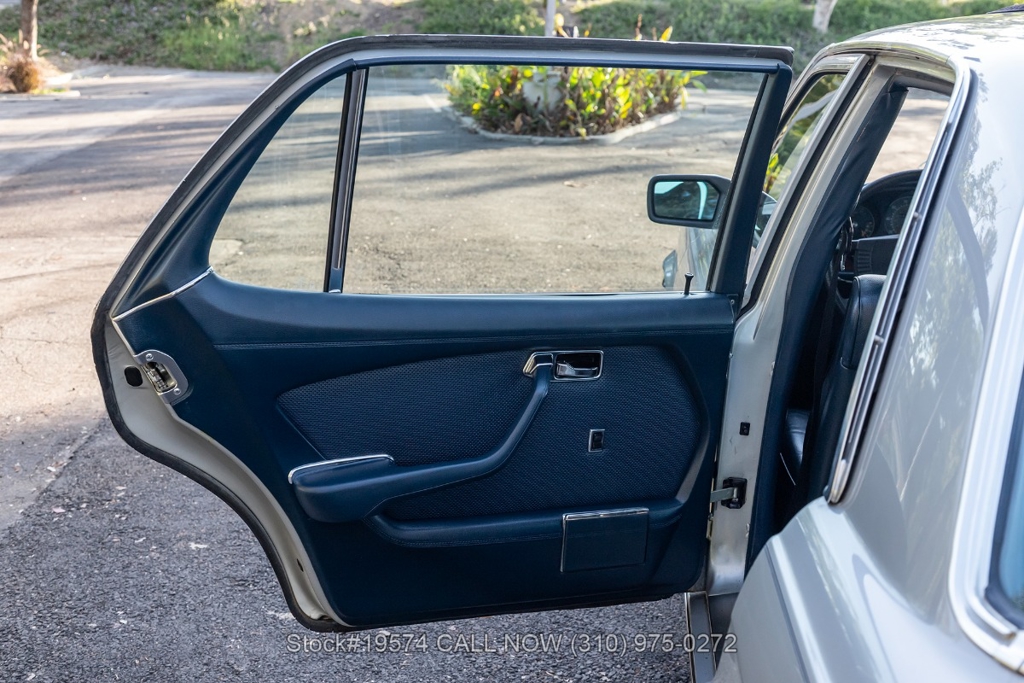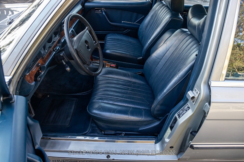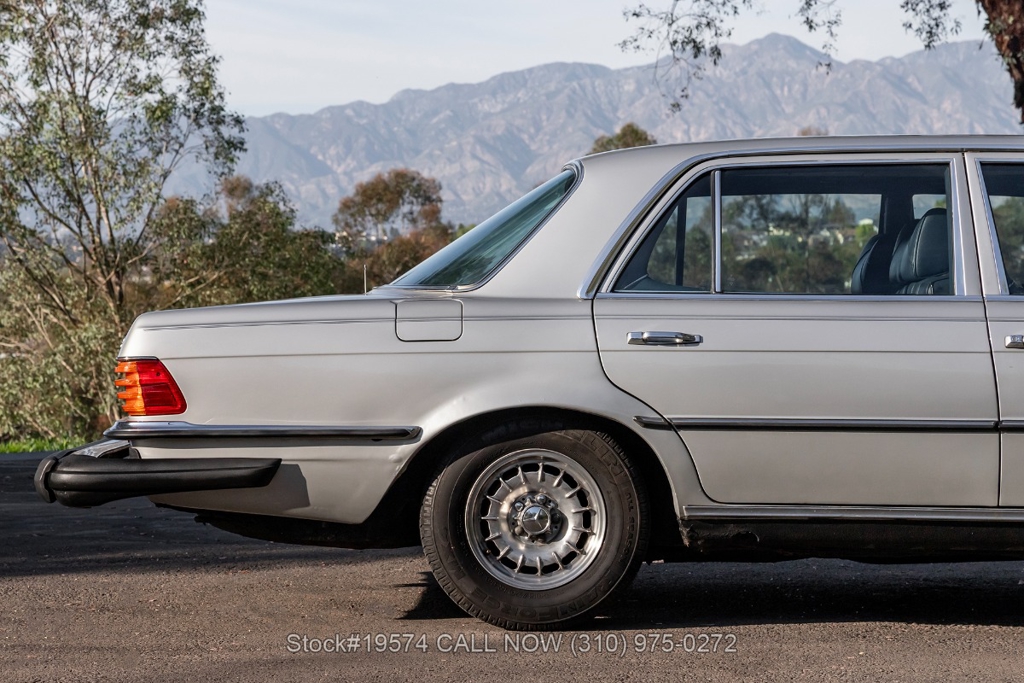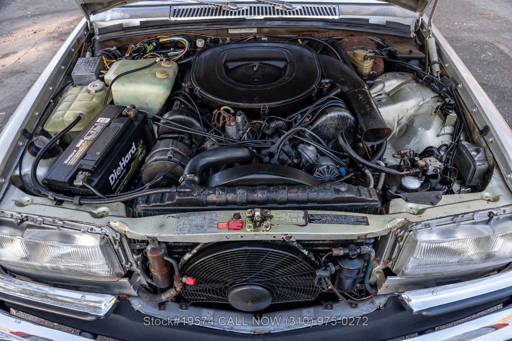 Inside, the cabin features air conditioning, bucket seats with head restraints, power windows, dual-side rearview mirrors, an analog clock, door pockets, glove box, center console, Alpine radio, and a fender-mounted antenna. The burl walnut wood trim provides a classic touch that reflects the craftsmanship Mercedes-Benz was known for during the late 1970s.