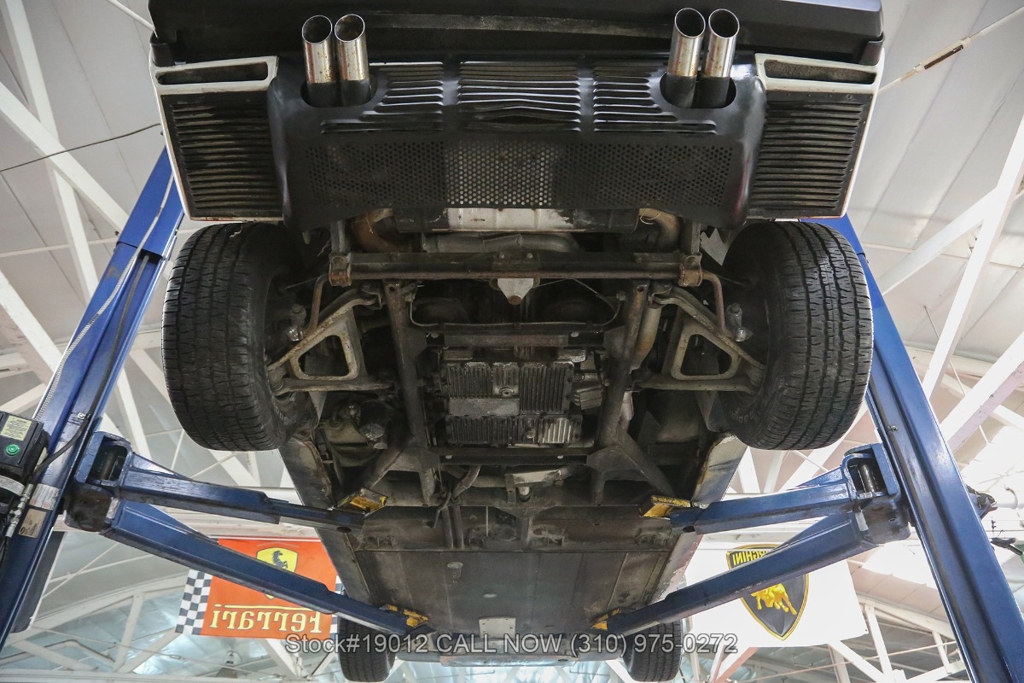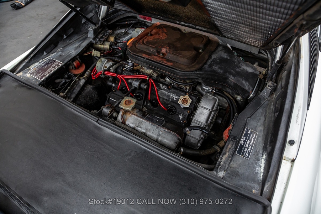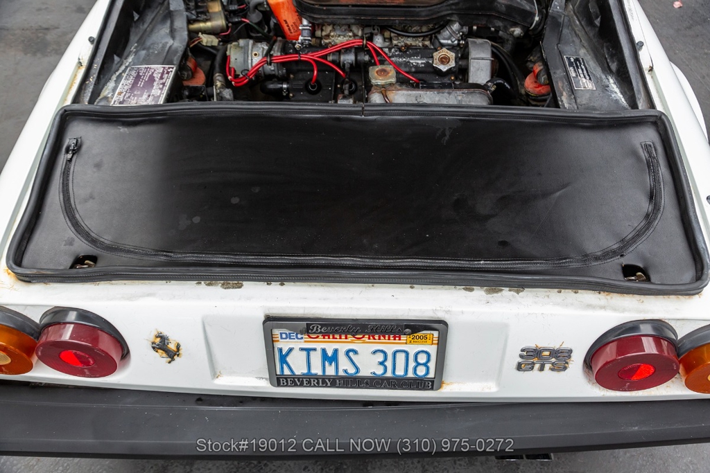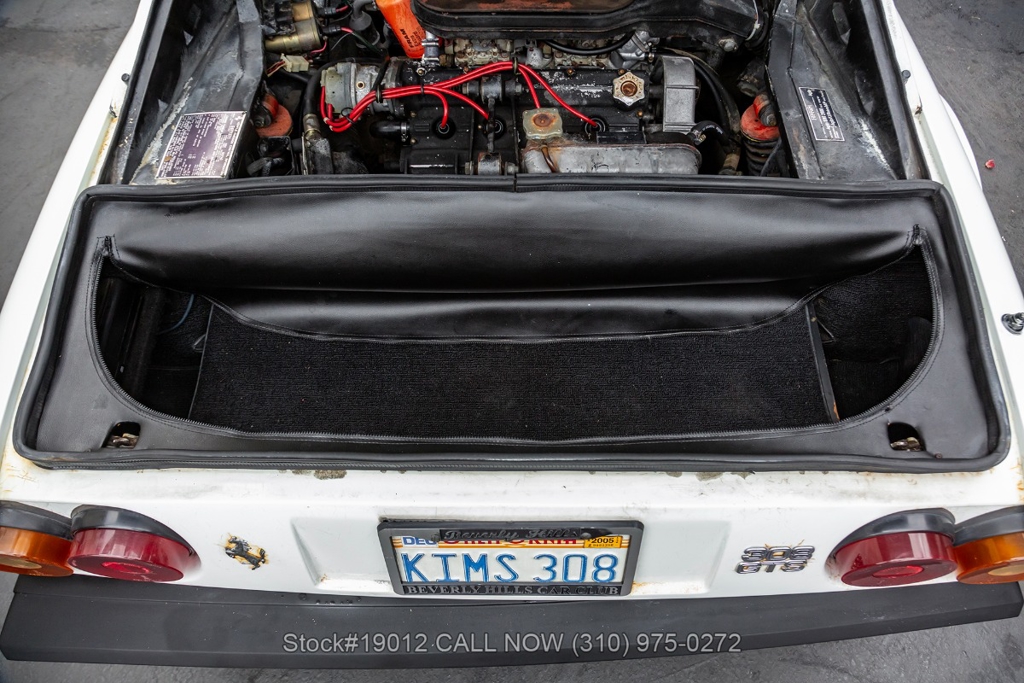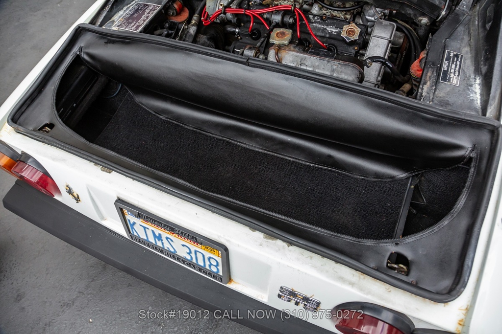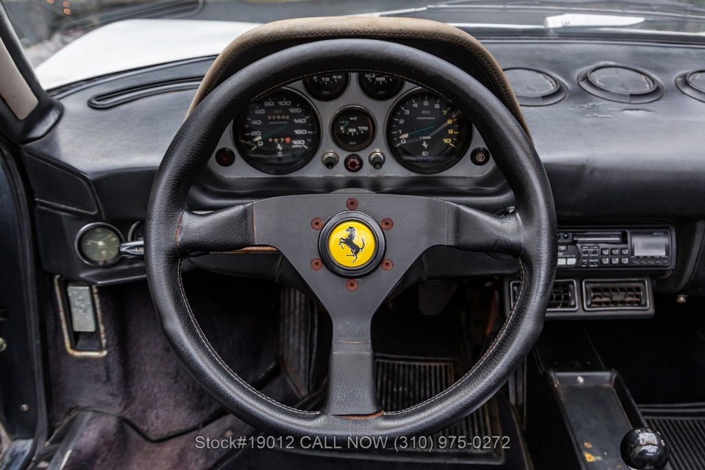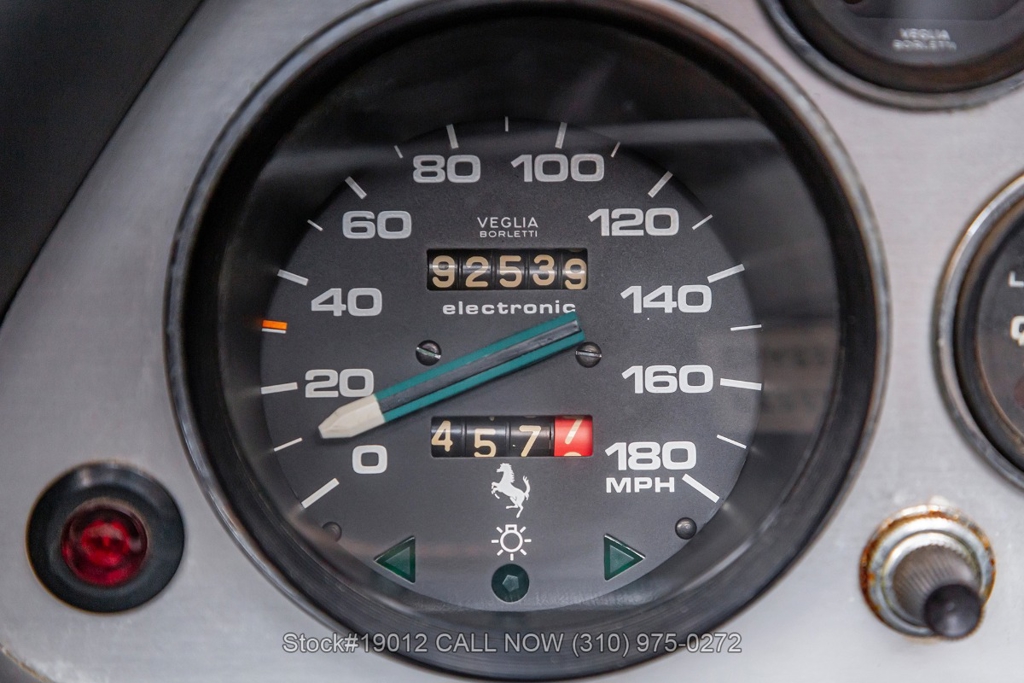 Equipped with a 5-speed manual gearbox, 2.9-Liter Quad-Cam V8 engine, four-wheel disc brakes, quad exhaust outlets, retractable headlights, black removable roof panel, Veglia instrumentation, a gated shifter, MOMO 3-spoke steering wheel, side marker lights, BFGoodrich tires, 14-inch alloy wheels, jack, tool roll, and a full-size spare tire fitted in the front trunk. The iconic Ferrari badge proudly adorns the front grille, further emphasizing its prestigious heritage. Convenience features include dual-side rearview mirrors, power windows, toggle switches, center console, louvered rear quarter windows, door pockets, and an Alpine stereo.