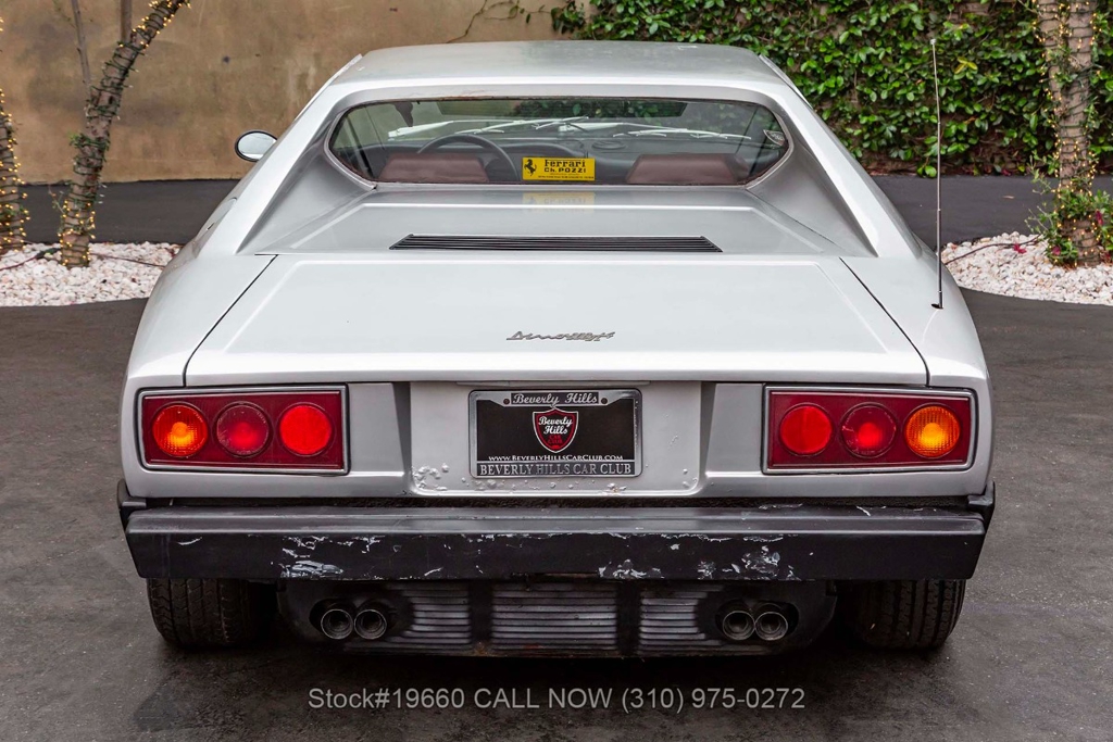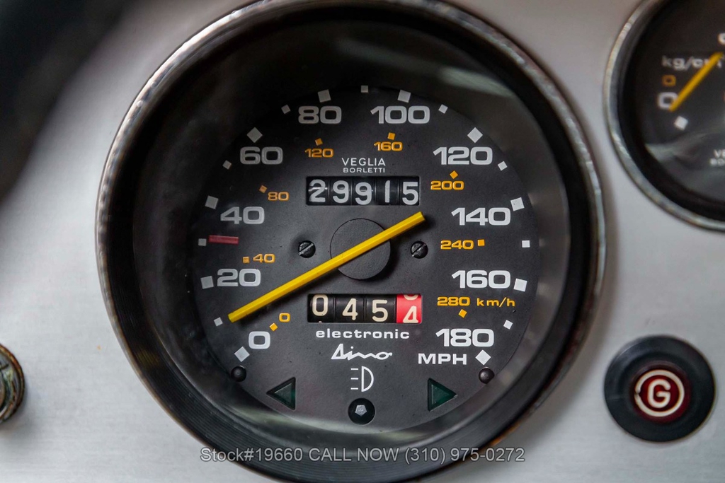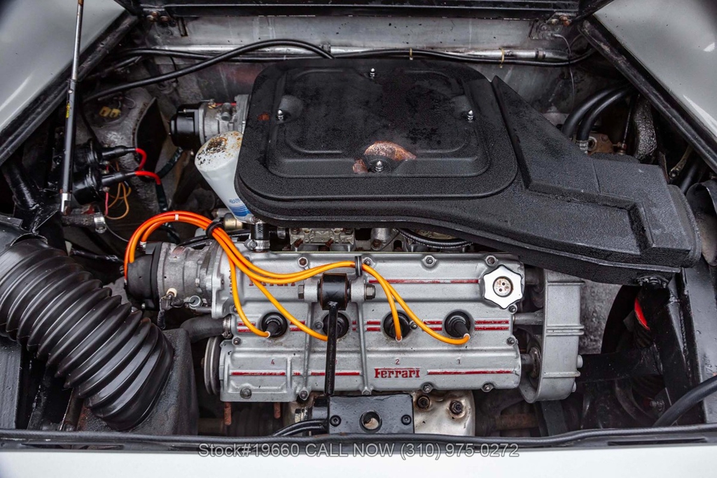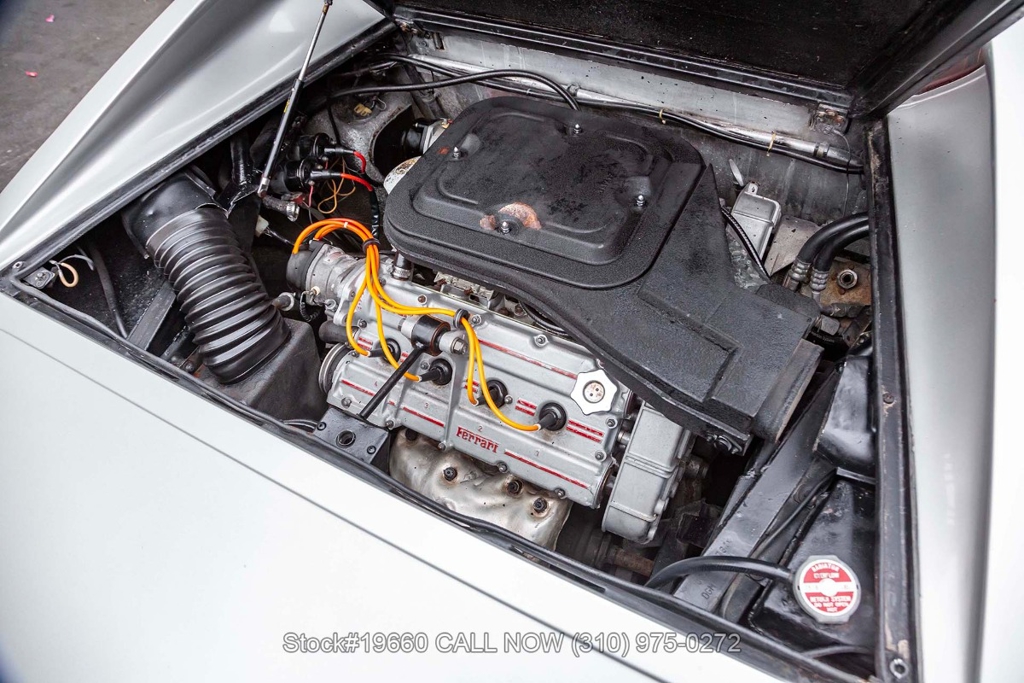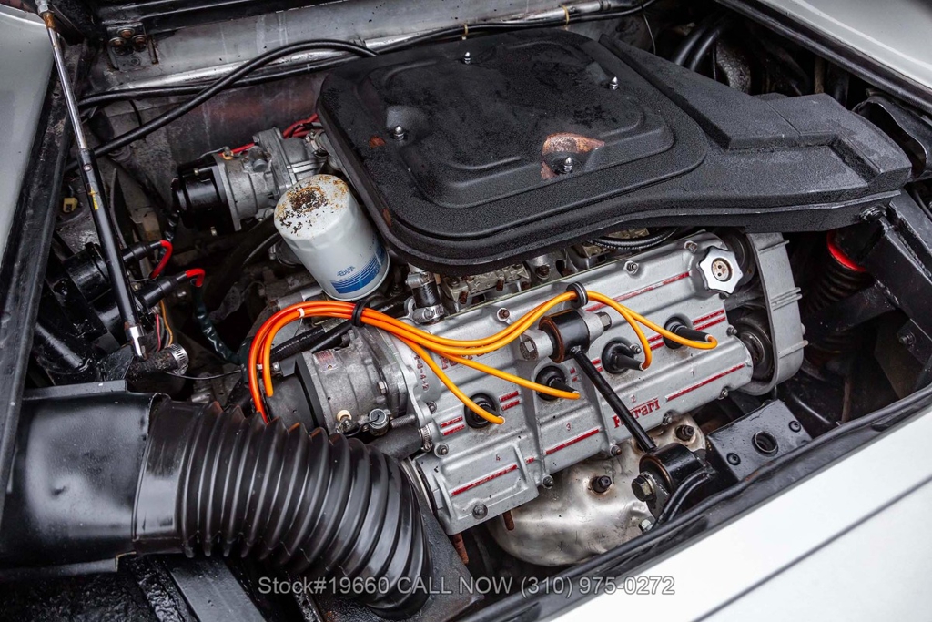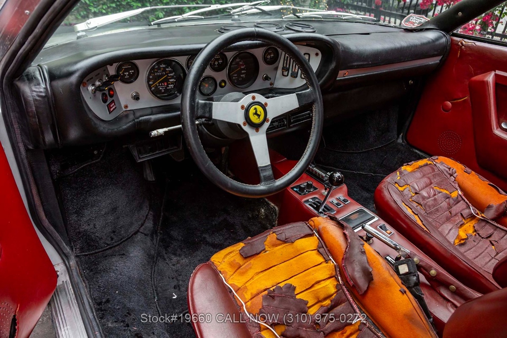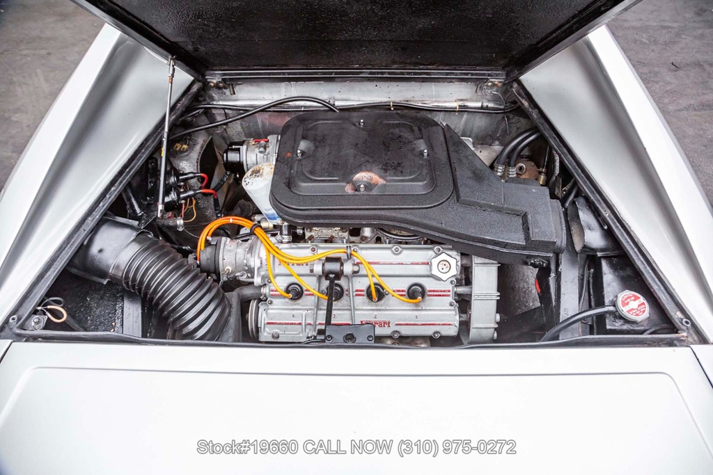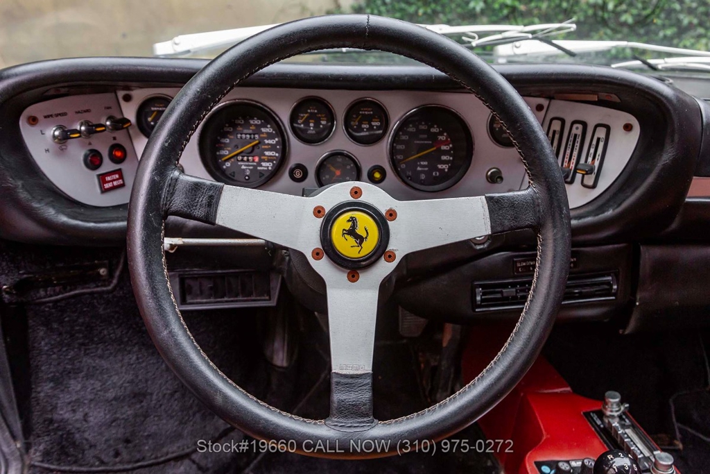 Powered by a 2.9-liter V8 engine fed by four carburetors and paired with a 5-speed manual transaxle with Ferrari's signature gated shifter. Four-wheel disc brakes provide stopping power, and the car rides on 14-inch Cromodora-branded alloy wheels. The Bertone-designed body stands apart from other Ferraris of the era with its sharp, angular lines, retractable headlights, black impact bumpers, side marker lights, quad exhaust outlets, and a fender-mounted antenna. Subtle details such as the Dino 308 GT4 badging reflect its unique place in Ferrari history.