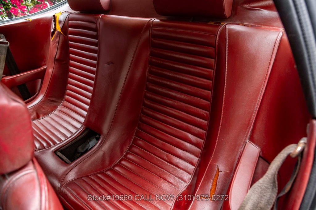 Inside, the Bordeaux interior features 2+2 seating, Veglia instrumentation, air conditioning, power windows, MOMO steering wheel, and a center console. The cabin retains its vintage Ferrari layout and period-correct finishes, offering a straightforward and functional presentation.