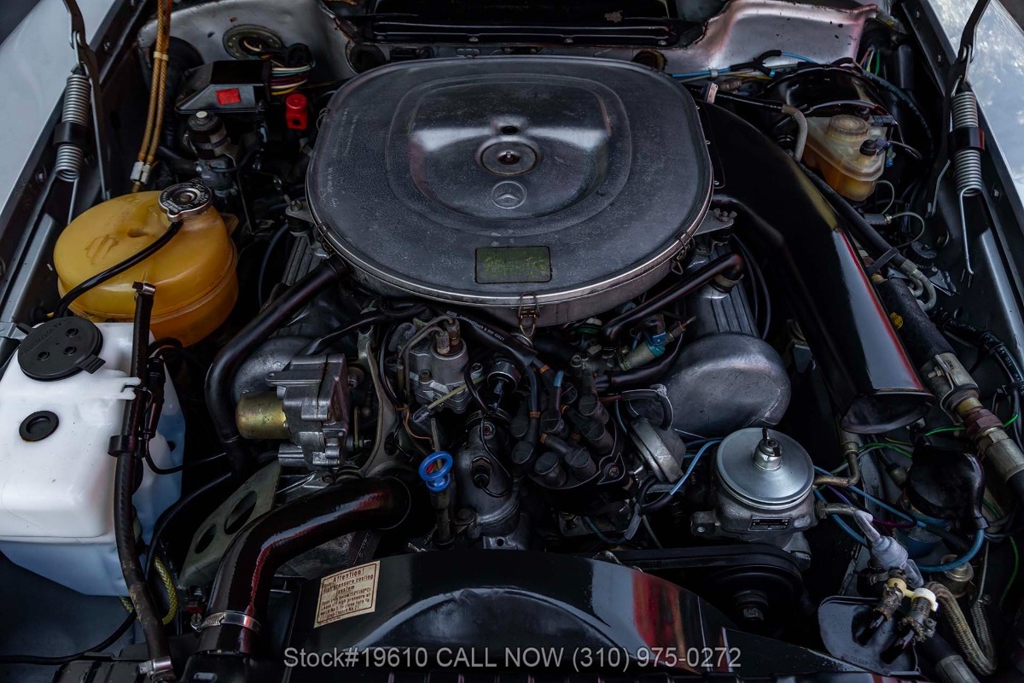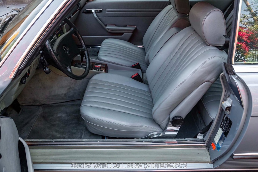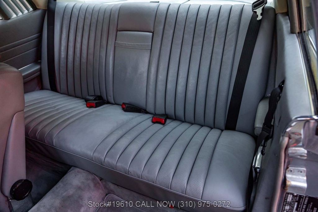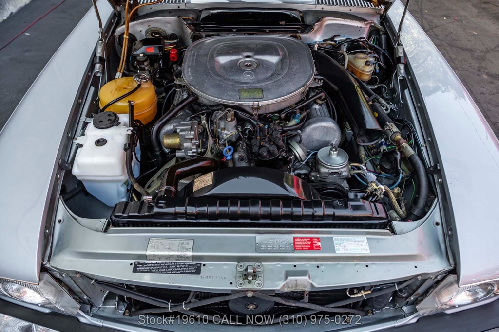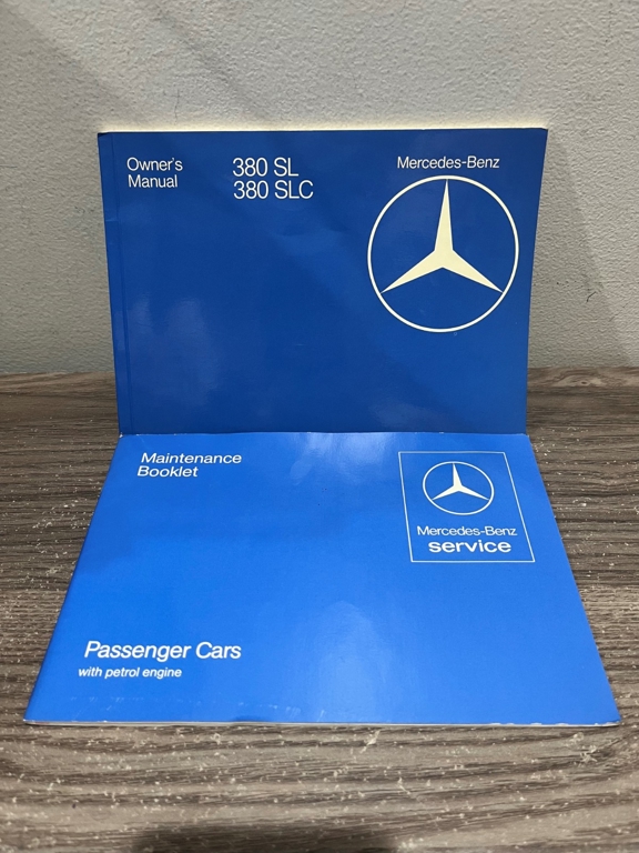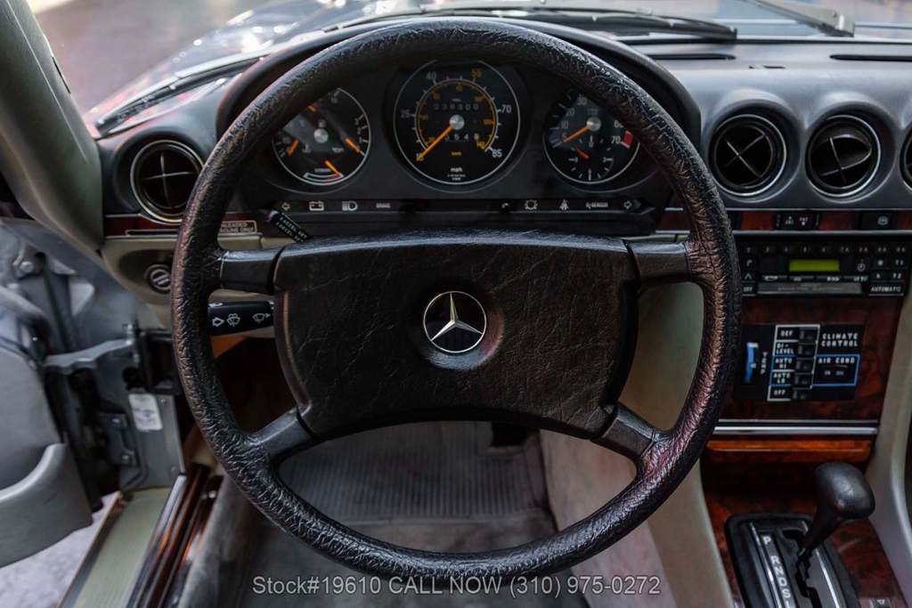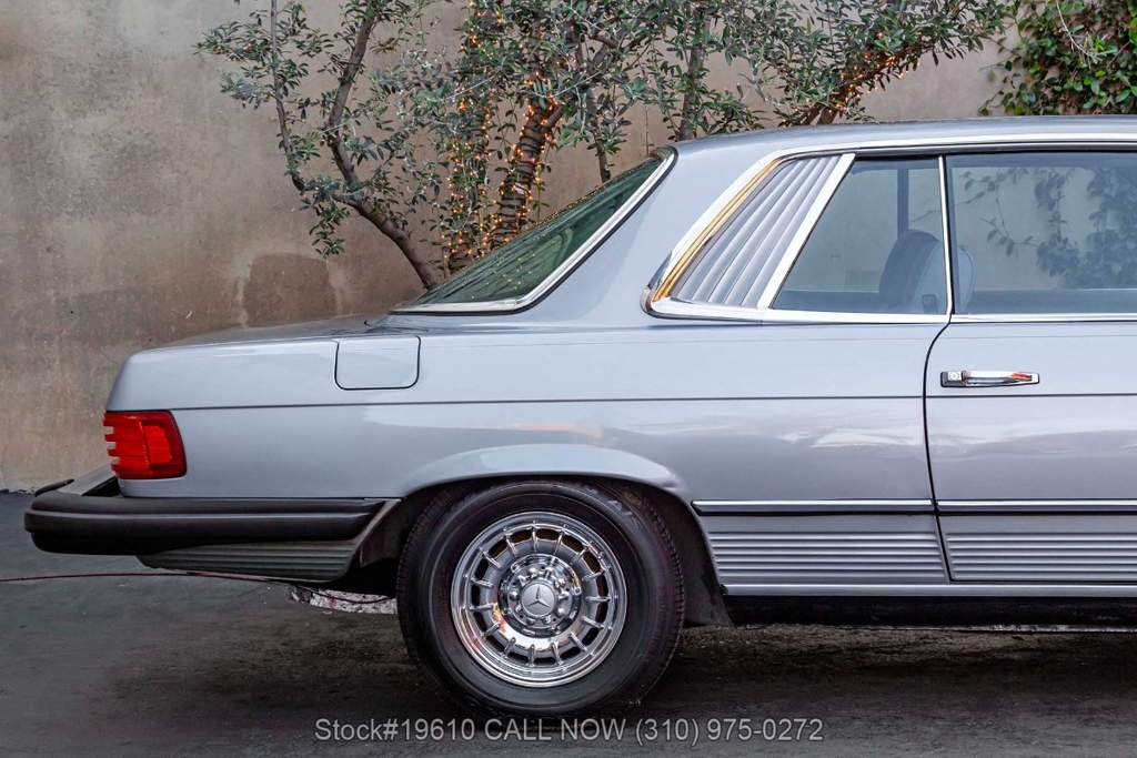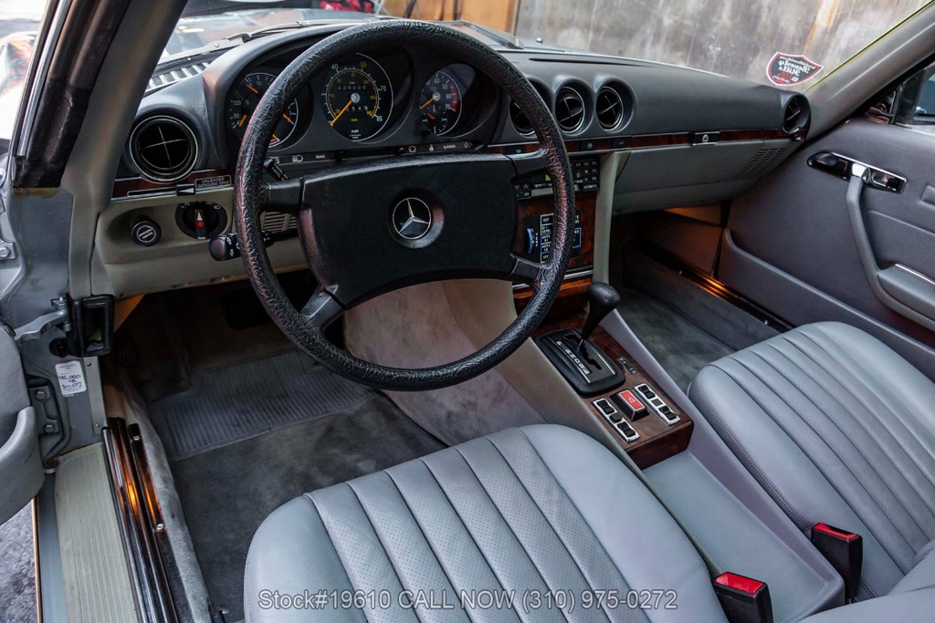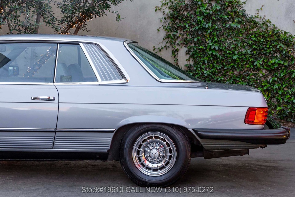 Powered by a fuel-injected V8 paired with an automatic transmission, this 380SLC is equipped with power-assisted four-wheel disc brakes and power steering for a composed driving experience. Exterior details include chrome bumpers with rubber guards, body side moldings, quad headlamps, Bosch-branded fog lights, and a full-size spare housed in the trunk.