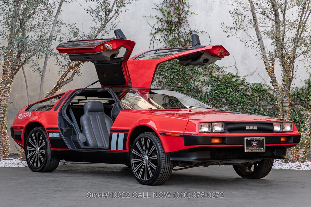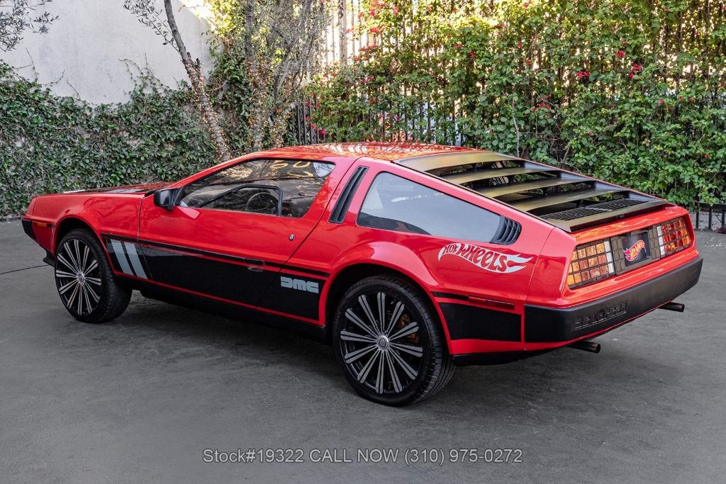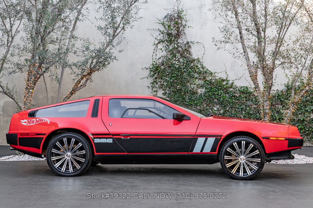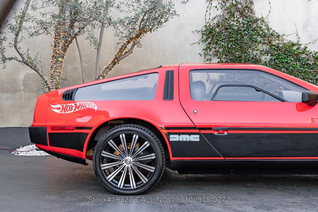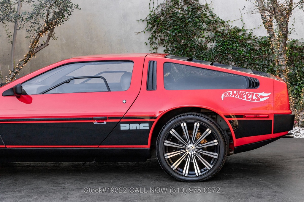 Introducing this 1982 DeLorean DMC-12 5-Speed Hot Wheels Tribute, a bold reimagining of one of the most recognizable cars ever produced. Departing from the factory brushed stainless-steel finish, this example wears a striking custom red paint scheme with Hot Wheels-inspired graphics, transforming the DMC-12 into a real-life version of the legendary die-cast icon. Signature Hot Wheels flame logos adorn the rear quarter panels, complemented by yellow and orange racing stripes that give the car an unmistakable presence.