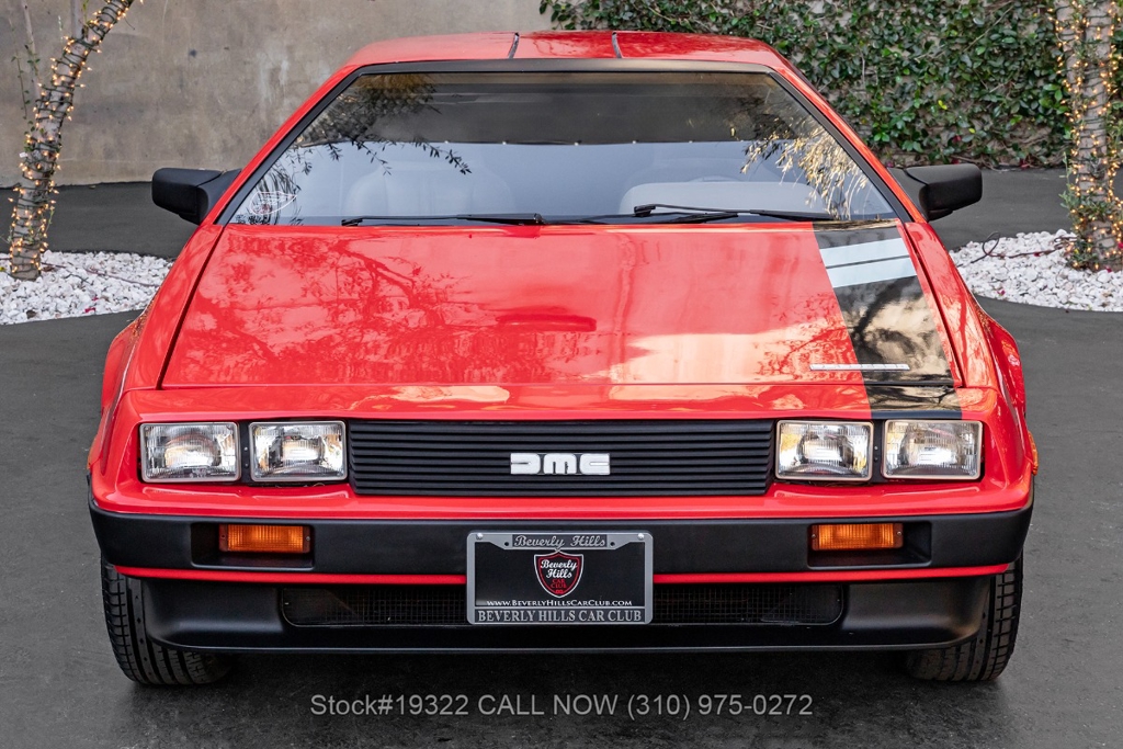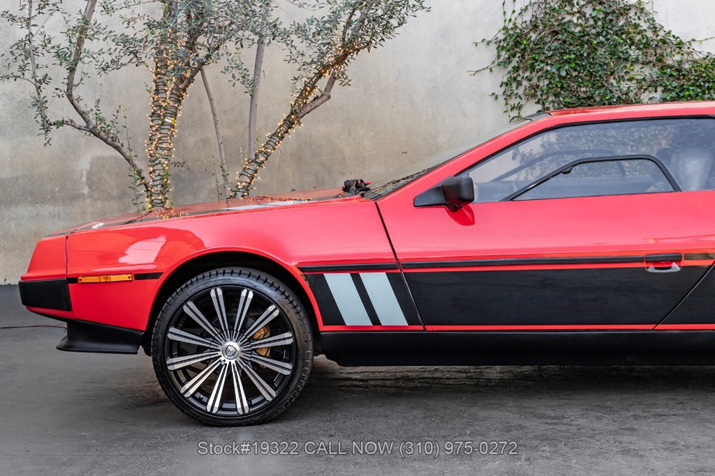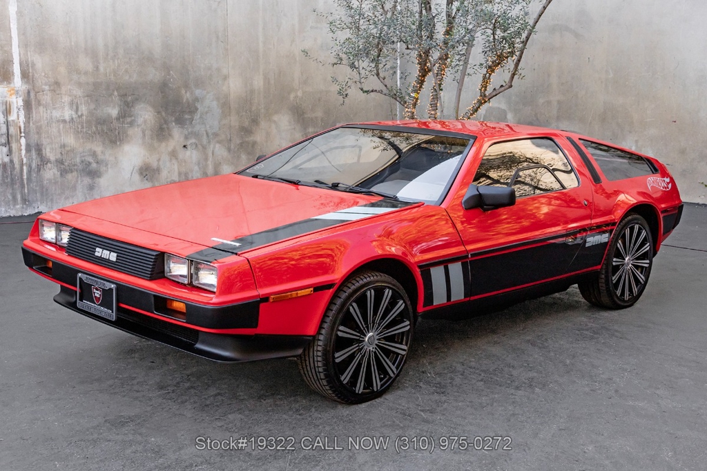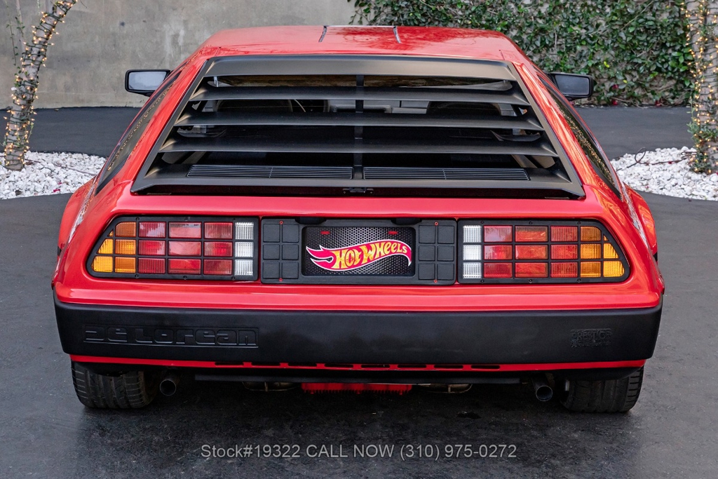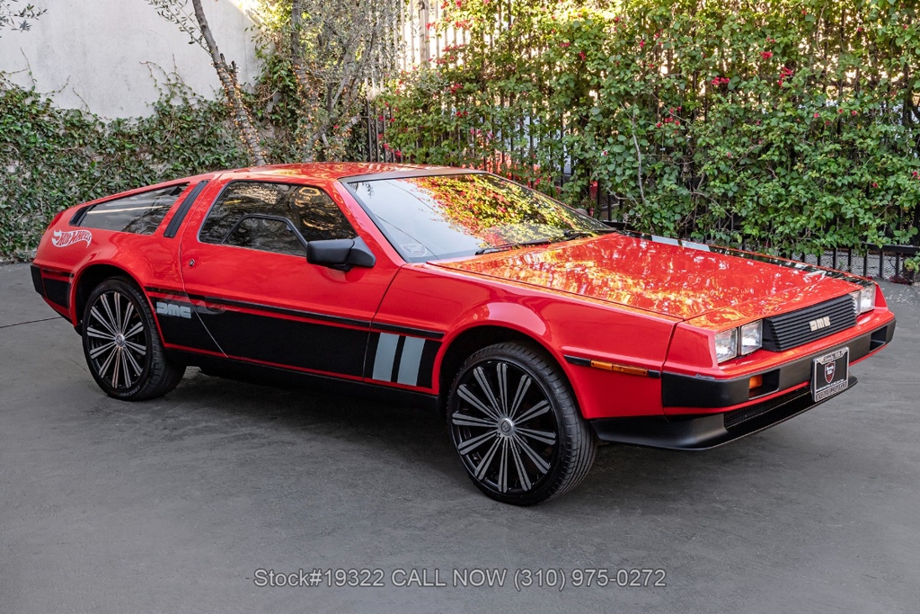 Introducing this 1982 DeLorean DMC-12 5-Speed Hot Wheels Tribute, a bold reimagining of one of the most recognizable cars ever produced. Departing from the factory brushed stainless-steel finish, this example wears a striking custom red paint scheme with Hot Wheels-inspired graphics, transforming the DMC-12 into a real-life version of the legendary die-cast icon. Signature Hot Wheels flame logos adorn the rear quarter panels, complemented by yellow and orange racing stripes that give the car an unmistakable presence.