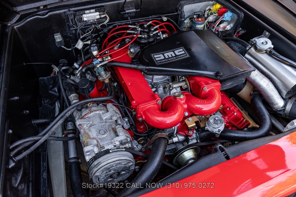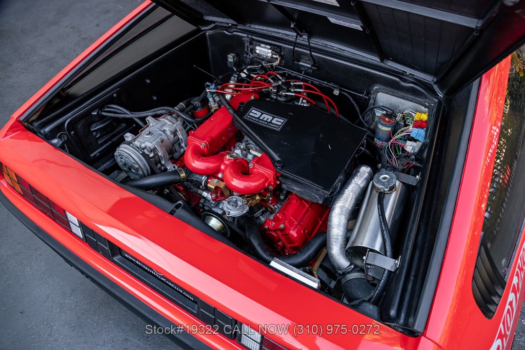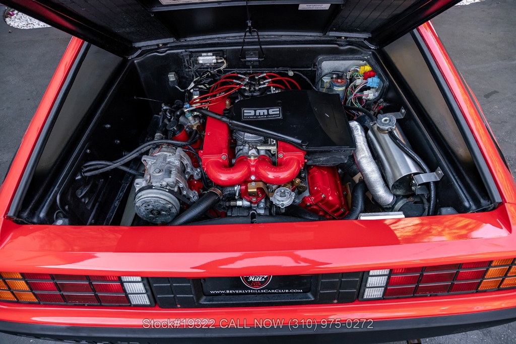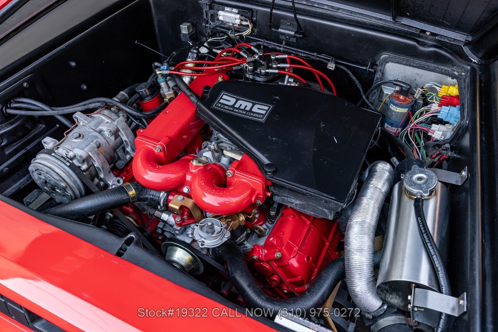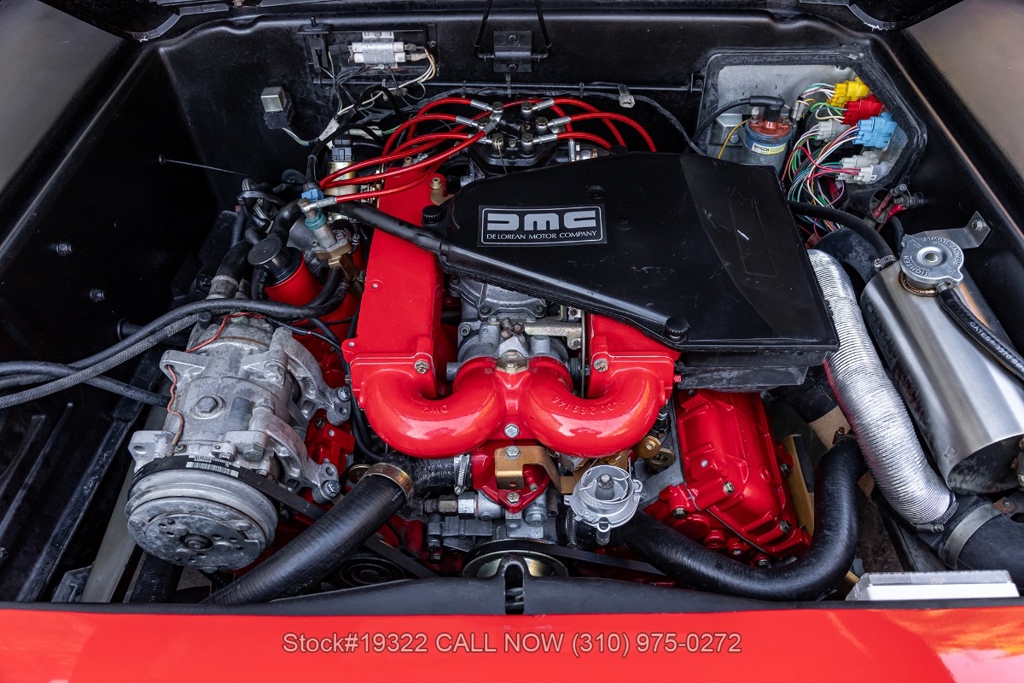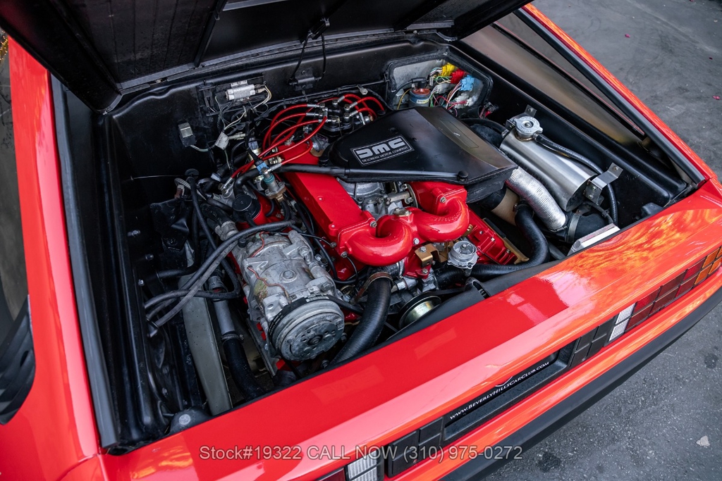 Power comes from the rear-mounted V6 engine paired with a 5-speed manual transmission and mechanical fuel injection. Additional features include four-wheel disc brakes, dual exhaust outlets, counterbalanced Gullwing doors, quadruple headlights, body-side moldings, side marker lights, a front spoiler, and a louvered rear window cover. Inside, you'll find a three-spoke steering wheel, center console, air conditioning, dual side mirrors, power windows, and a fender-mounted antenna.