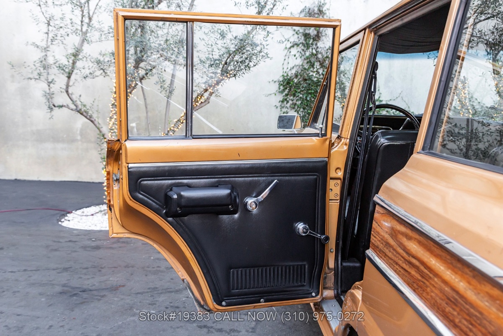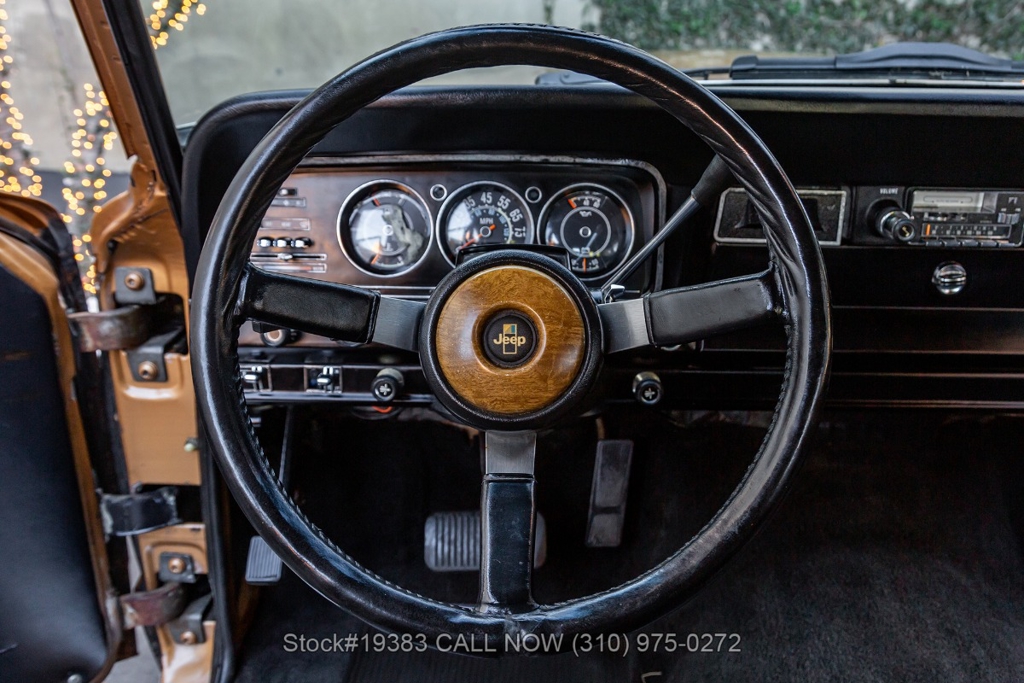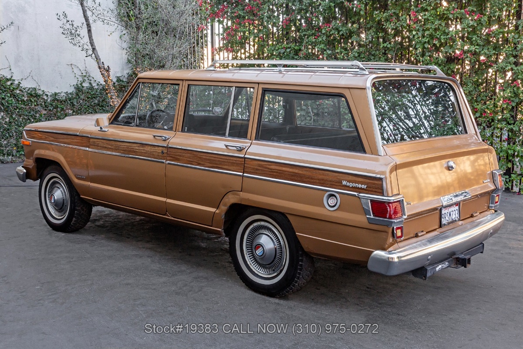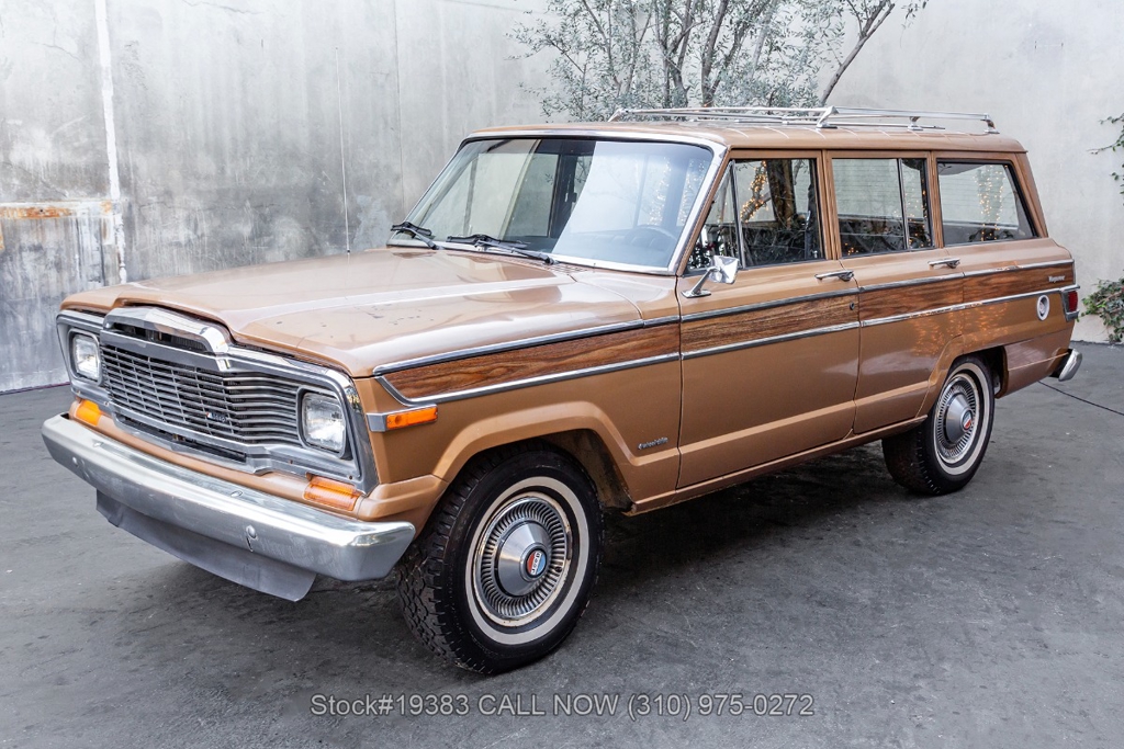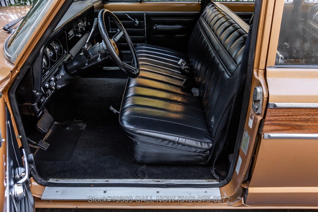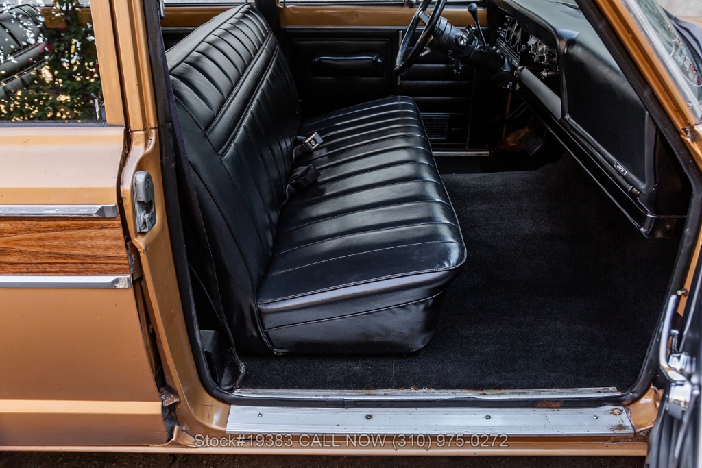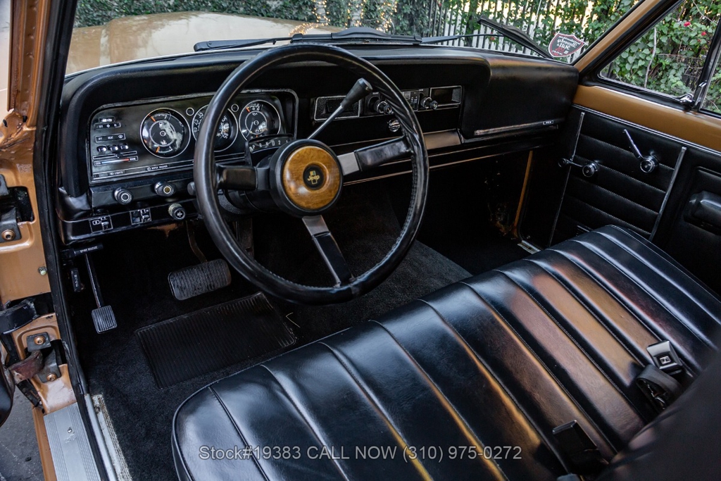Power comes from a V8 engine mated to an automatic transmission with column shift, delivering the optimal performance these full-size Jeeps are known for. The four-wheel-drive system adds versatility, while power steering, a Motorcraft carburetor, and a single exhaust outlet contribute to a simple, functional driving experience. Exterior details include Wagoneer badging, chrome trim and bumpers, white-line tires, and 15-inch steel wheels with Jeep-branded center caps.