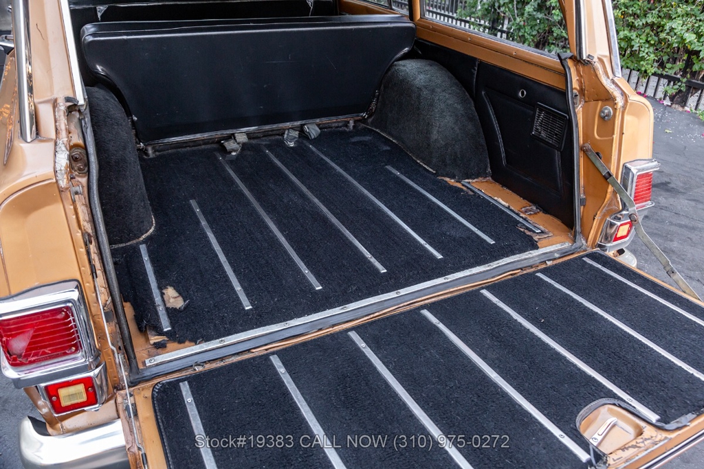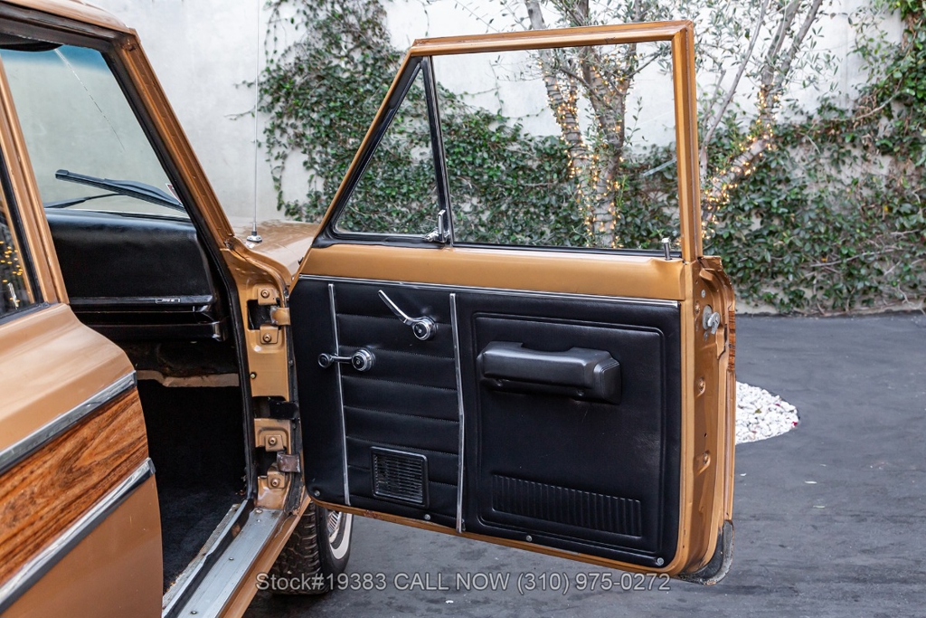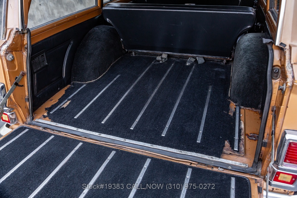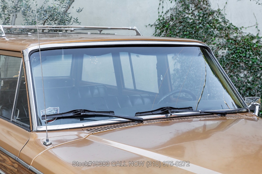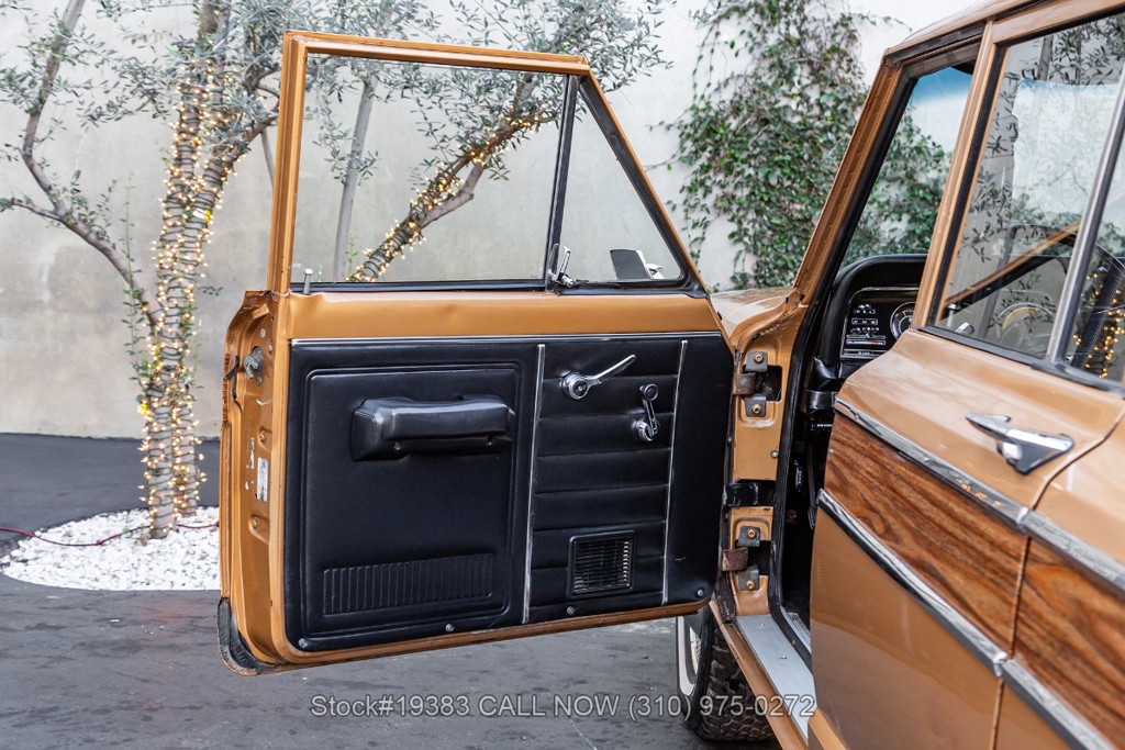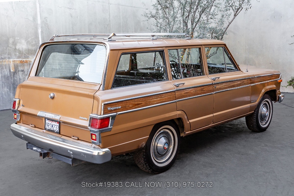 Power comes from a V8 engine mated to an automatic transmission with column shift, delivering the optimal performance these full-size Jeeps are known for. The four-wheel-drive system adds versatility, while power steering, a Motorcraft carburetor, and a single exhaust outlet contribute to a simple, functional driving experience. Exterior details include Wagoneer badging, chrome trim and bumpers, white-line tires, and 15-inch steel wheels with Jeep-branded center caps.