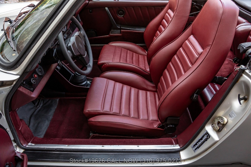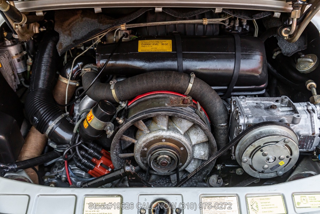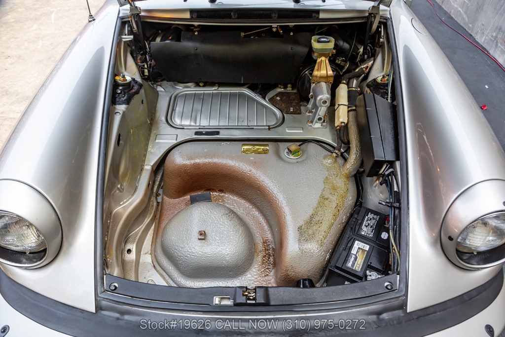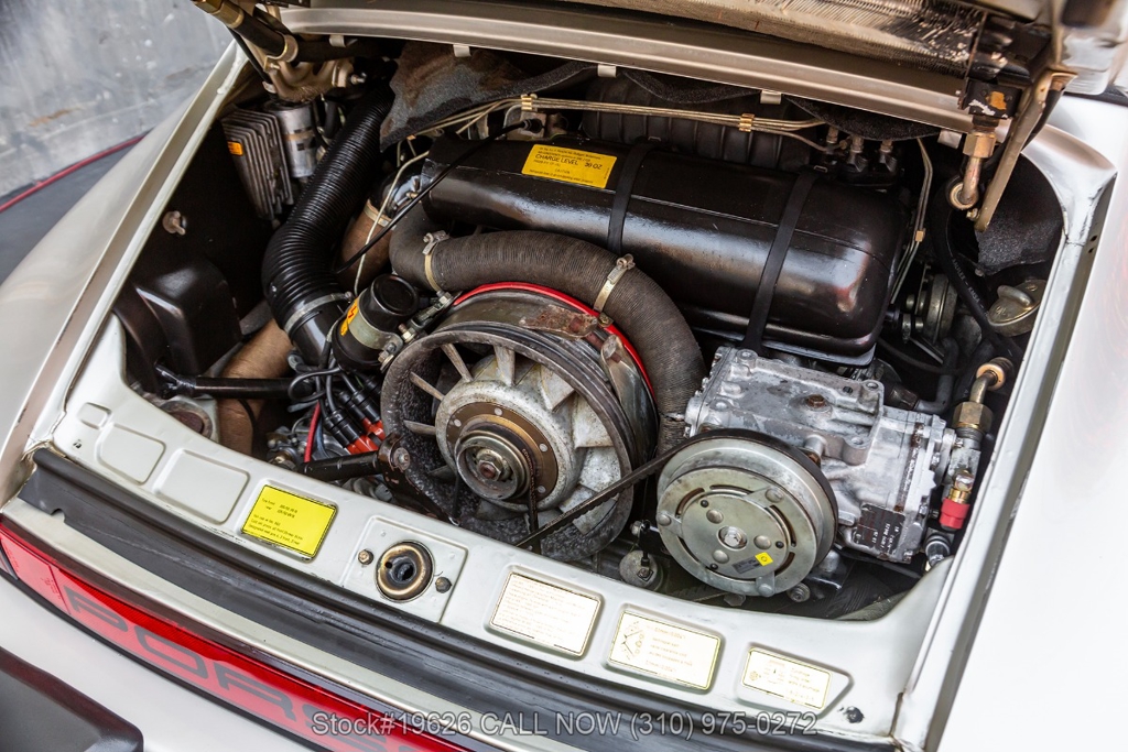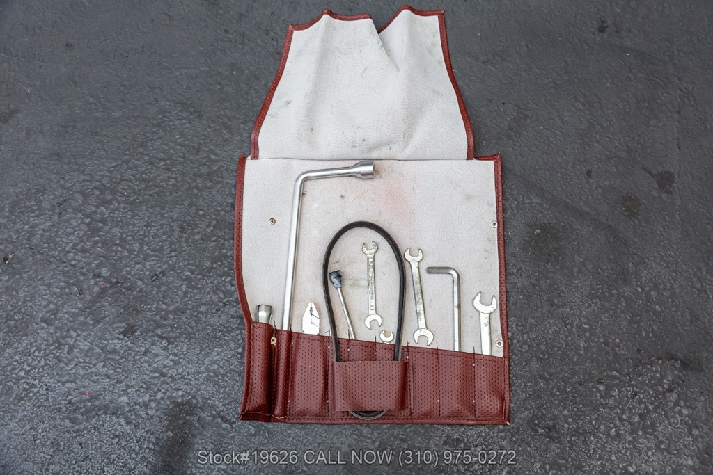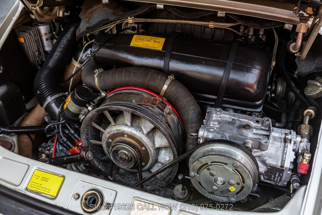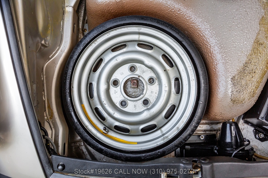 Power is delivered through a 5-speed manual transmission paired with a 3.0-liter flat-six engine. Additional equipment includes four-wheel disc brakes, a single exhaust outlet, a 3-spoke steering wheel, body-color headlight bezels, Bosch fog lights, and a rear spoiler. The exterior is complemented by 16-inch Fuchs-style wheels wrapped in Yokohama tires. In the front trunk sits a correct Vredestein spare tire mounted on a steel wheel and a tool roll.