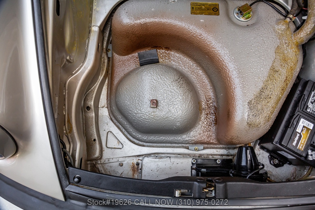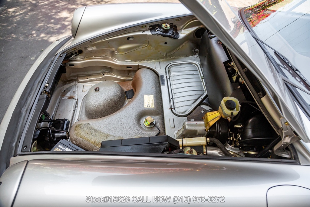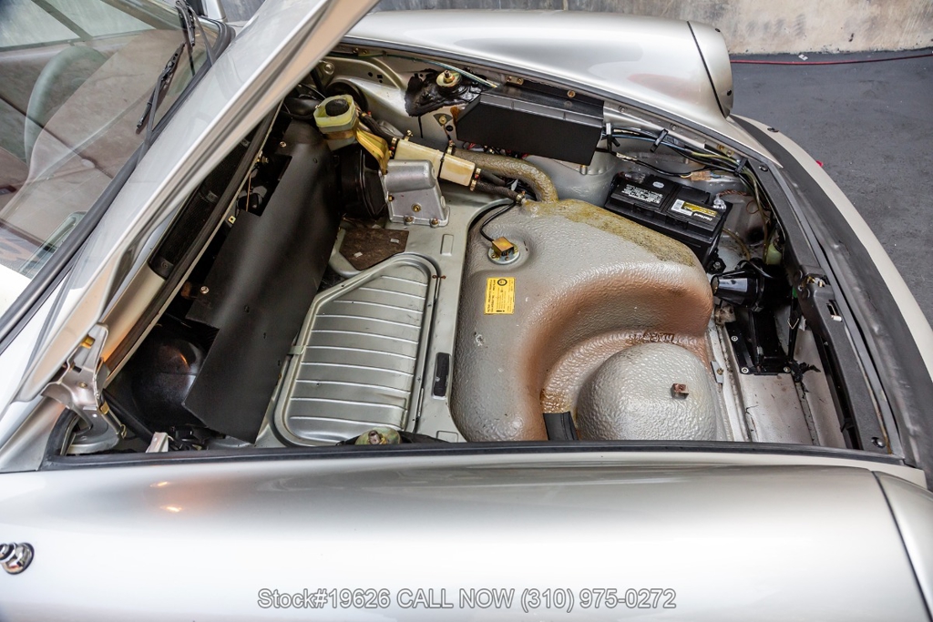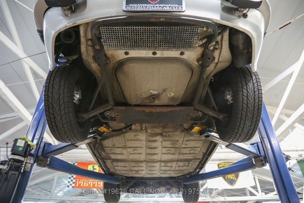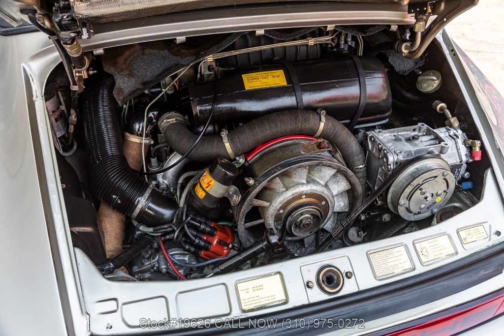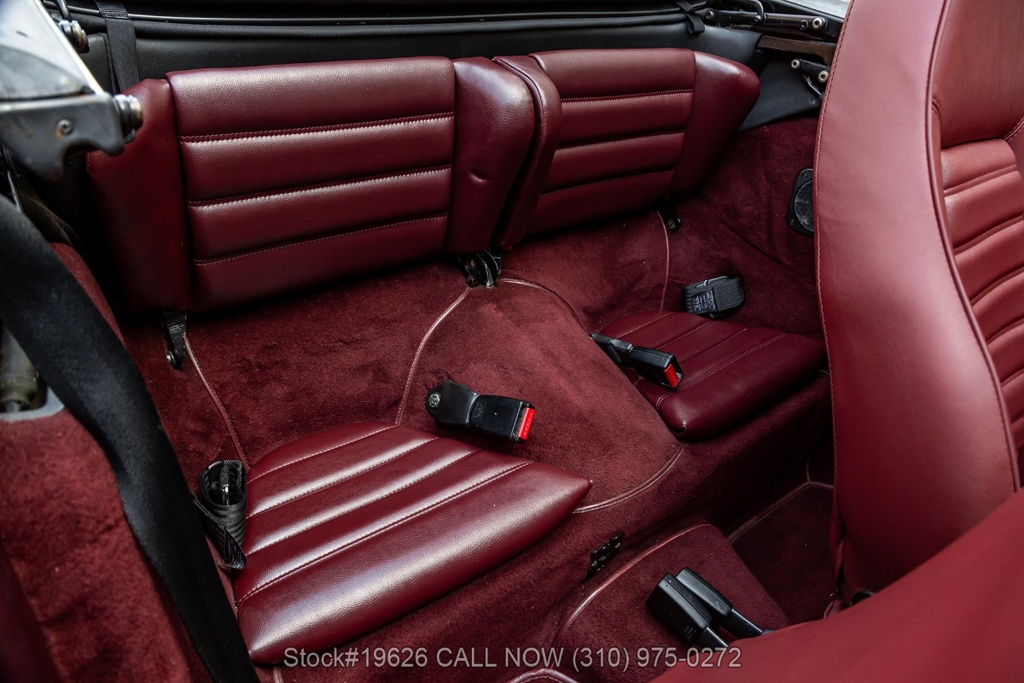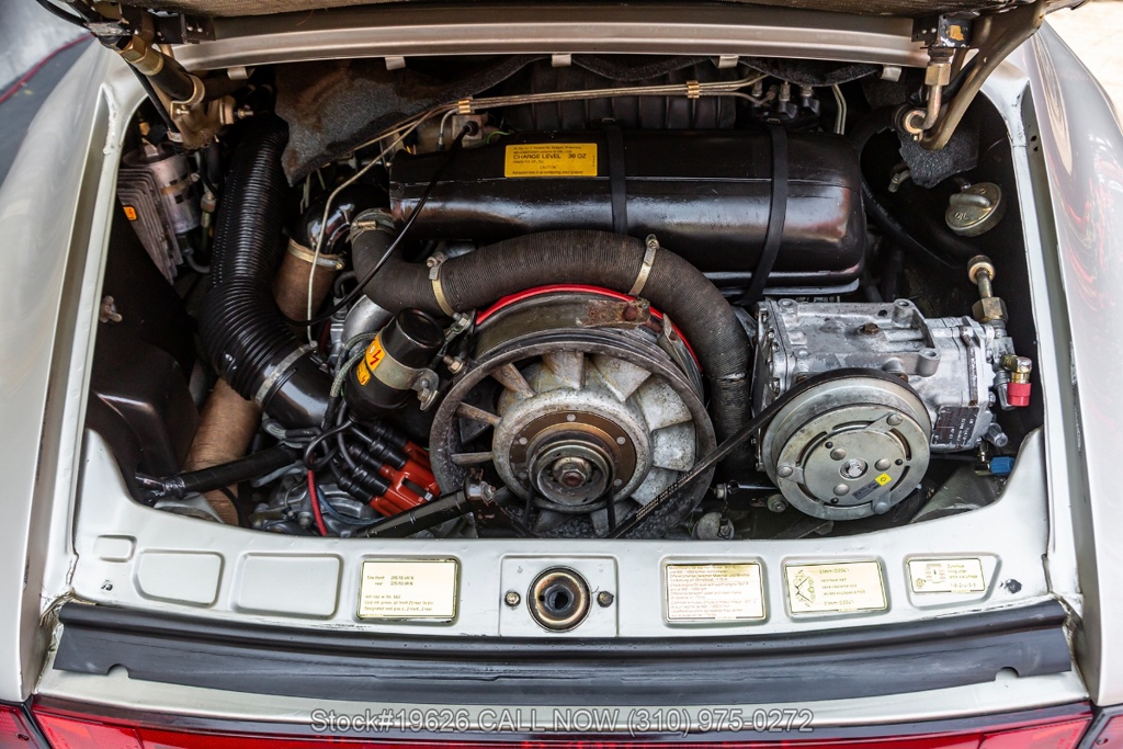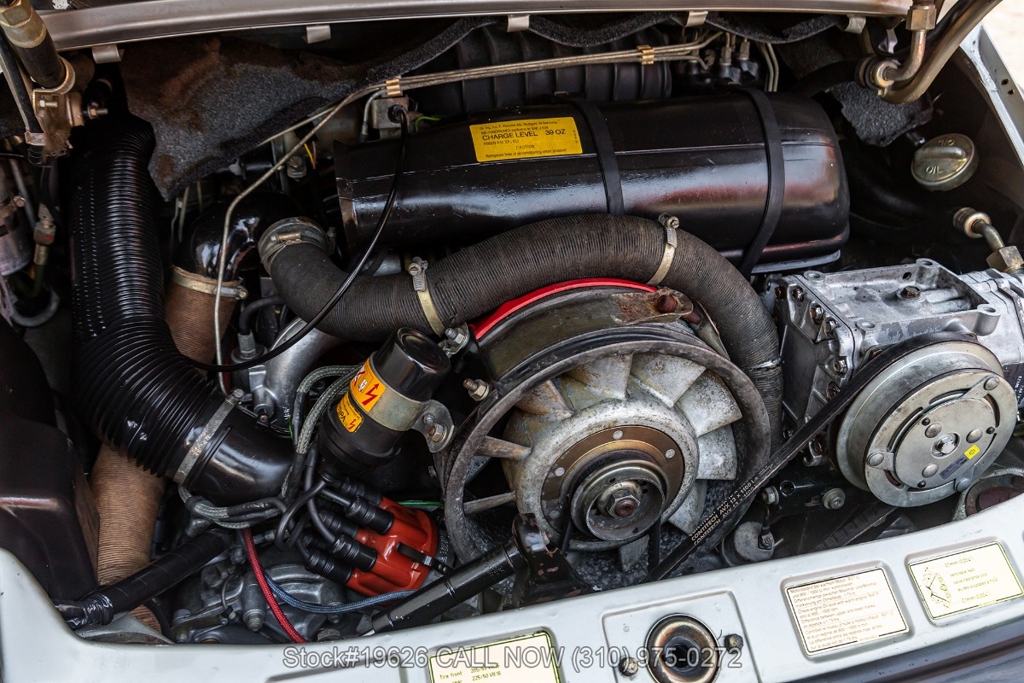 Power is delivered through a 5-speed manual transmission paired with a 3.0-liter flat-six engine. Additional equipment includes four-wheel disc brakes, a single exhaust outlet, a 3-spoke steering wheel, body-color headlight bezels, Bosch fog lights, and a rear spoiler. The exterior is complemented by 16-inch Fuchs-style wheels wrapped in Yokohama tires. In the front trunk sits a correct Vredestein spare tire mounted on a steel wheel and a tool roll.