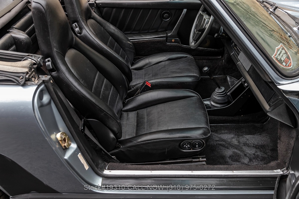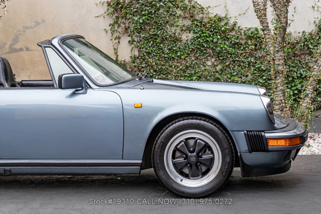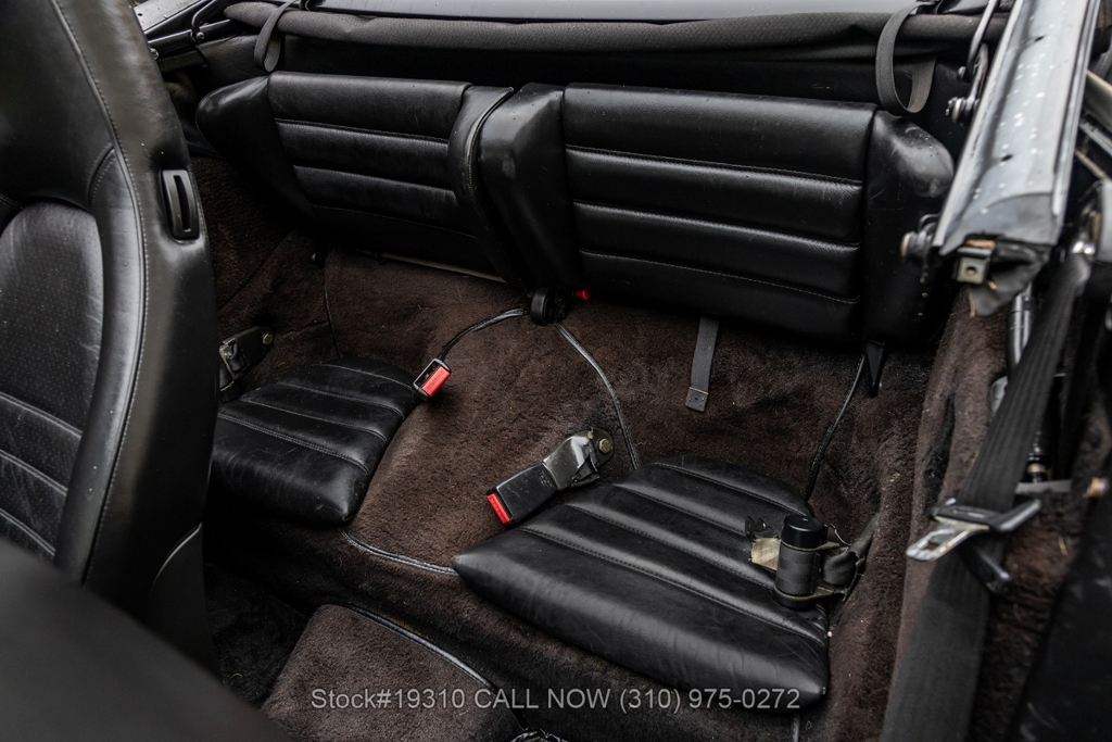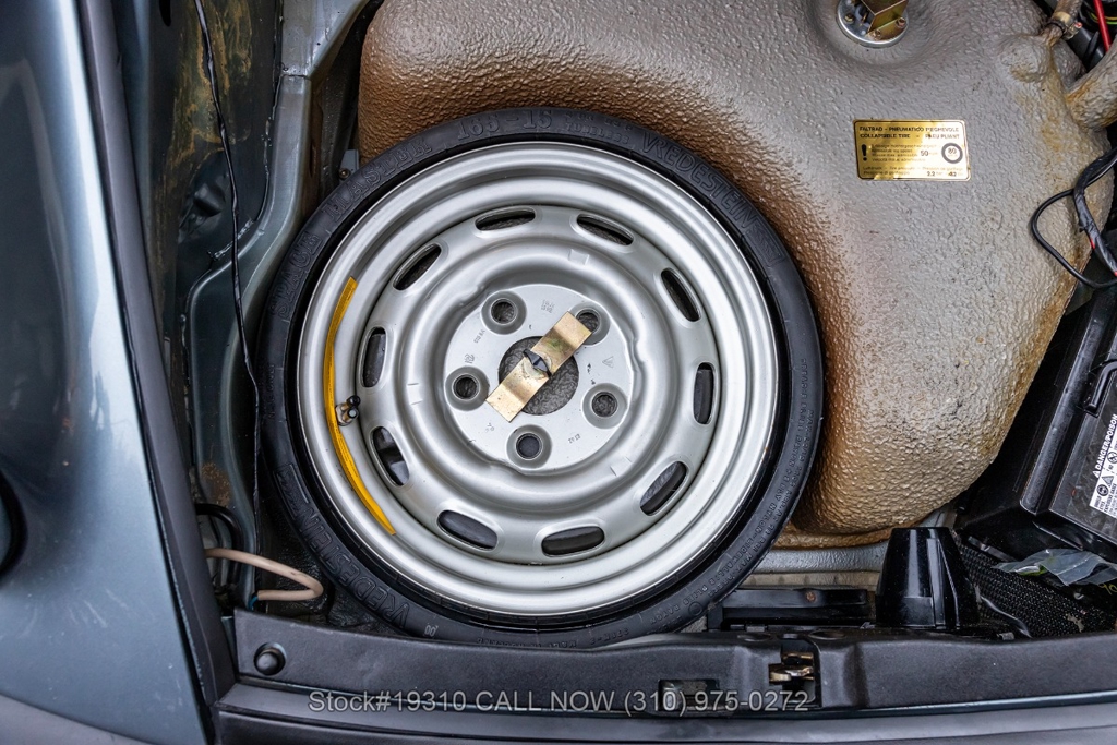 Equipped with a 5-speed 915 manual transaxle, air-cooled 3.2-liter flat-six engine, single exhaust outlet, four-wheel disc brakes, VDO instrumentation, black convertible soft top, Bosch-branded front fog lights, rear rubber bumperettes, 3-spoke steering wheel, Michelin tires, 16-inch Fuchs-style wheels, and a spare tire fitted in the front trunk. Convenience features include air conditioning, power windows, power-adjustable front seats, door pockets, glove box, and dual-side rearview mirrors.