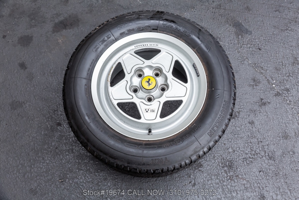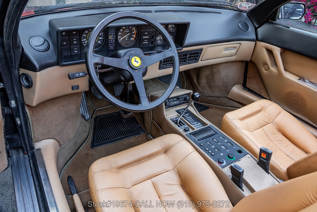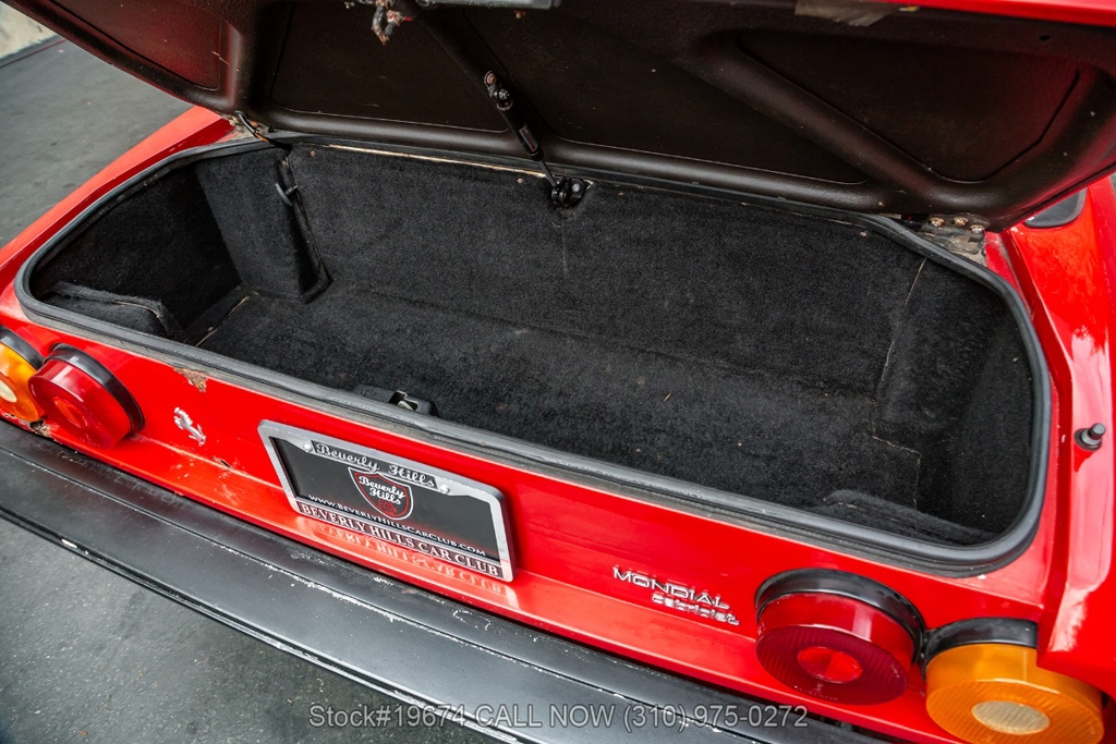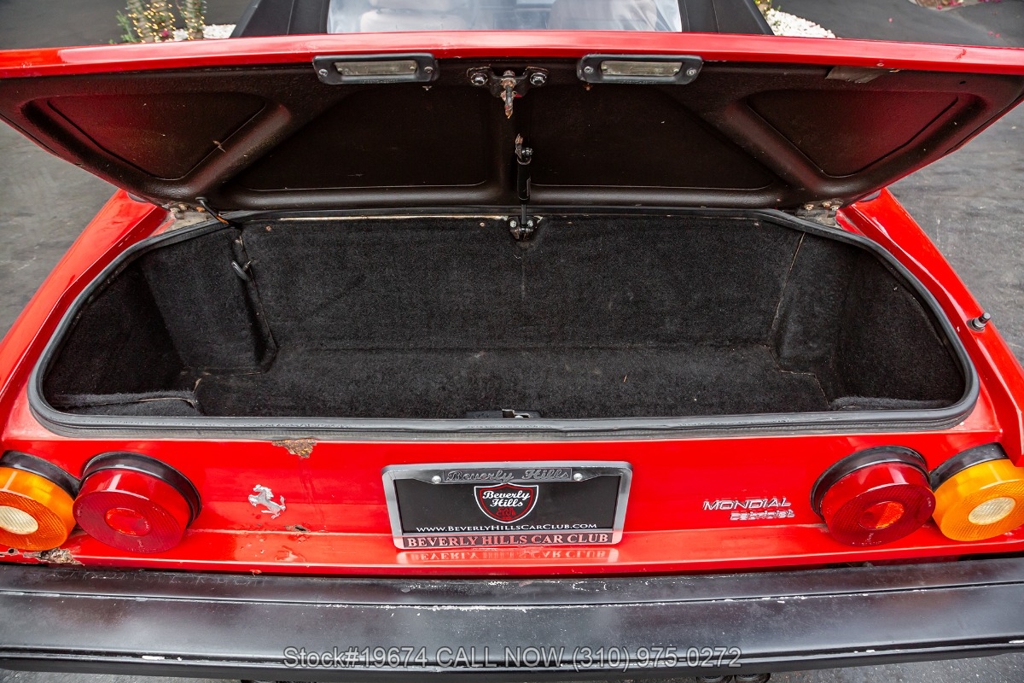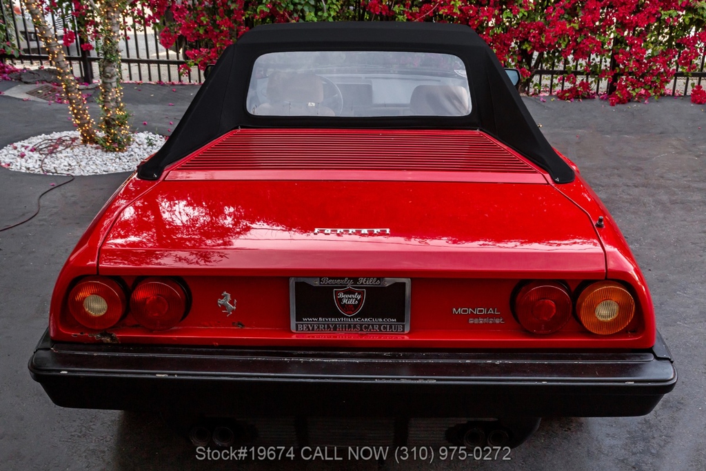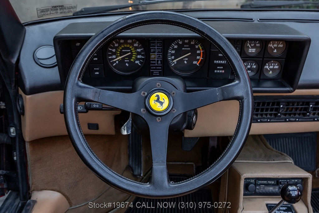 This Mondial is equipped with a 5-speed manual transmission paired to a V8 engine featuring Bosch K-Jetronic fuel injection. Additional equipment includes a black convertible soft top, quad exhaust outlets, four-wheel disc brakes, retractable headlights, side air intakes, Cibie fog lights, and a gated shifter, an iconic Ferrari detail. It rides on 17-inch alloy wheels with Ferrari-branded center caps and includes a jack, tool roll, and full-size spare tire.