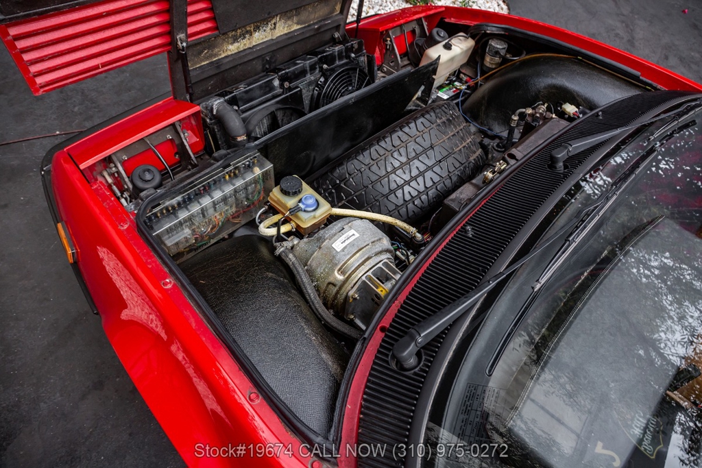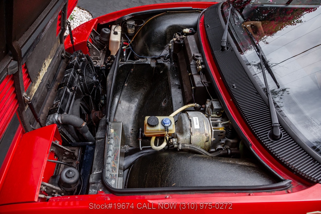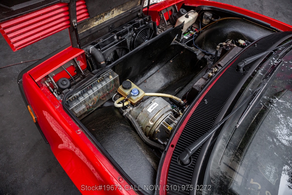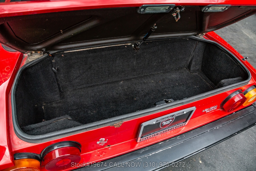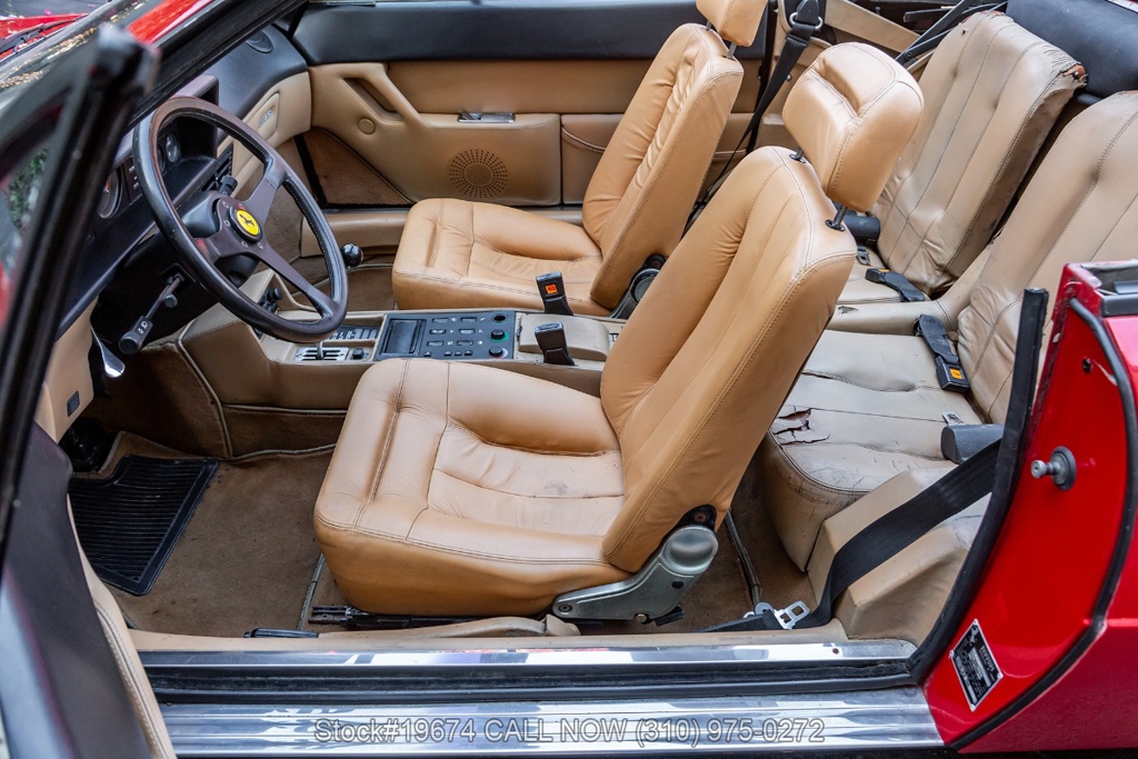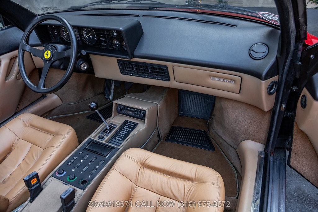 This Mondial is equipped with a 5-speed manual transmission paired to a V8 engine featuring Bosch K-Jetronic fuel injection. Additional equipment includes a black convertible soft top, quad exhaust outlets, four-wheel disc brakes, retractable headlights, side air intakes, Cibie fog lights, and a gated shifter, an iconic Ferrari detail. It rides on 17-inch alloy wheels with Ferrari-branded center caps and includes a jack, tool roll, and full-size spare tire.