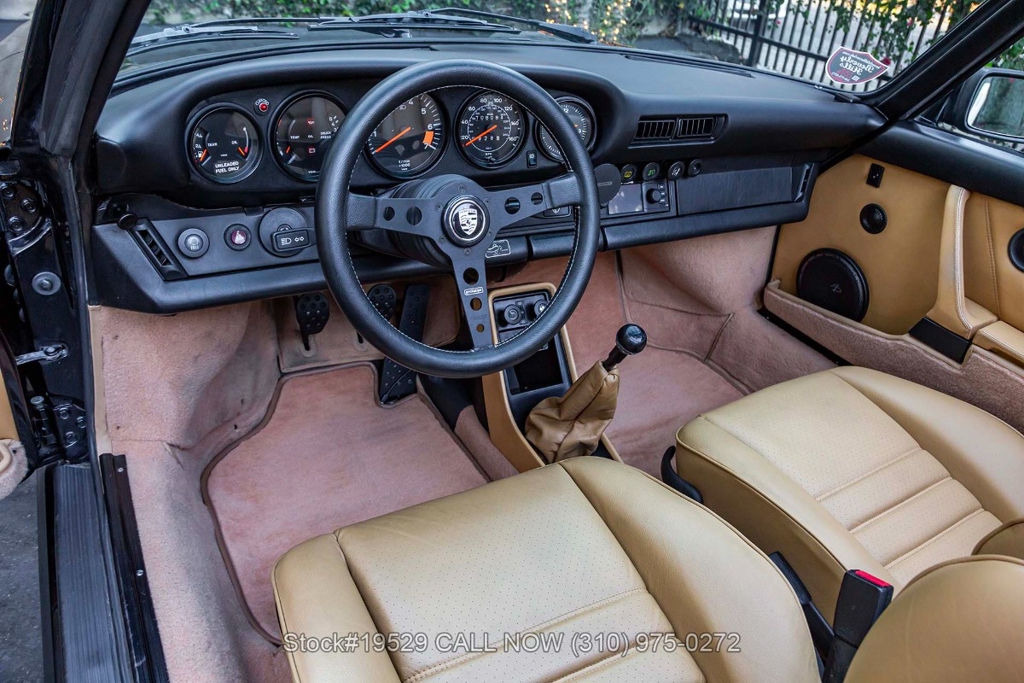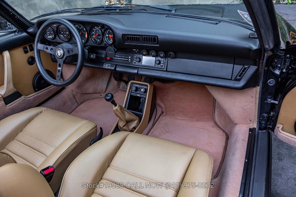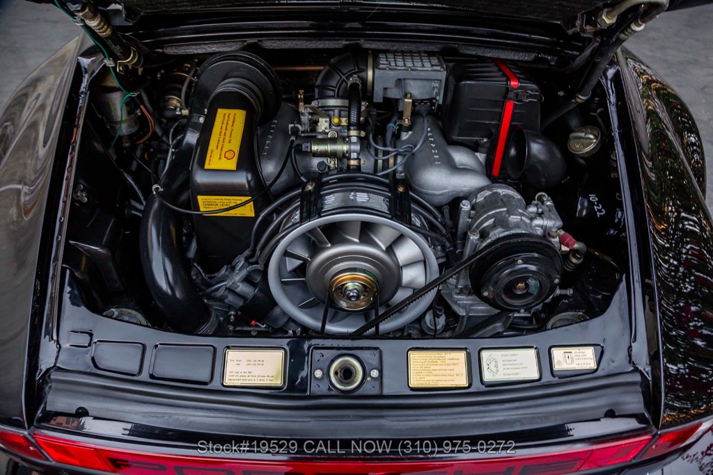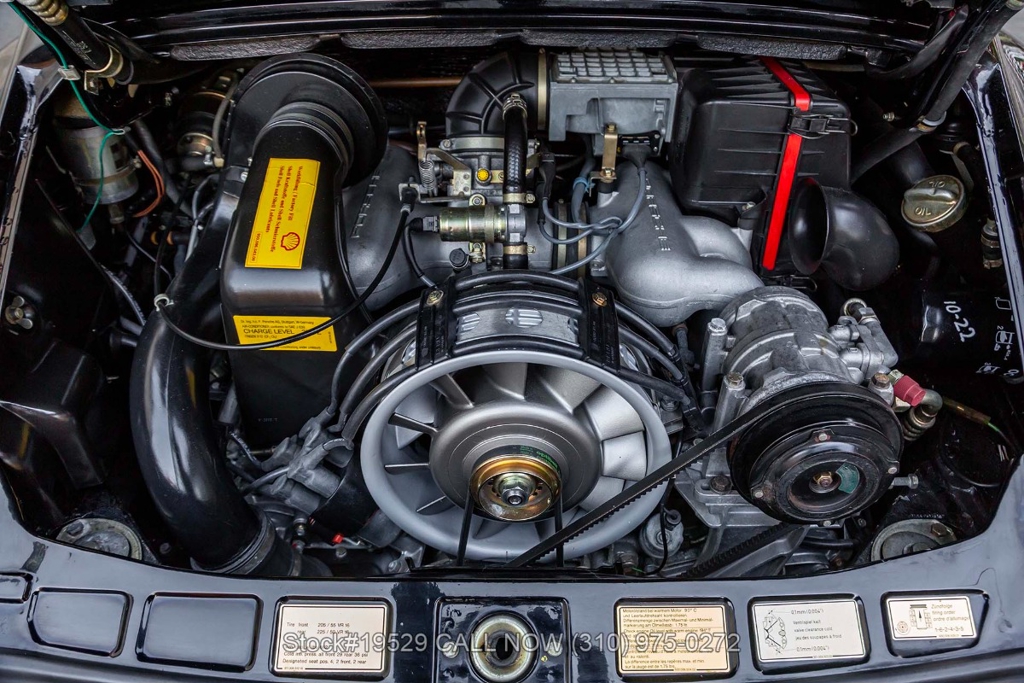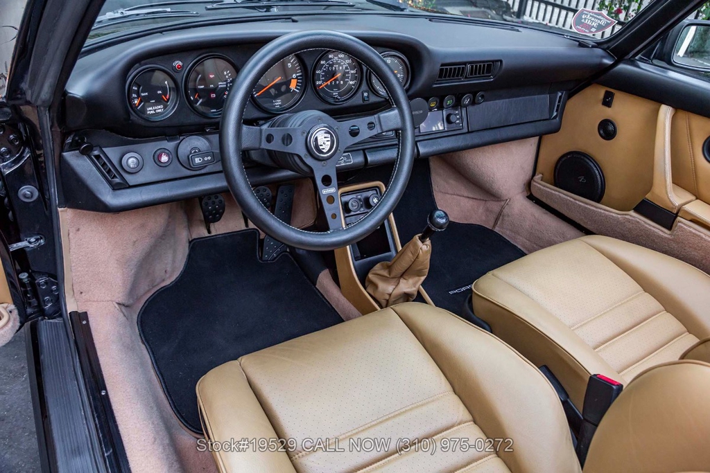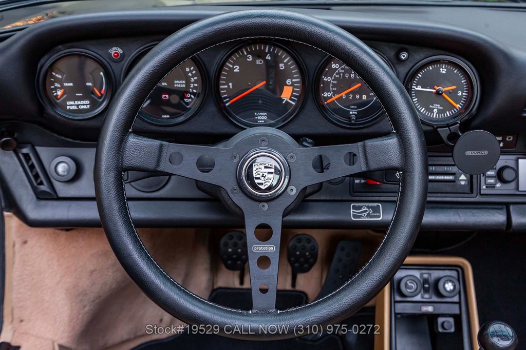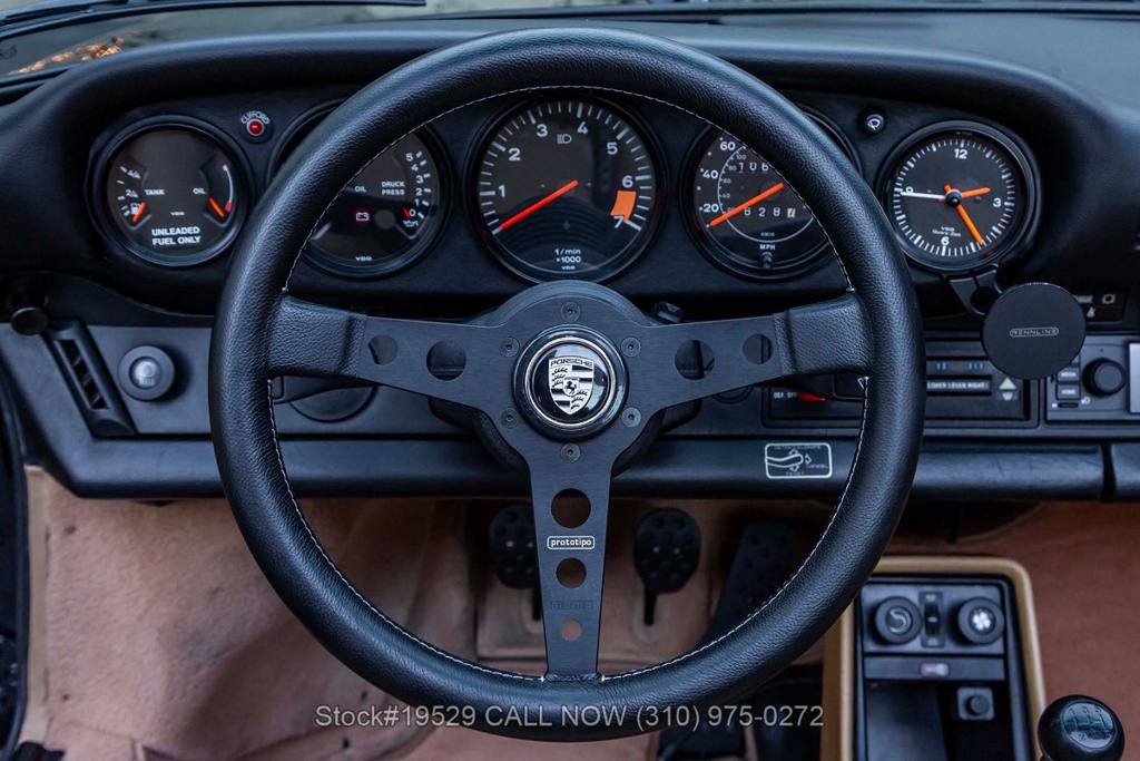 Power is delivered through a 915 5-speed manual transaxle paired with Porsche's well-regarded air-cooled 3.2-liter flat-six. The car is further equipped with Bilstein shocks, four-wheel disc brakes, dual exhaust outlets with polished tips, VDO instrumentation, a removable roof panel, a Targa bar, a wraparound rear glass window, Bosch fog lights, rear rubber bumperettes, and a MOMO Prototipo 3-spoke steering wheel. Completing the exterior presentation are 16-inch Fuchs-style wheels fitted with Nexen tires. A spare tire is also included and stored in the front trunk.
