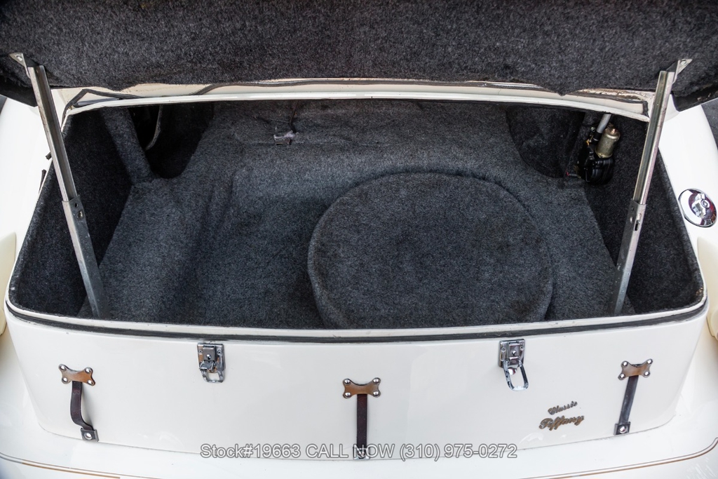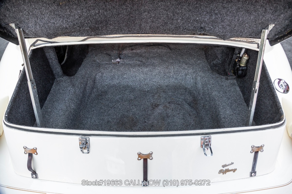 The exterior carries the signature neo-classic look, featuring a heavily chromed front grille with dual badges, including a British-inspired emblem and an eagle crest. Additional period-inspired touches include dual side-mounted spare tire housings on the front fenders, each fitted with matching wire wheel covers. It rides on 15-inch wire wheels with Tiffany-branded center caps wrapped in Uniroyal Tiger Paw thin whitewall tires, reinforcing its vintage-inspired presentation. Lighting has been updated with LED-style headlights and amber fog lights, while the dual-trumpet horn adds a distinct and unmistakable presence.