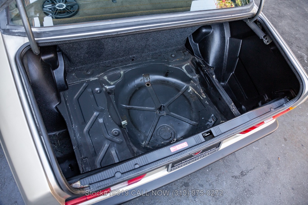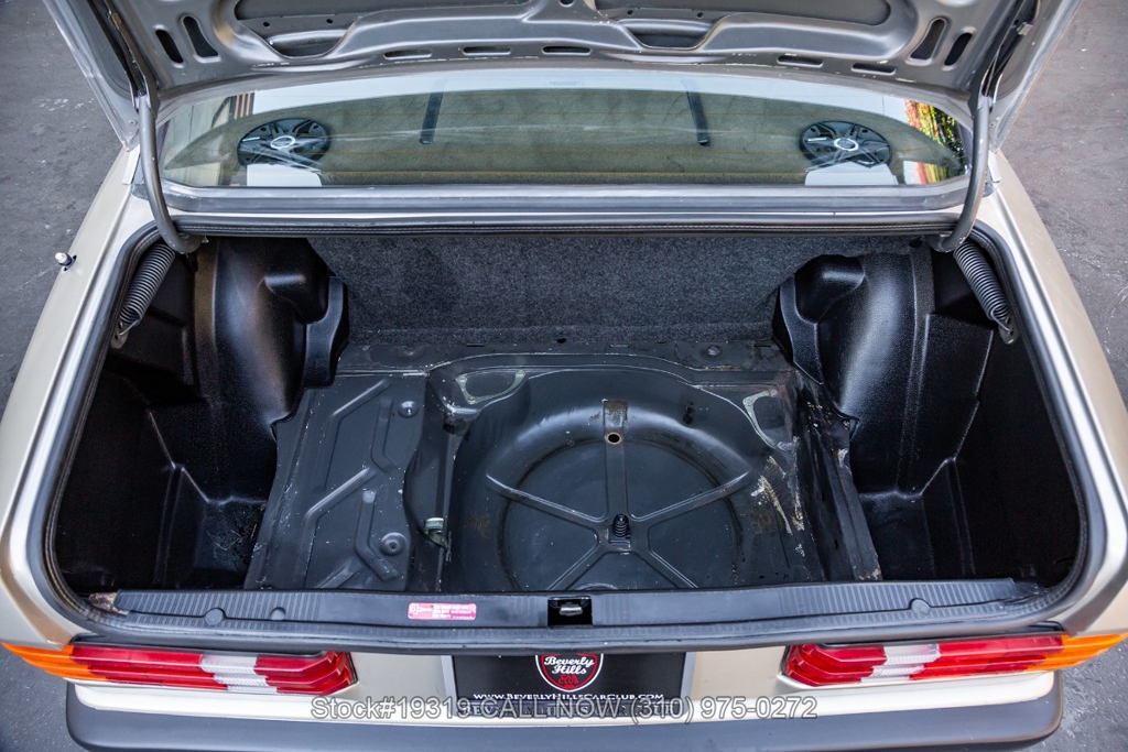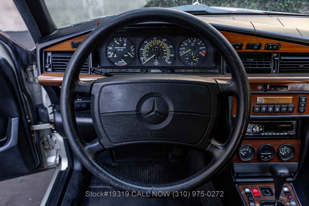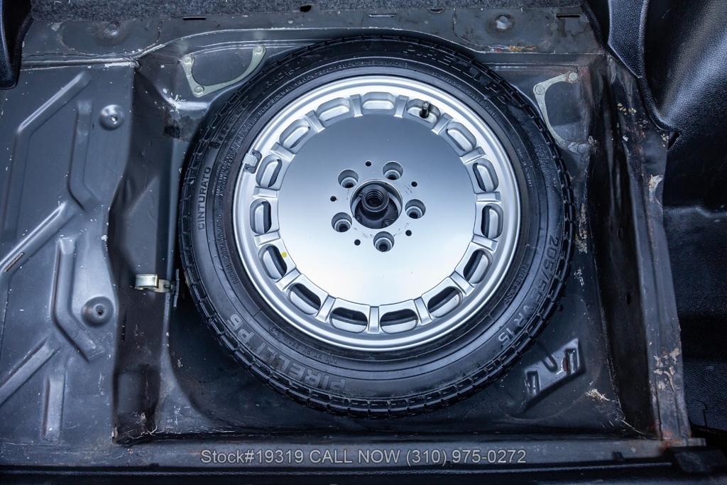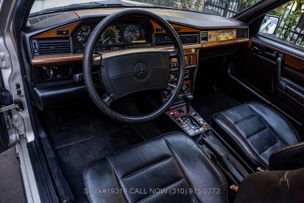 This 190E 2.3 16 is equipped with its Cosworth-designed engine paired to an automatic transmission, along with power steering and four-wheel disc brakes. Exterior details include Bosch headlamps, chrome trim and grille, and twin exhaust finishers. Inside, the cabin features VDO instrumentation, air conditioning, a four-spoke steering wheel, sport seats, power windows, an Alpine radio, door pockets, glove box, center console, dual-side mirrors, and a fender-mounted antenna. The car rides on Dunlop tires wrapped around iconic 16-inch 8-hole alloy wheels, with a jack and full-size spare neatly stored in the trunk.
