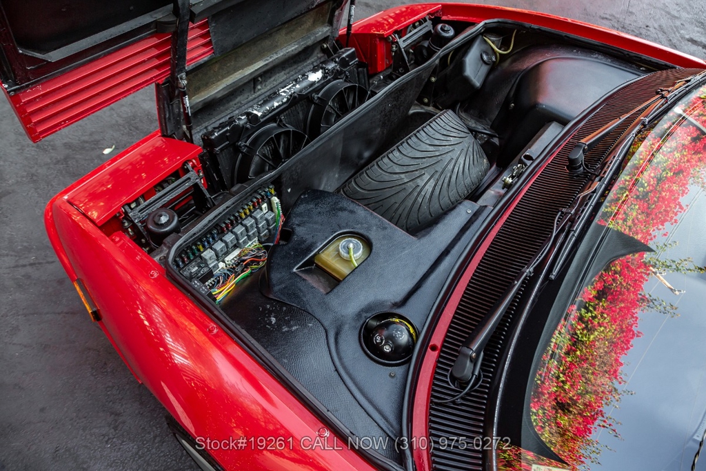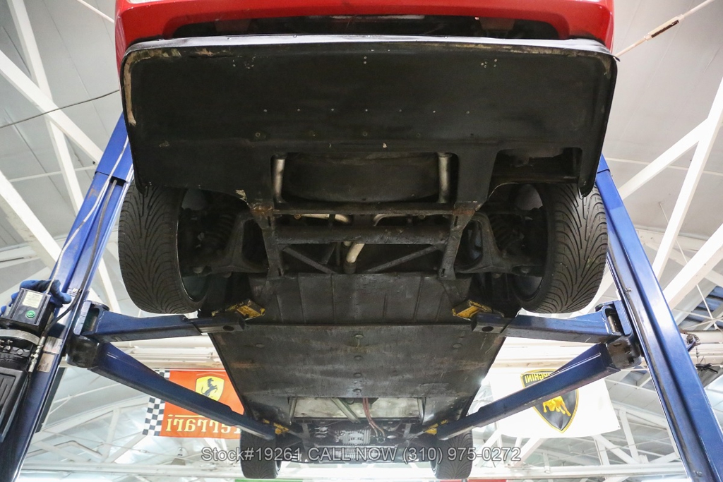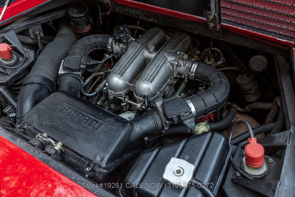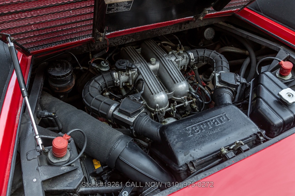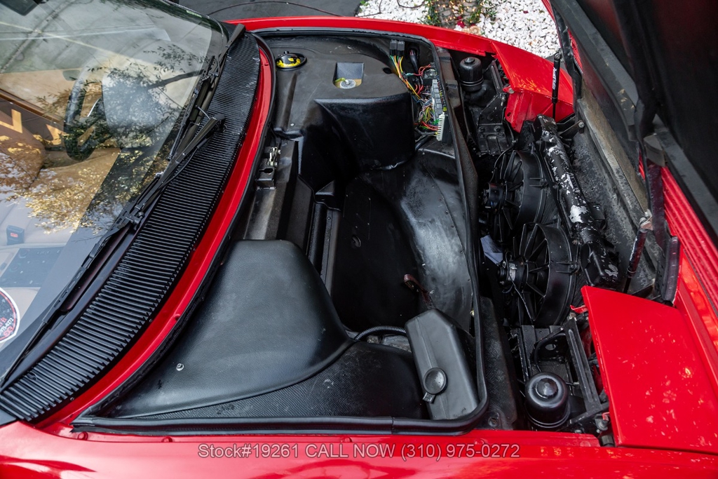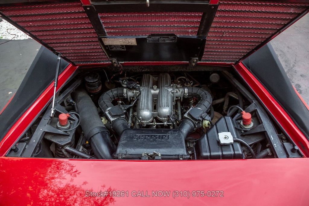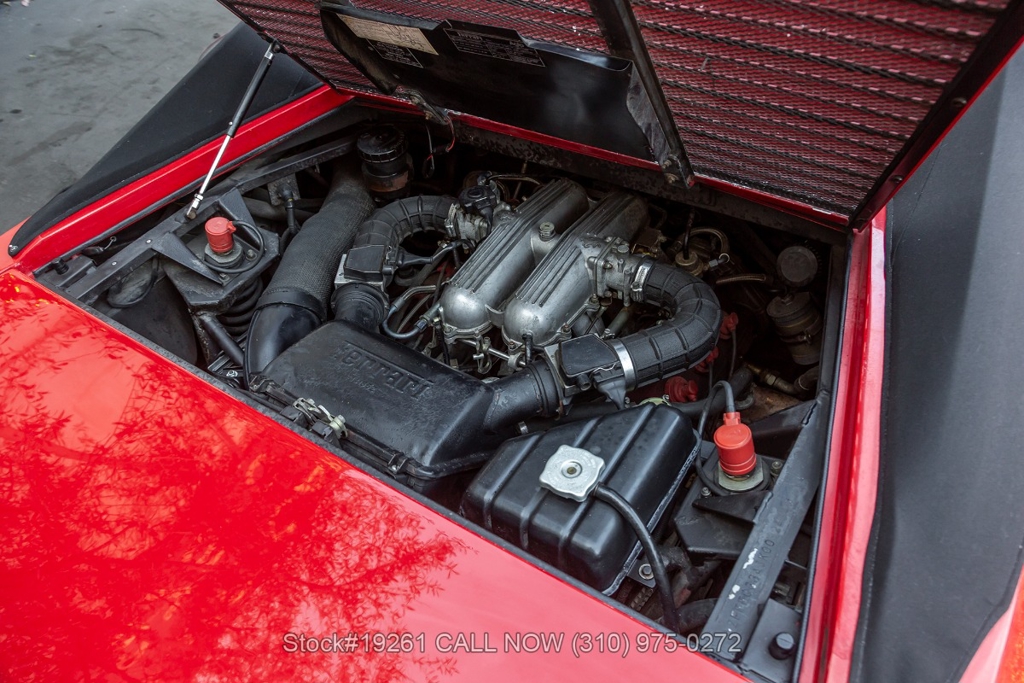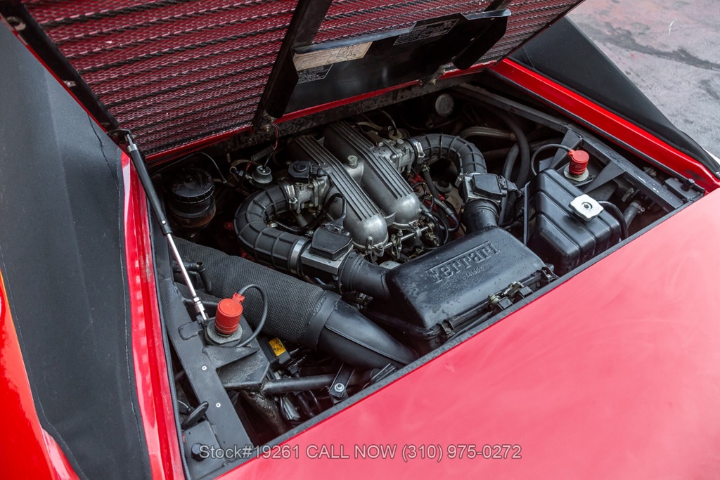 Equipped with a 5-speed manual transmission, V8 engine, four-wheel disc brakes, Brembo-branded brake calipers, power steering, quad exhaust outlets, Veglia instrumentation, black convertible soft top, boot cover, iconic gated manual shifter, retractable headlights, Carello front fog lights, side air intakes, Pininfarina badges, Nexen tires, 18-inch five-spoke alloy wheels with Ferrari-branded center caps, and a full-size spare tire fitted in the front trunk. Convenience features include a pair of contoured bucket seats with side bolsters, air conditioning, power windows, dual-side rearview mirrors, center console, a 3-spoke Sparco racing steering wheel, and a Kenwood radio.