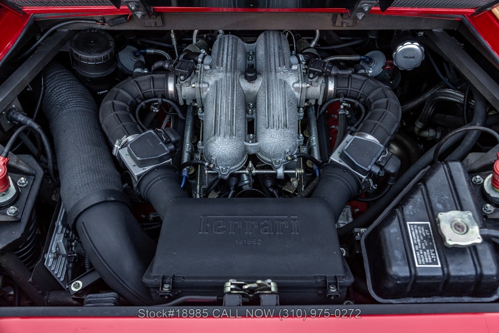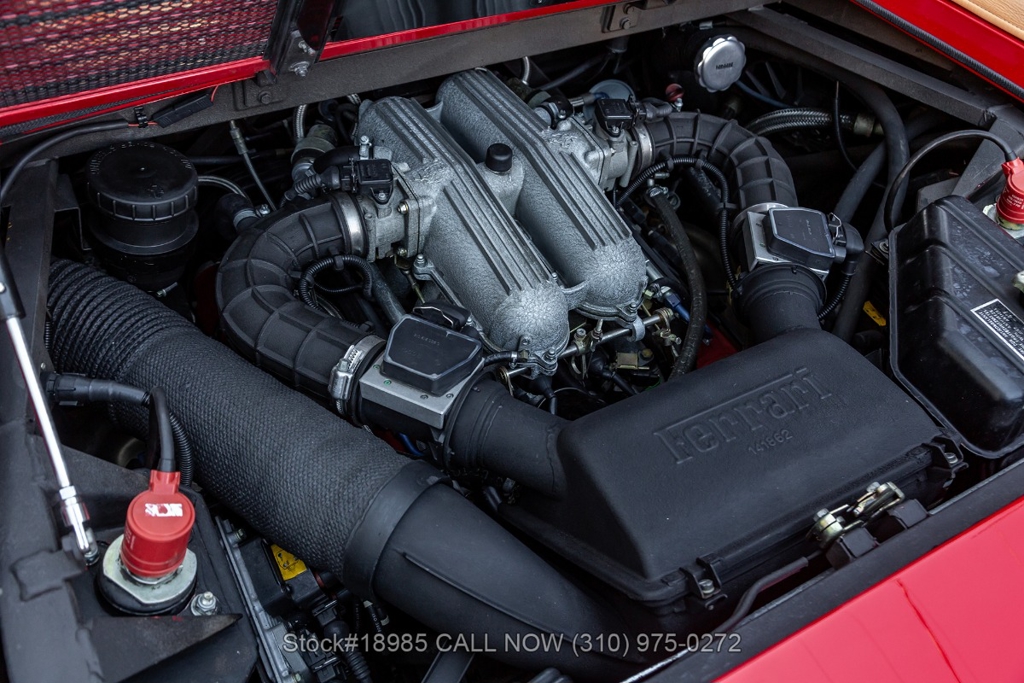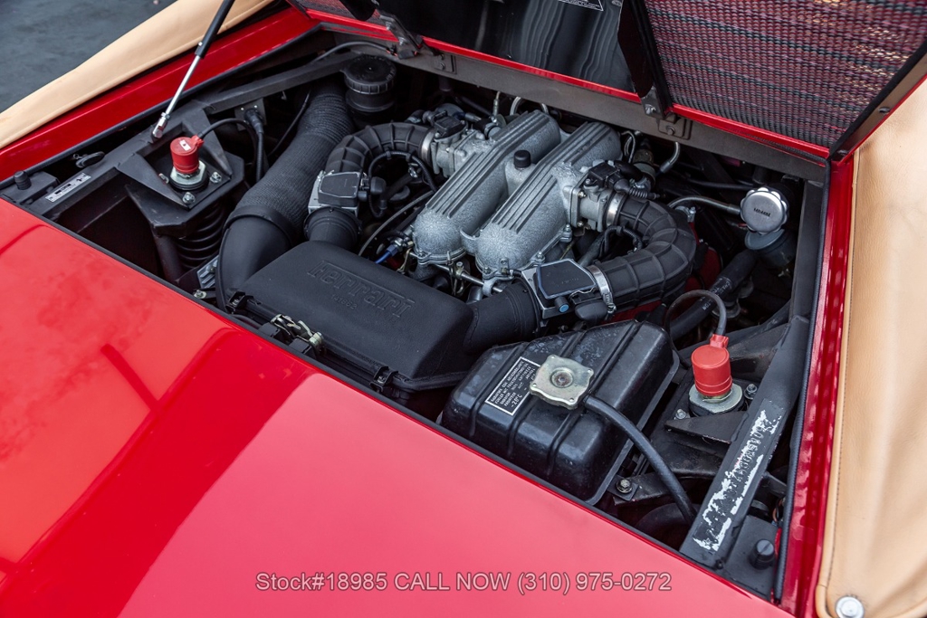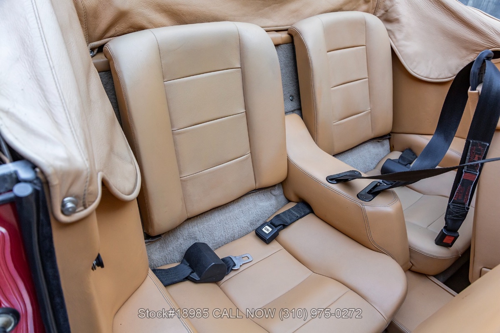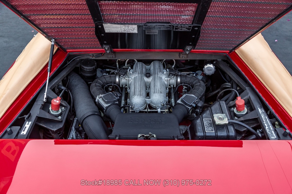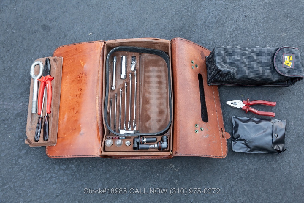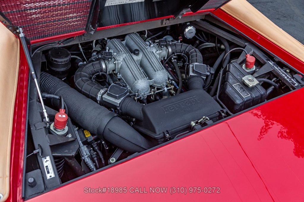 Equipped with a 5-speed manual transmission, V8 engine, four-wheel disc brakes, power steering, quad exhaust outlets, Veglia instrumentation, black convertible soft top, boot cover, a gated shifter, retractable headlights, side air intakes, Pininfarina badges, Pirelli tires, 18-inch alloy wheels with Ferrari-branded center caps, full-size spare tire, and a Schedoni leather tool kit. Convenience features include air conditioning, power windows, bucket seating, dual-side rearview mirrors, center console, door pockets, tilt 3-spoke steering wheel, Kenwood radio, and Carello-branded front fog lights.