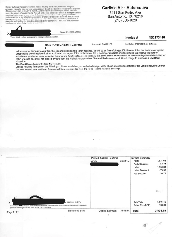 Powered by a 3.6L flat-six engine paired with a 6-speed manual transaxle, this Carrera delivers a balanced and engaging driving experience. Braking is handled by four-wheel disc brakes, providing confident stopping power. Exterior details such as integrated bumper with fog lights, dual stainless-steel tailpipe tips, and the roof edge spoiler give the car a purposeful yet timeless look, while the 17-inch Cup style wheels with "Carrera 4" center caps complete its iconic stance. Michelin tires are currently fitted, adding to overall drivability. Includes a Vredestein Space Master spare tire fitted in the front trunk.