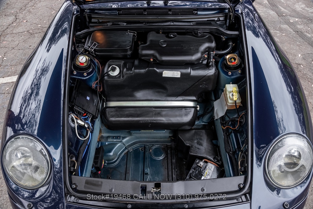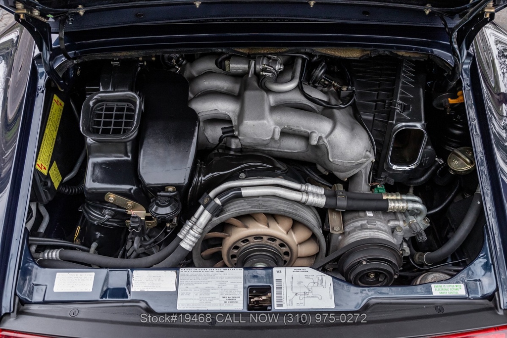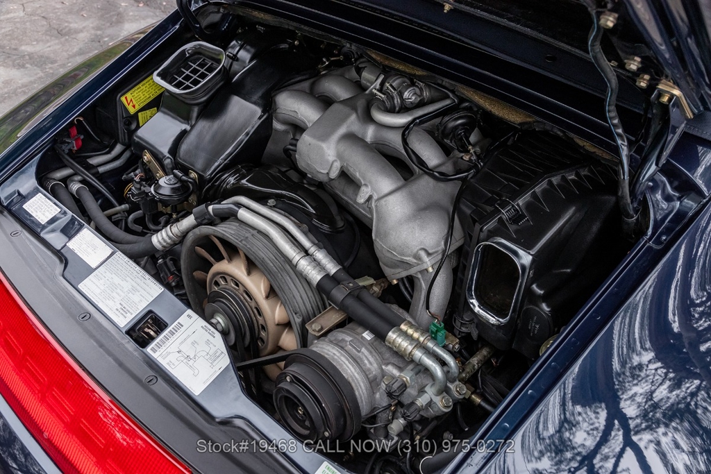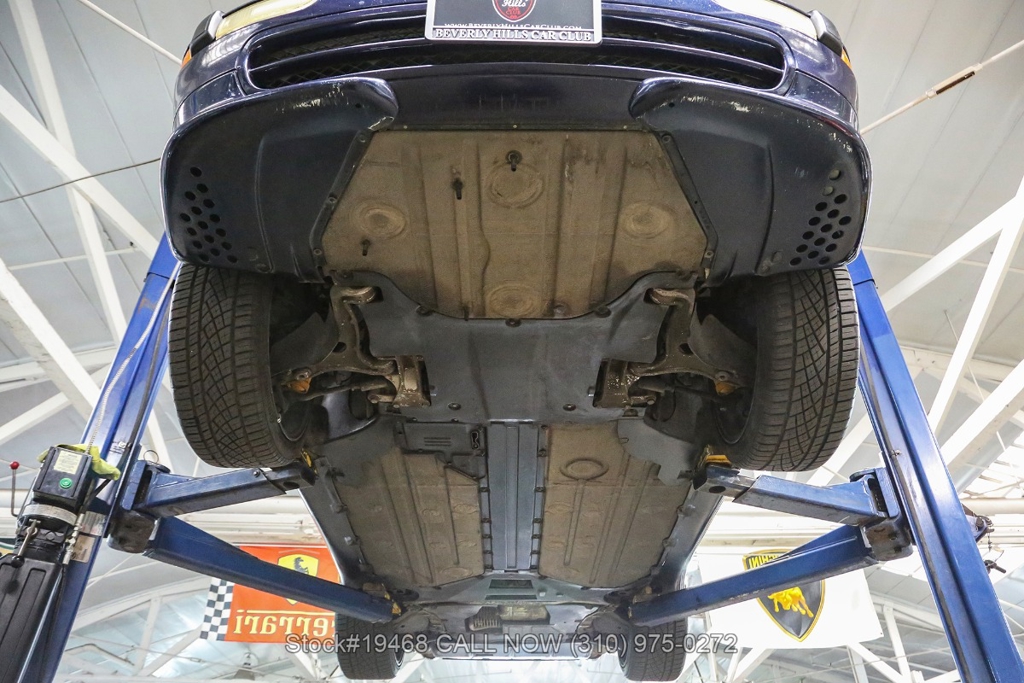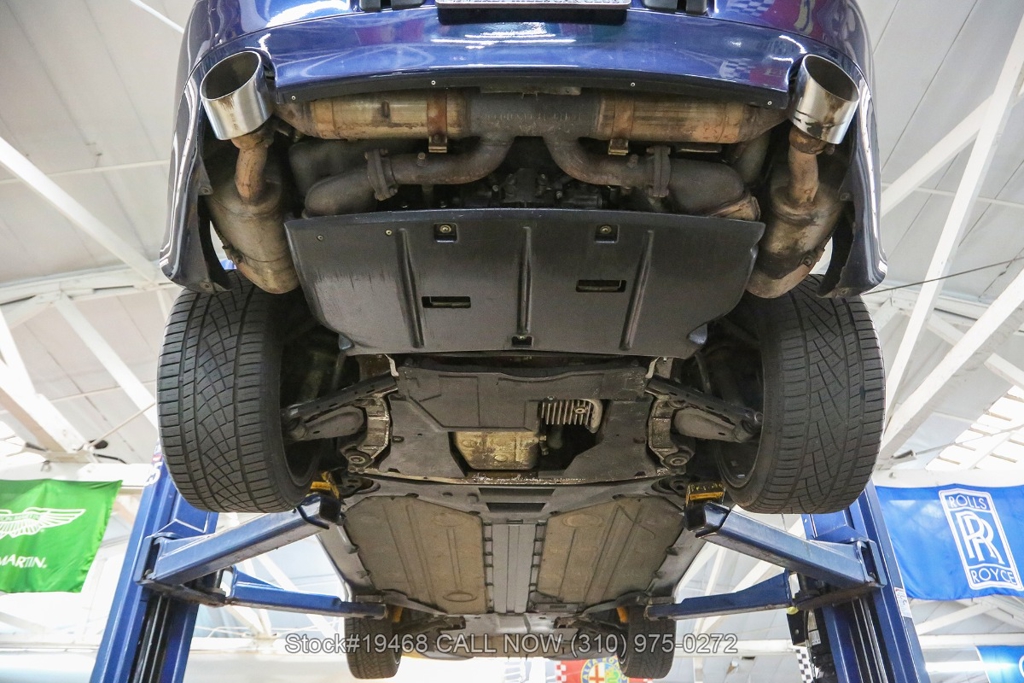 Power comes from Porsche's 3.6-liter air-cooled flat-six engine, paired with a Tiptronic transmission that delivers a direct and engaging driving experience. Braking is handled by four-wheel ventilated disc brakes, while additional features include dual exhaust outlets, VDO instrumentation, integrated bumpers with Hella fog lights, and a 3-spoke steering wheel. The car rides on 18-inch "Turbo "Twist"-style wheels with a high-polish chrome finish fitted with Continental tires, which complement the Ocean Blue Metallic paint nicely.