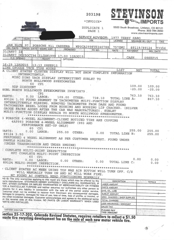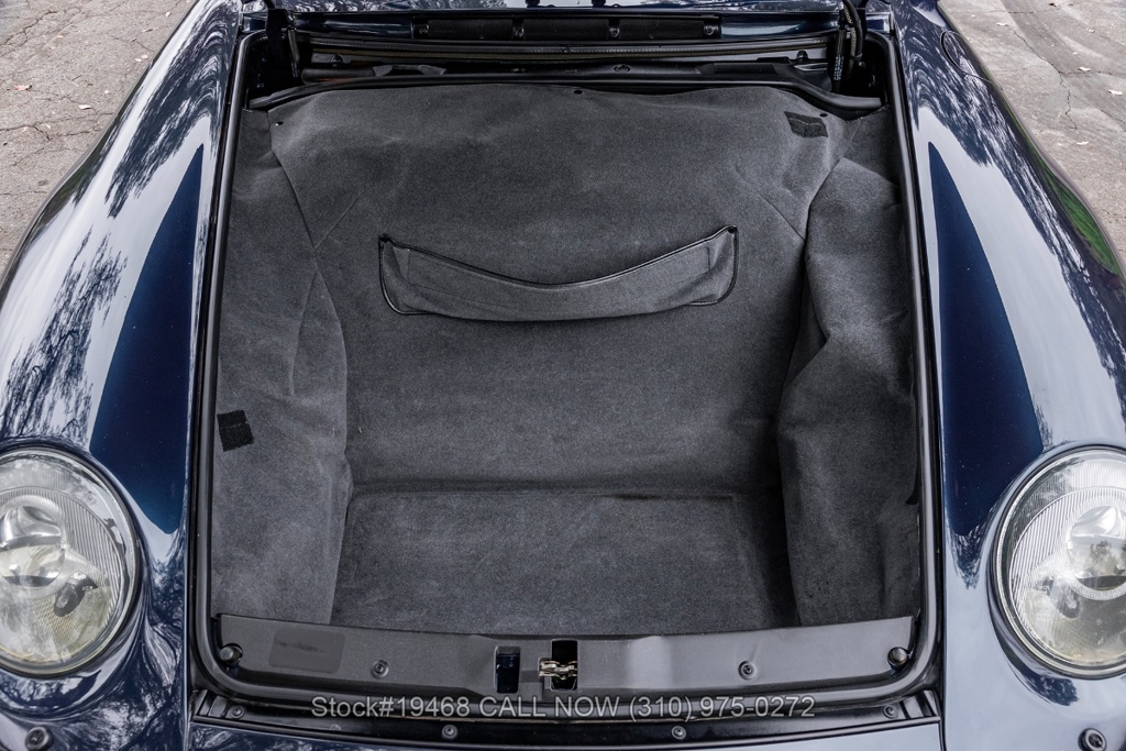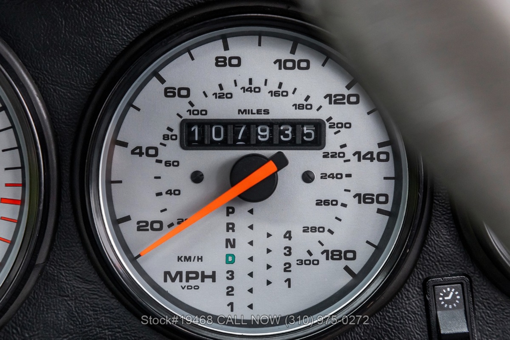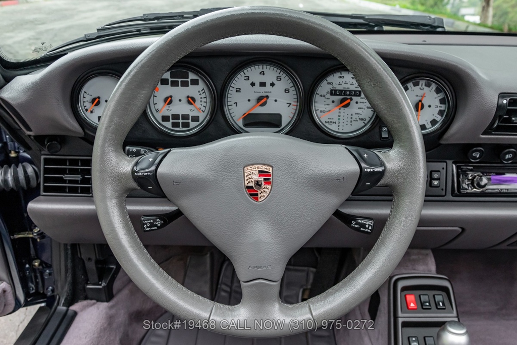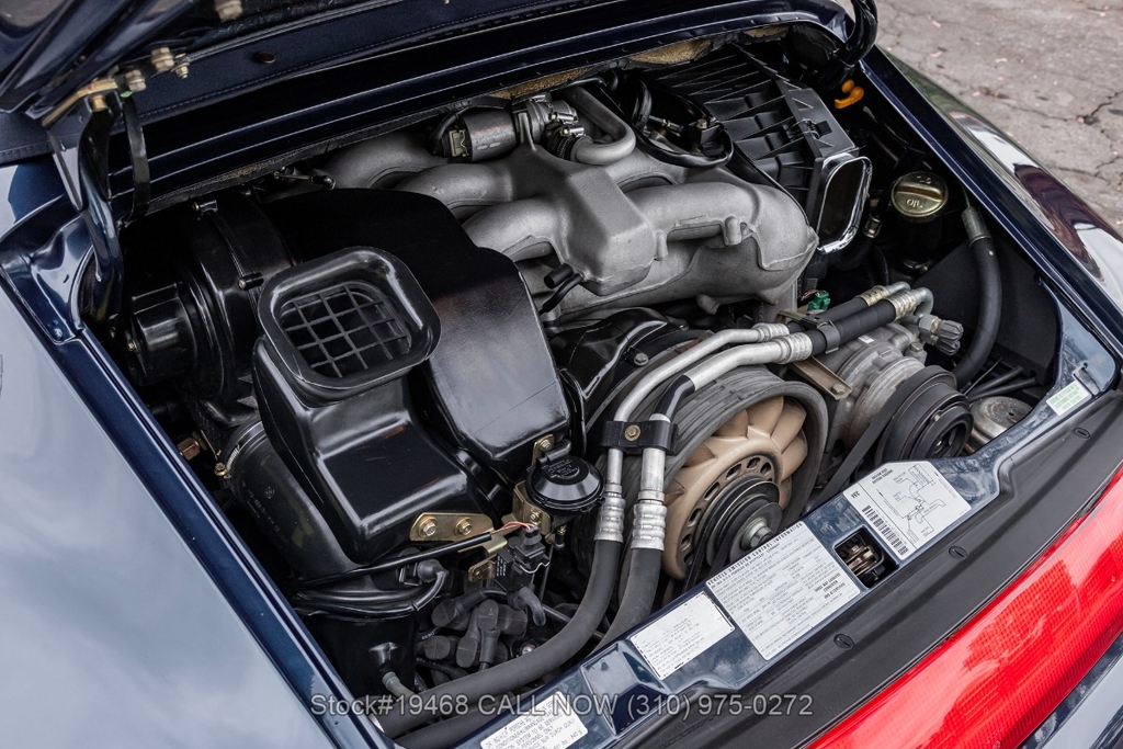 Power comes from Porsche's 3.6-liter air-cooled flat-six engine, paired with a Tiptronic transmission that delivers a direct and engaging driving experience. Braking is handled by four-wheel ventilated disc brakes, while additional features include dual exhaust outlets, VDO instrumentation, integrated bumpers with Hella fog lights, and a 3-spoke steering wheel. The car rides on 18-inch "Turbo "Twist"-style wheels with a high-polish chrome finish fitted with Continental tires, which complement the Ocean Blue Metallic paint nicely.