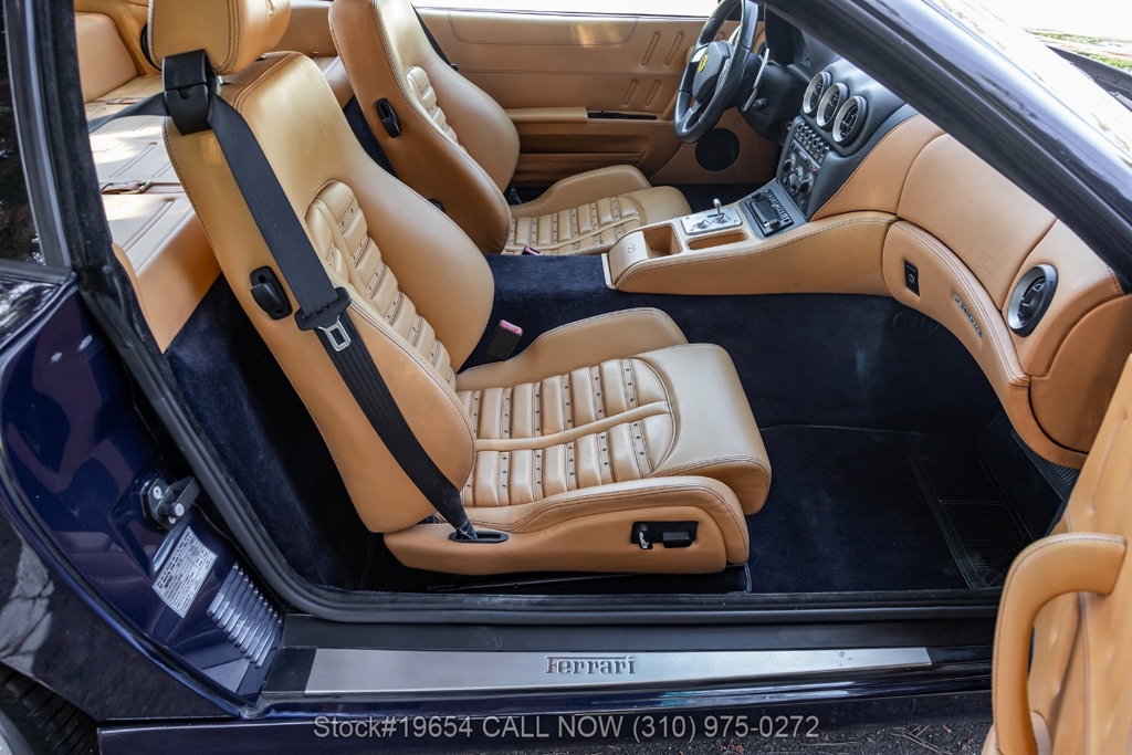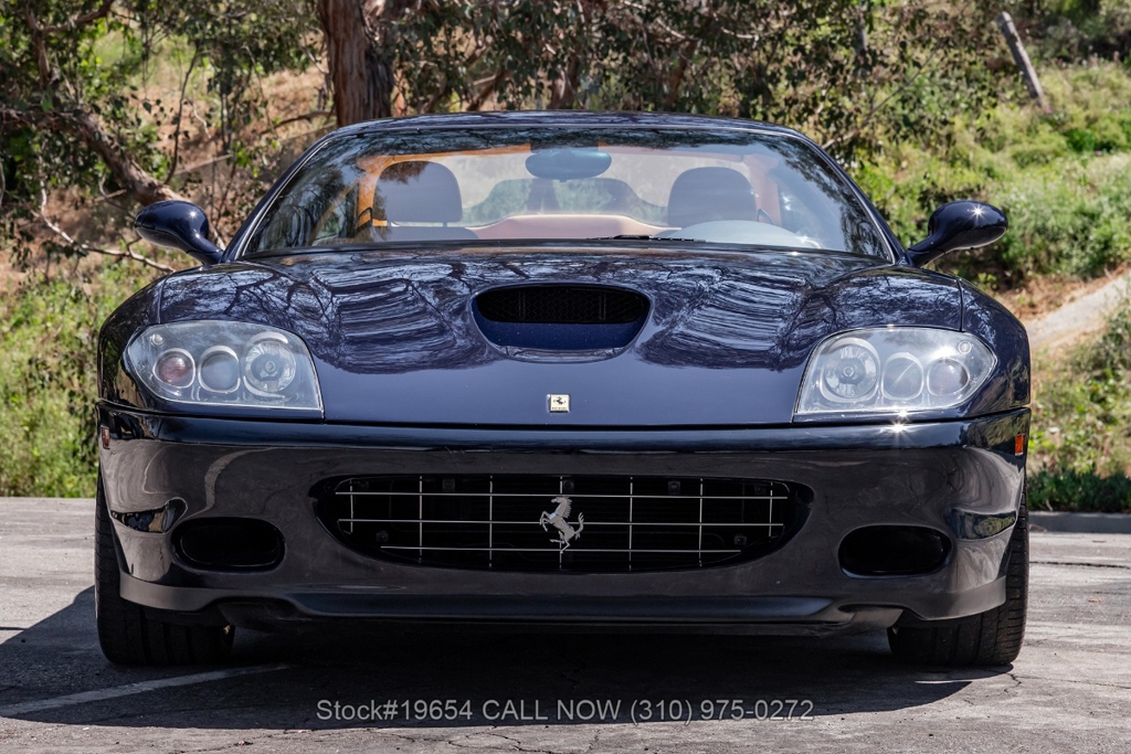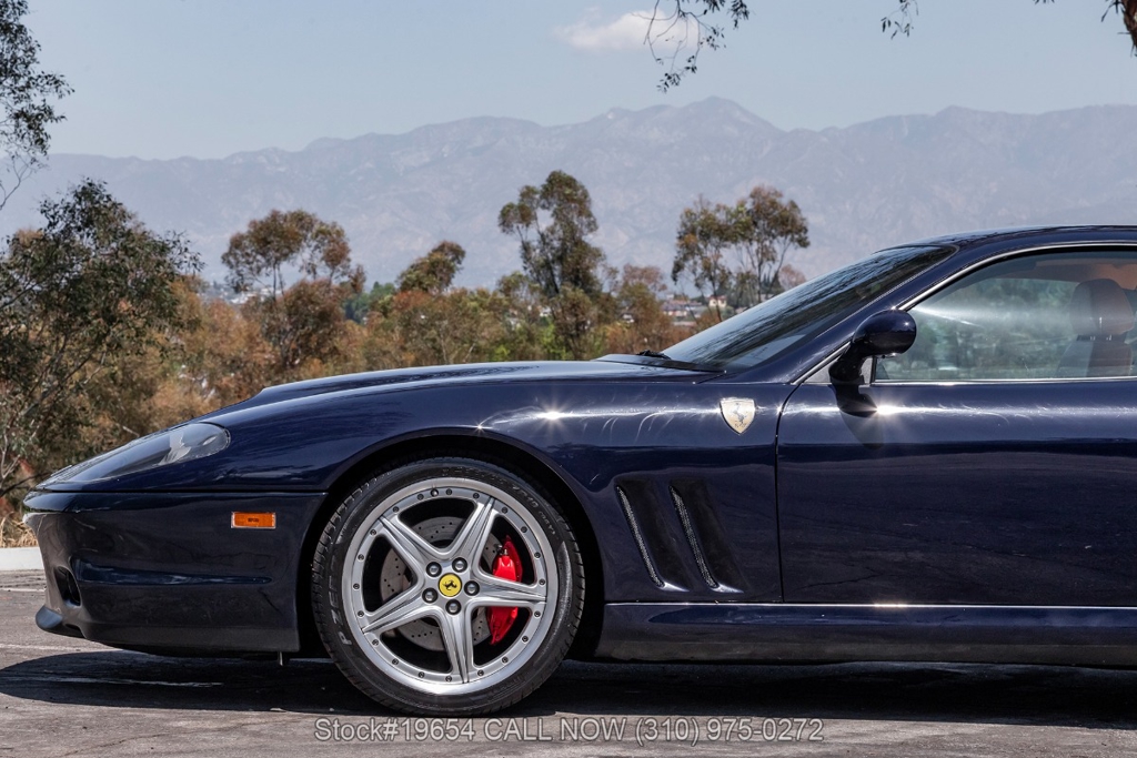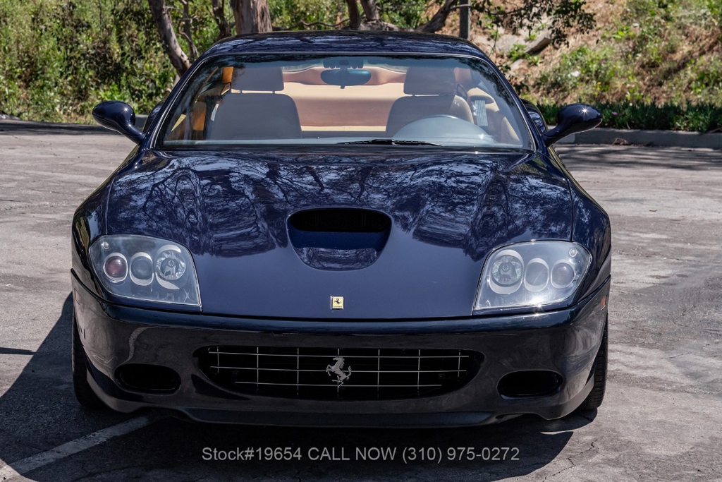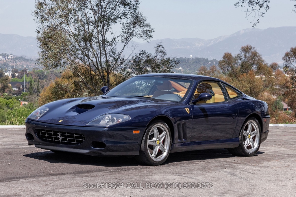 Introducing this low-mileage 2002 Ferrari 575M Maranello, showing 24,309 miles on the odometer. Finished in its factory color Blu Pozzi, the exterior is paired with tan Daytona-style seats, giving the car a traditional and understated Ferrari color combination. As a front-engine grand tourer, the 575M Maranello blends long-distance comfort with the performance expected from a V12 Ferrari, offering a balanced driving experience rather than an all-out track focus.