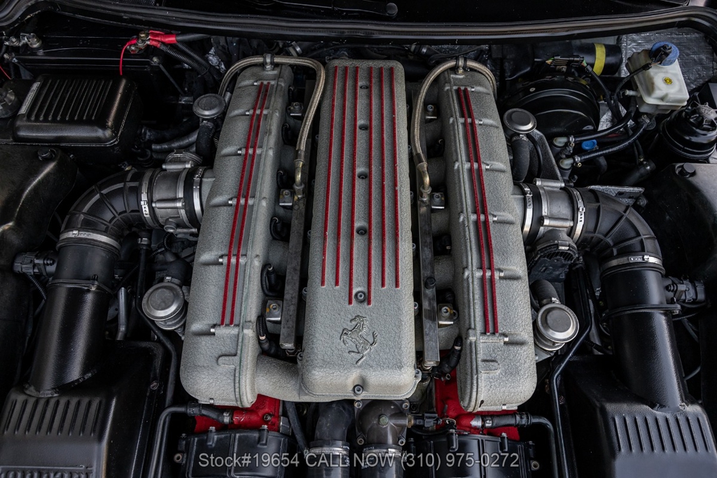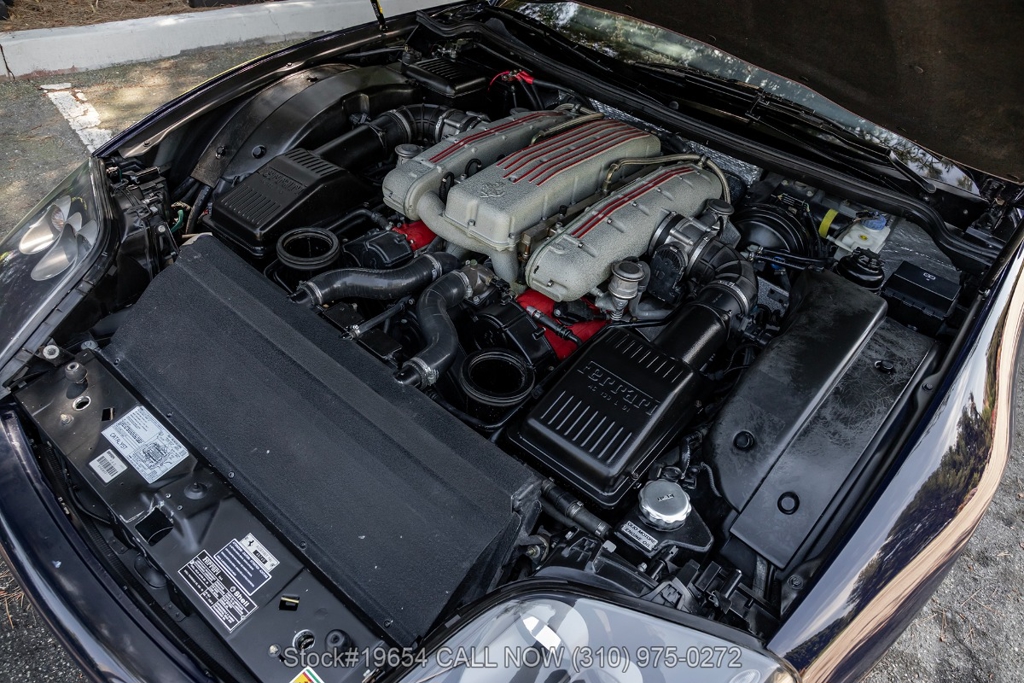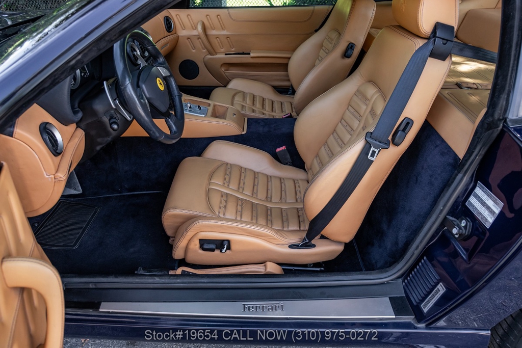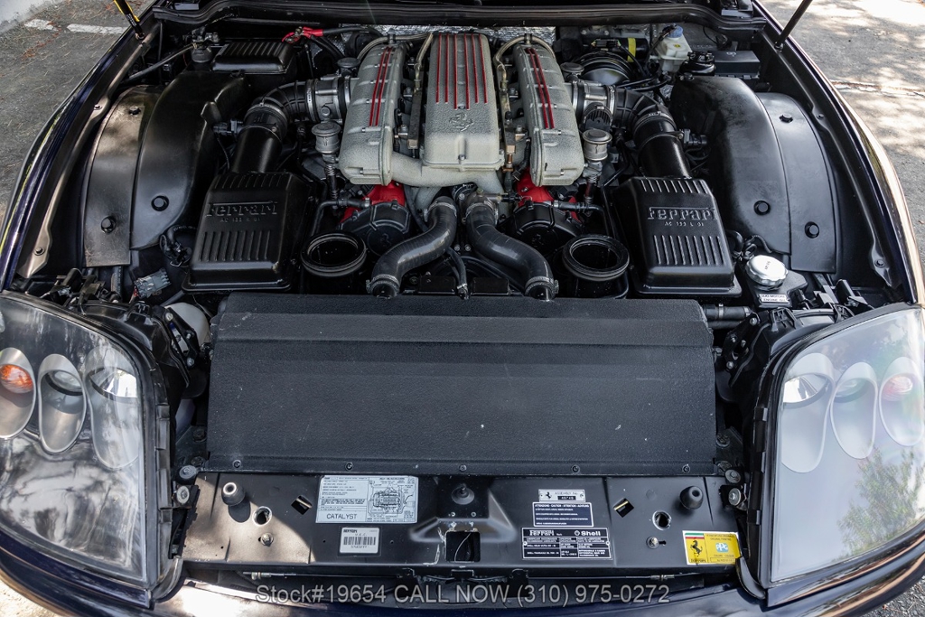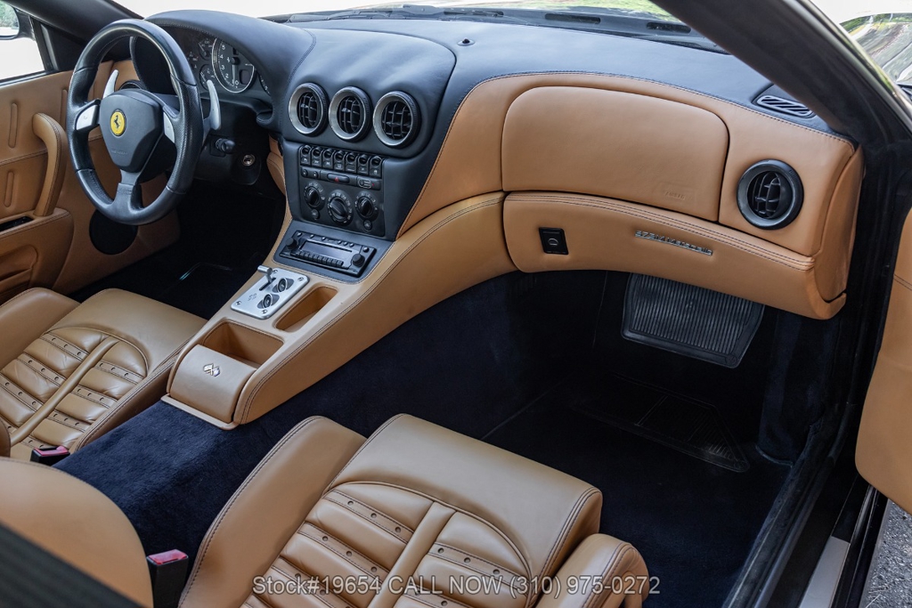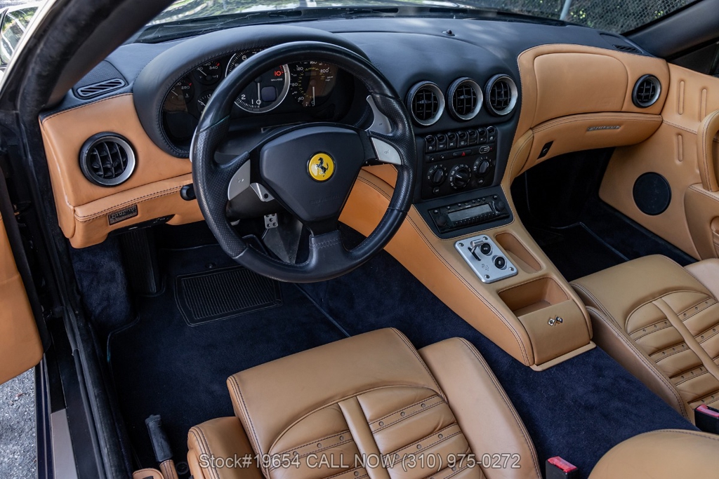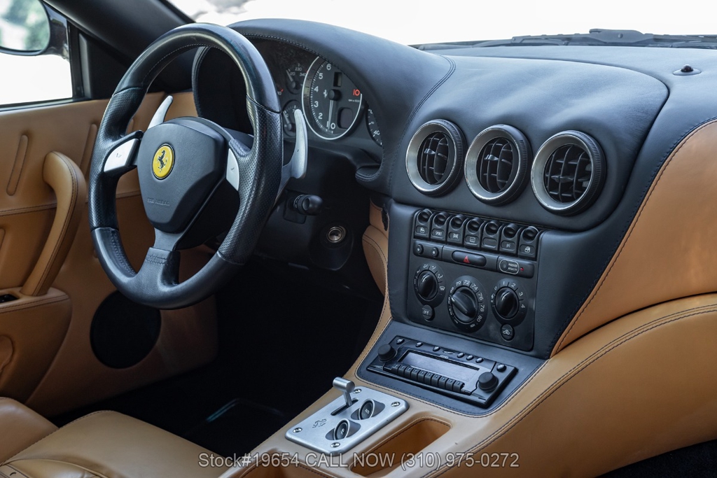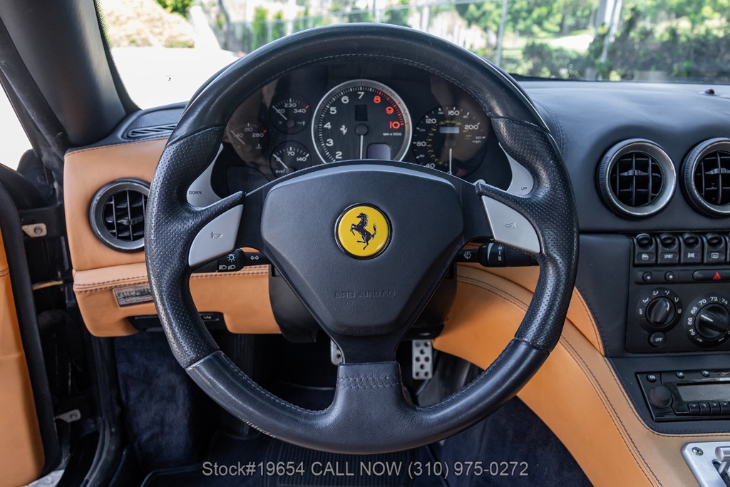 Power comes from a 5.7-liter V12 engine paired with a paddle-shifted F1-style automatic transmission, delivering power to the rear wheels. The car is equipped with four-wheel disc brakes with Ferrari-branded calipers, Scuderia Ferrari fender shields, quad exhaust outlets, and 19-inch alloy wheels mounted with Pirelli P Zero tires. Additional exterior details include quad taillights and subtle aerodynamic shaping that reflects Ferrari's early-2000s design language. Inside, amenities include air conditioning, power windows, power mirrors, and a center console designed with driver-focused controls.