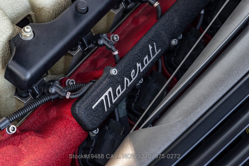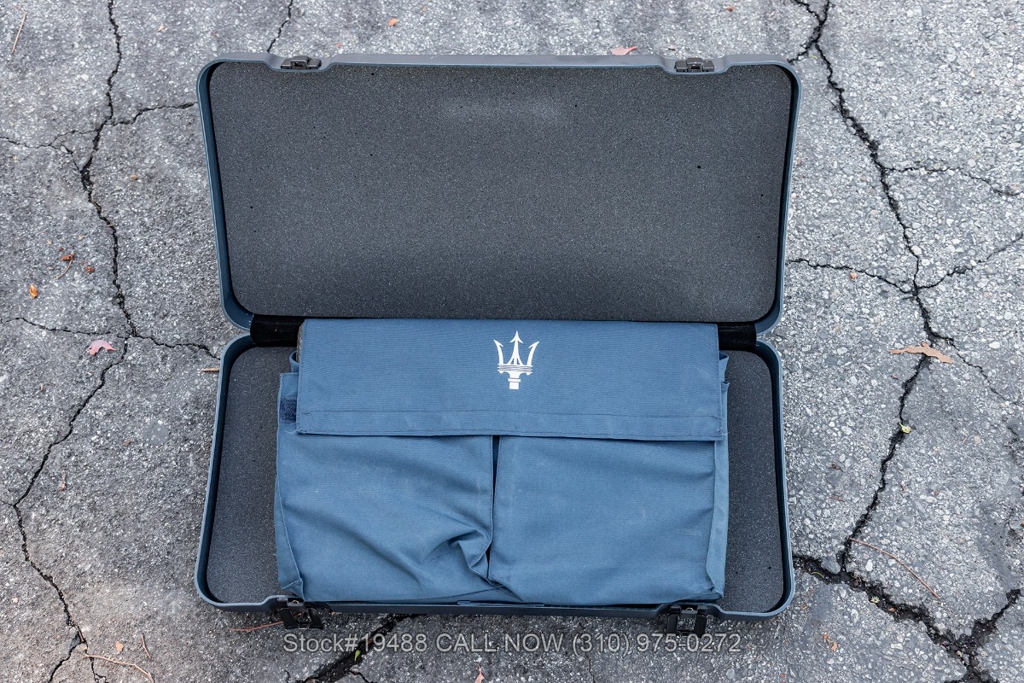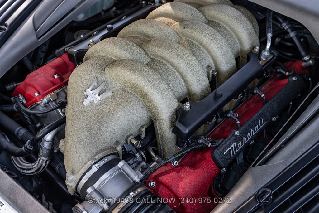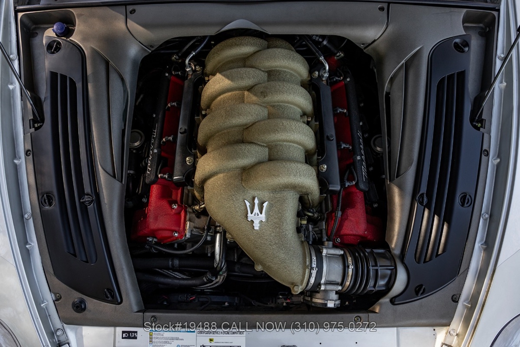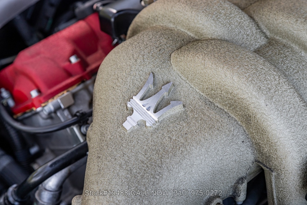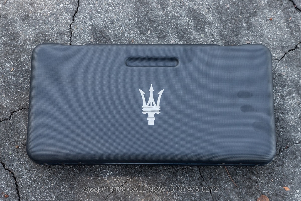 Powered by a 4.2L F136 V8 paired with an automatic Cambiocorsa transmission and column-mounted shift paddles. Additional features include ventilated disc brakes with silver calipers, quad exhaust outlets, 3-spoke steering wheel, embroidered seats, Maserati door sill plates, Jaeger gauges, roll hoops, Carello headlamps and fog lights, Pirelli tires, 19-inch Vellano alloy wheels, and a tool kit housed in a briefcase-style case.