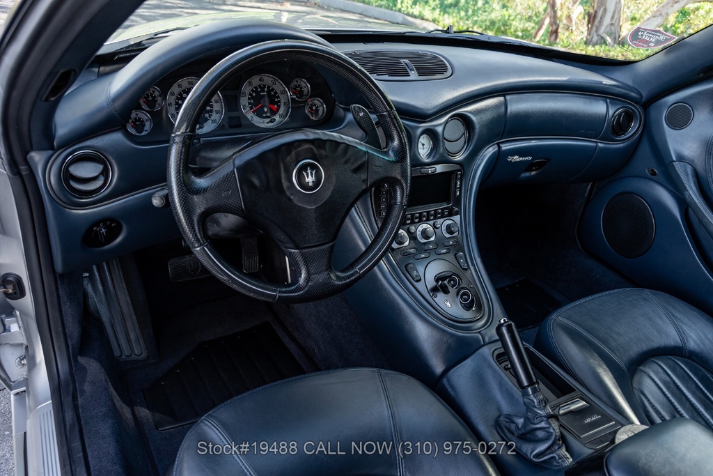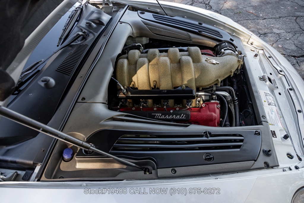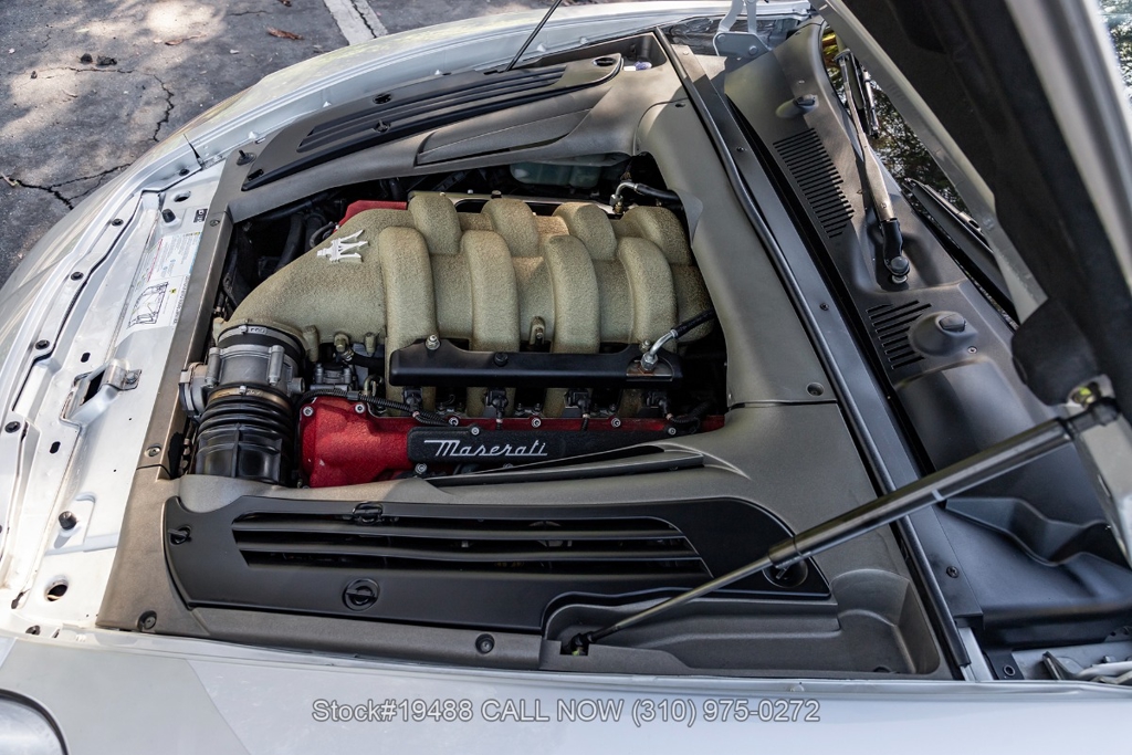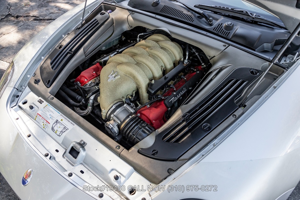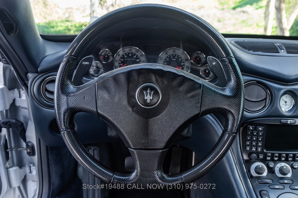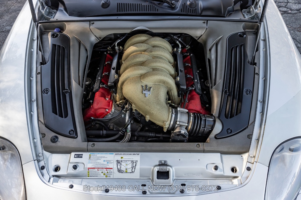 Powered by a 4.2L F136 V8 paired with an automatic Cambiocorsa transmission and column-mounted shift paddles. Additional features include ventilated disc brakes with silver calipers, quad exhaust outlets, 3-spoke steering wheel, embroidered seats, Maserati door sill plates, Jaeger gauges, roll hoops, Carello headlamps and fog lights, Pirelli tires, 19-inch Vellano alloy wheels, and a tool kit housed in a briefcase-style case.