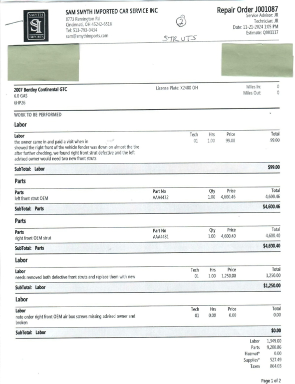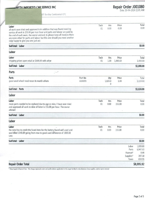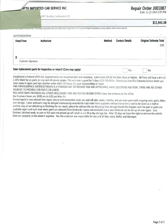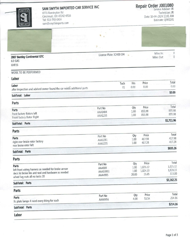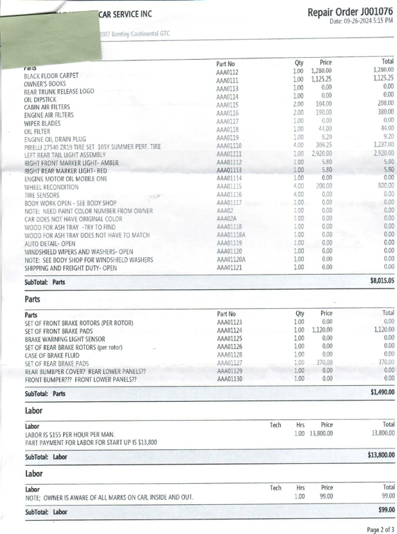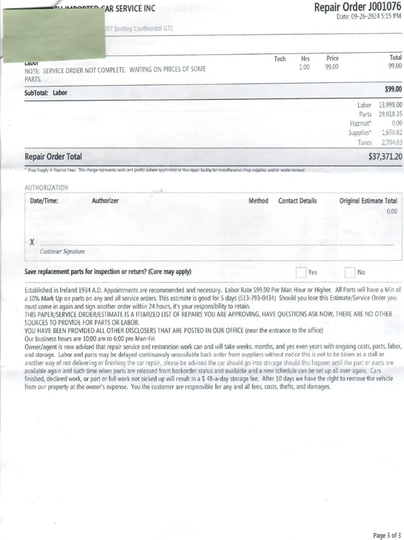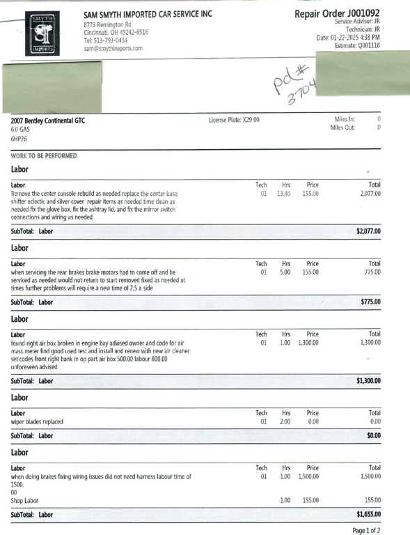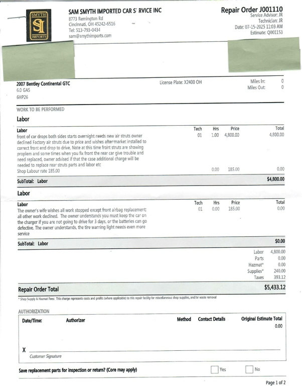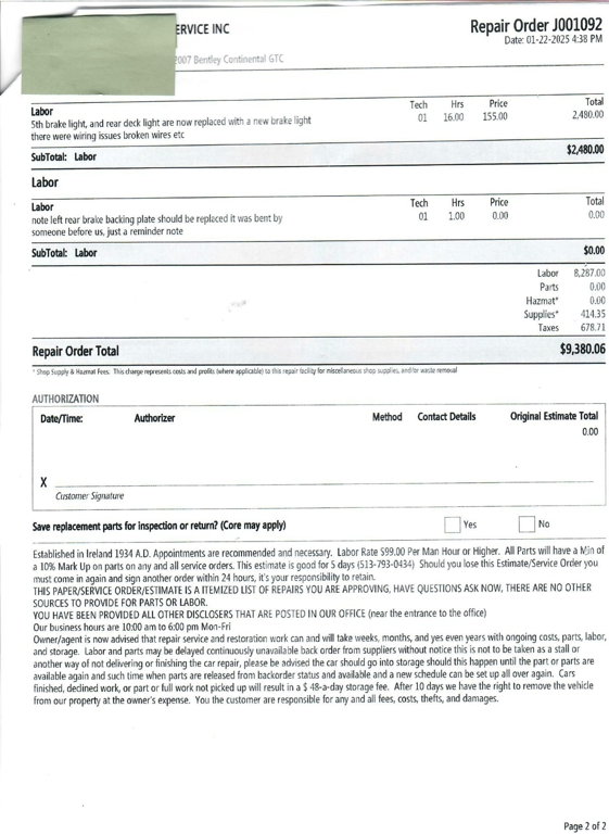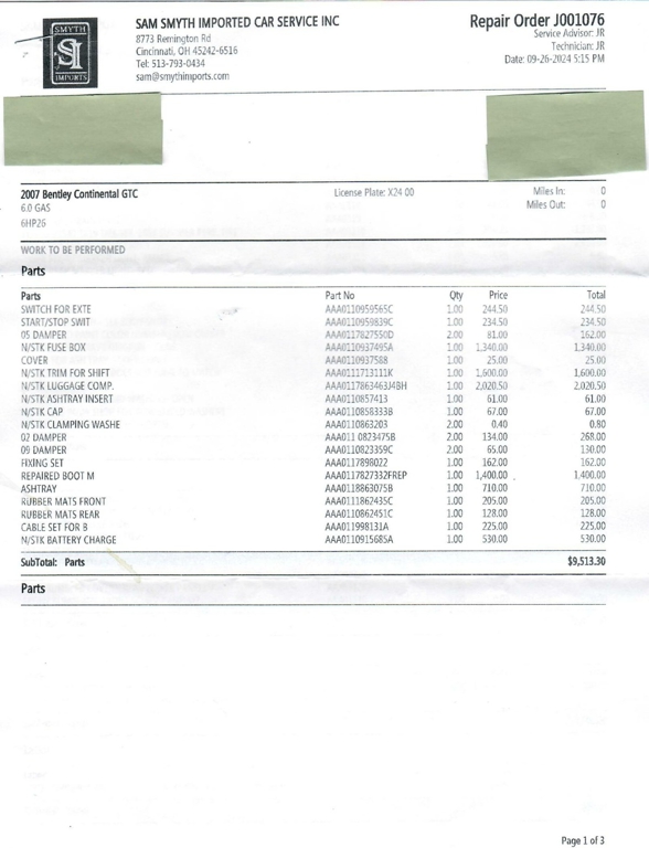 Between September 2024 and July 2025, this Bentley Continental GTC underwent $73,121.68 in comprehensive mechanical and cosmetic refurbishments, including a full air suspension replacement, complete front and rear brake service with factory rotors, new Pirelli tires, center console and interior trim restoration, and extensive electrical and lighting repairs.