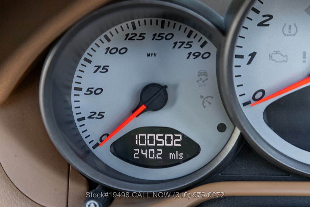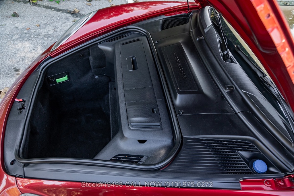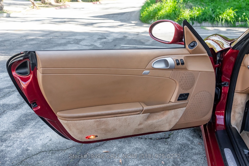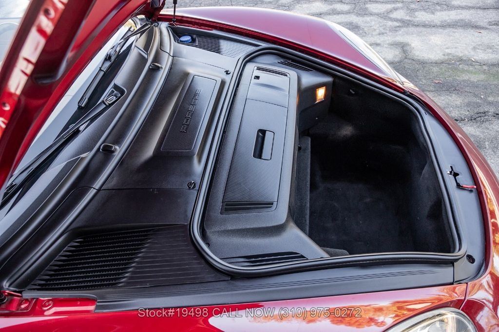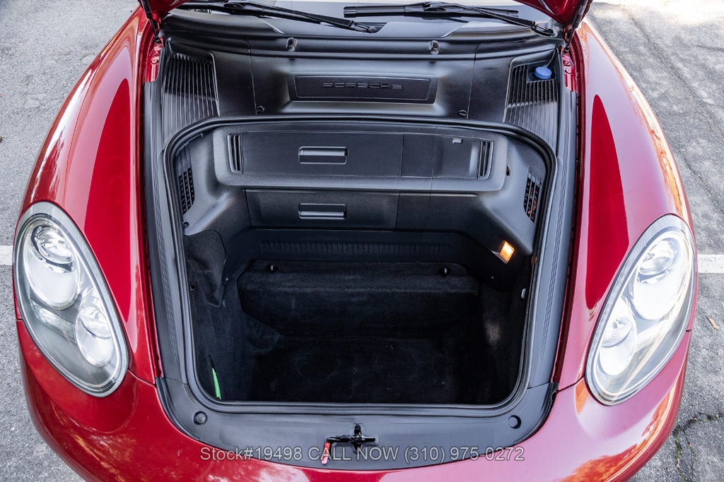 Equipped with a six-speed manual transaxle, power steering, four-wheel disc brakes, red Porsche-branded calipers, twin exhaust tips, side air intakes, a three-spoke steering wheel with the Porsche crest, and Michelin tires mounted on 5-spoke alloy wheels. Comfort and convenience features include air conditioning, cruise control, power-adjustable seats, power windows, and power side mirrors, complemented by practical storage in door pockets, a glove compartment, and center console.
