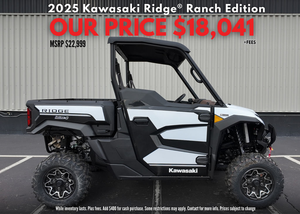 Price: $15,999.00 2025 Kawasaki RIDGE Ranch Edition 999 Year: 2025 Model: RIDGE Make: Kawasaki Condition: New Contact Us Credit Application