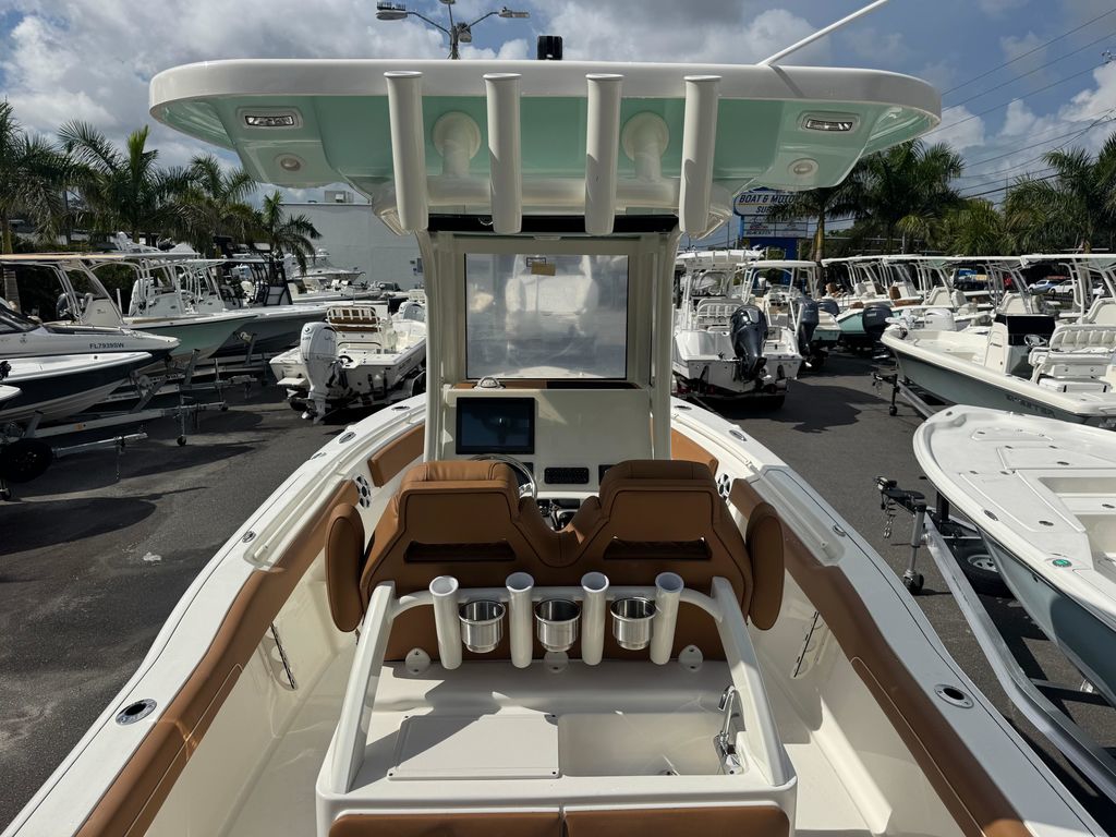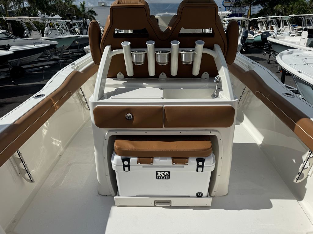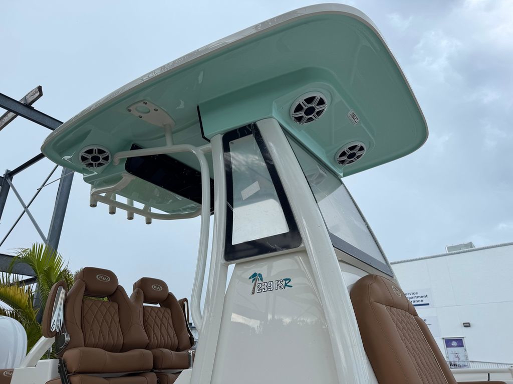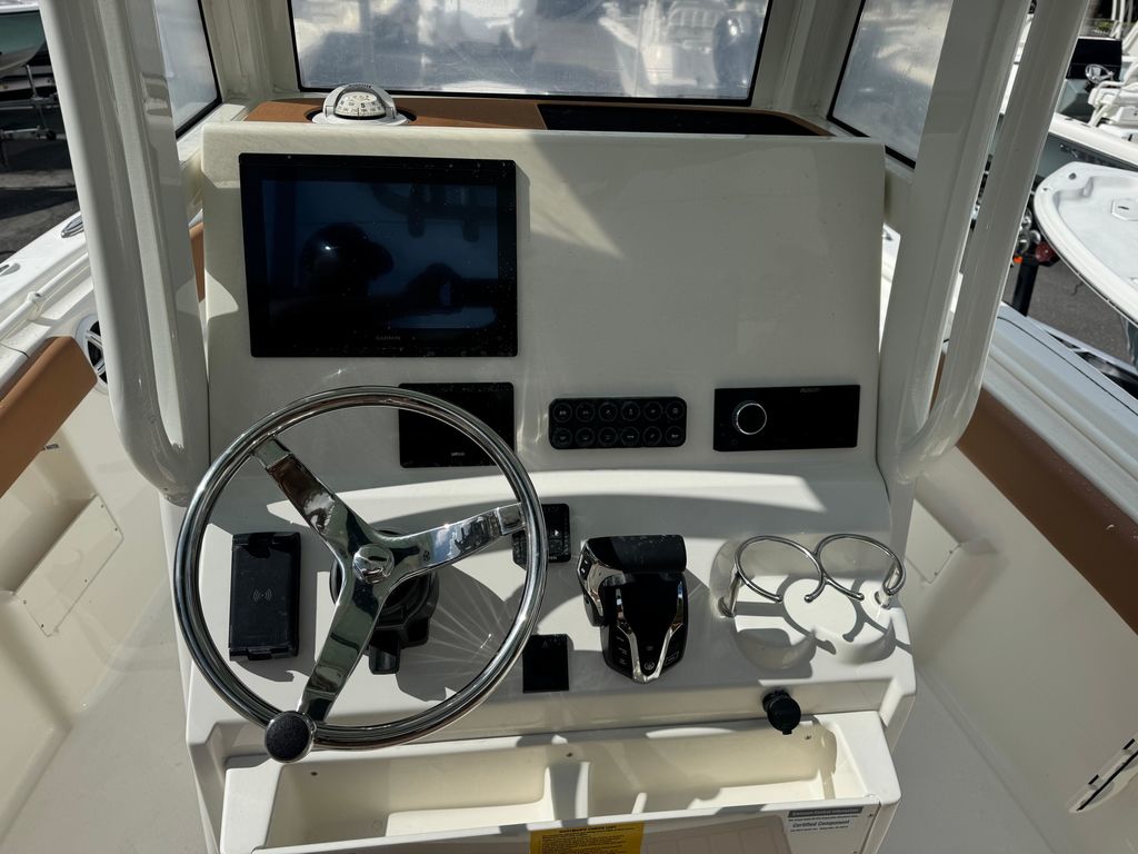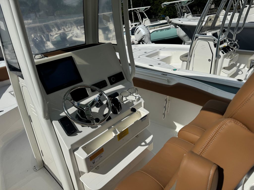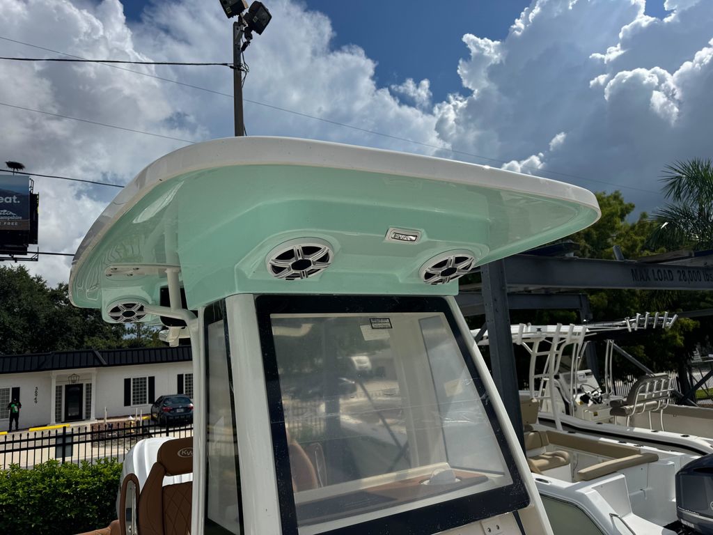 It includes a new sleek hardtop frame with an integrated windshield. Other upgrades include molded-in speaker pods, digital switching, a wireless phone charger, and an improved stereo with RGB lighting. Comfort is boosted with deluxe upholstery, a dual bucket seat leaning post, and a freshwater system. Additional features like a sandbar package, stainless steel rub rails, and the Seakeeper Ride System enhance convenience and usability.