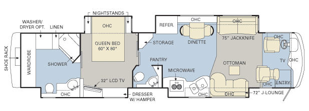 Quad Slide, Rear Bath w/Wardrobe, Washer/Dryer Opt., Linen Cabinet, Vanity & Overhead Cabinet/Stool/32" LCD TV & Dresser w/Hamper Slideout, Queen Bed Slideout w/Nightstands, Corner Storage Cabinet, Refrigerator/Dinette w/Chairs & Jackknife Sofa Slideout, TV & Overhead Storage Above Cab, J-Lounge/Double Kitchen Sink & 2 Burner Range w/Microwave Slideout and Much Much More.