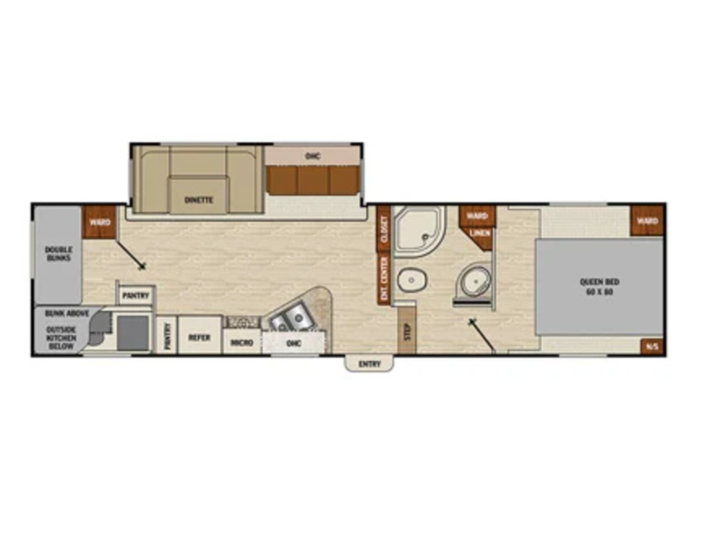 On the opposite side of the room you will find a slide out u-shaped dinette and sofa with overhead storage. Both can be made into additional sleeping space if needed at night. A nearby entertainment center can be easily viewed from any seating in the room. The convenient wardrobe next to the TV is just one of many storage spaces throughout the unit.