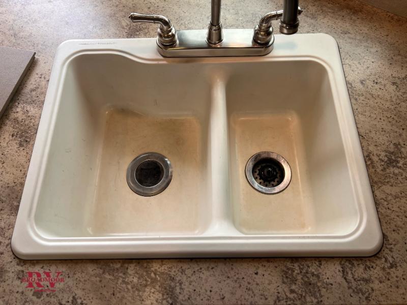 The triple slides provide you with a bit more walking around space inside, and two of those are in the main living area as you step inside the door. Notice the kitchen to your left featuring a convenient island including a plenty of prep space, and a double kitchen sink. A slide out to the left of the door features a refrigerator, a three burner range and microwave oven, plus large residential pantry.