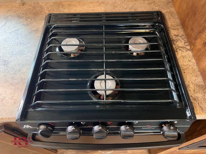 The rear private bunkhouse features two sets of 30" x 74" bunks with a step up wardrobe in between. On the outside beneath the bunks along the curb side enjoy cooking outdoor at the outside kitchen. This will be a big hit with the chef in the family, plus so much more!